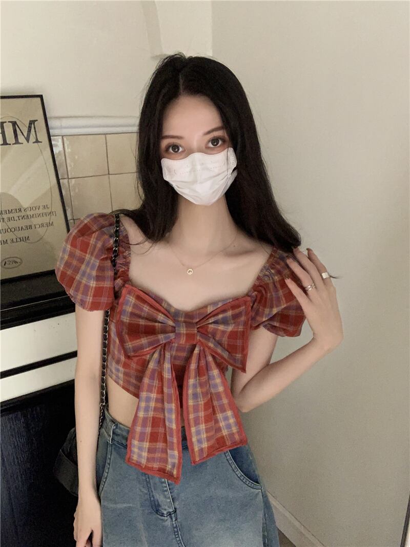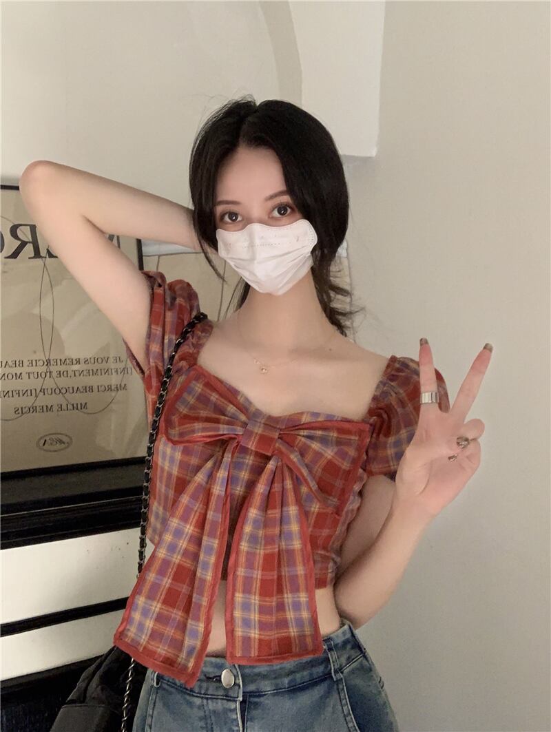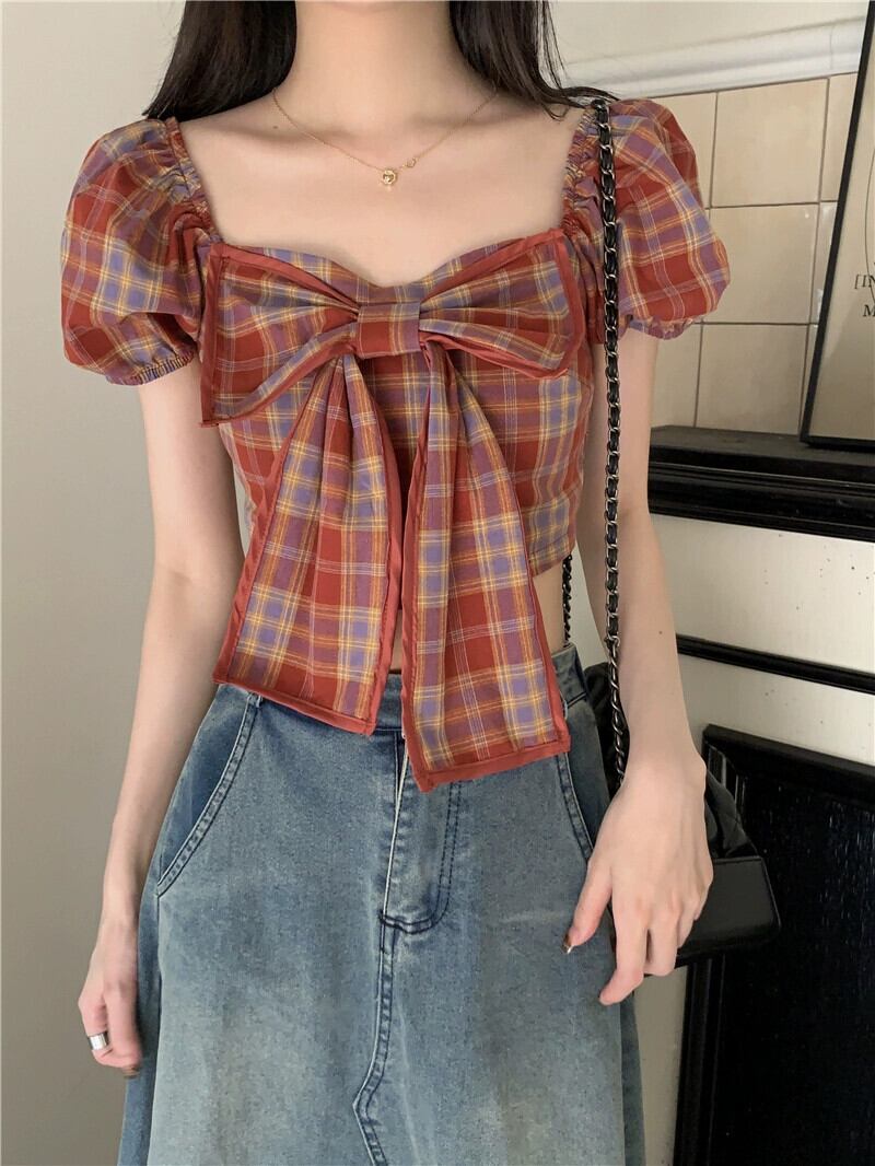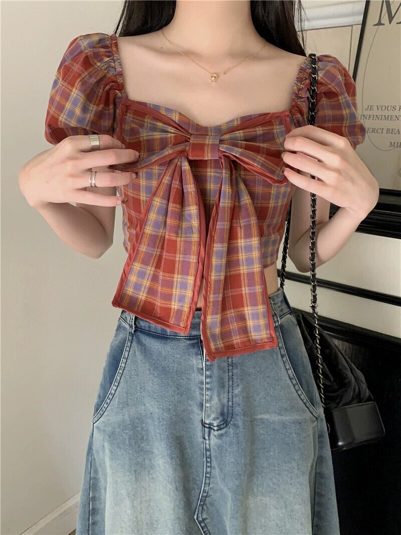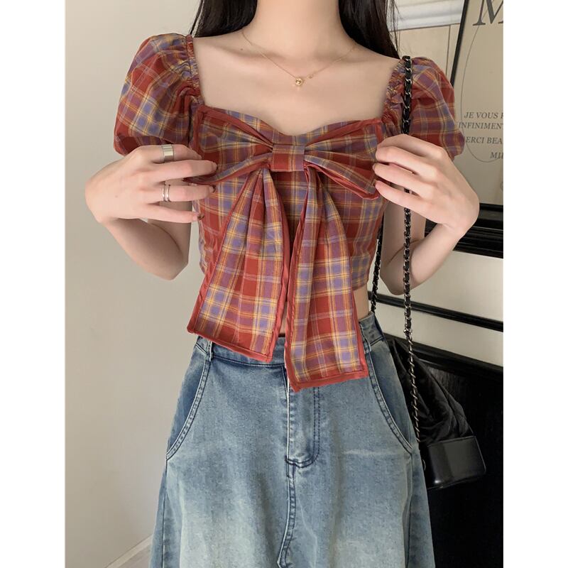 ちょう結びチェック柄半袖シャツレディース夏フレンチレトロデザインセンスニッチハイウエストショートスクエアカラートップ ハイウェスト サマー 夏物 スクウェア 7460026551885385 | framboise21