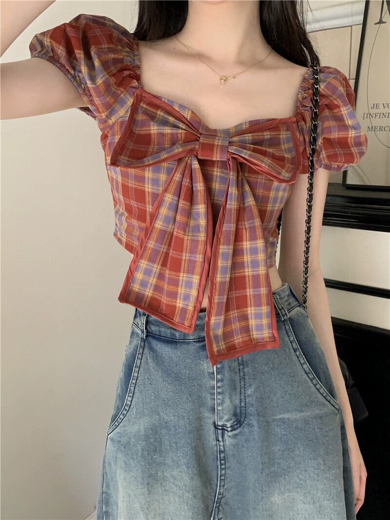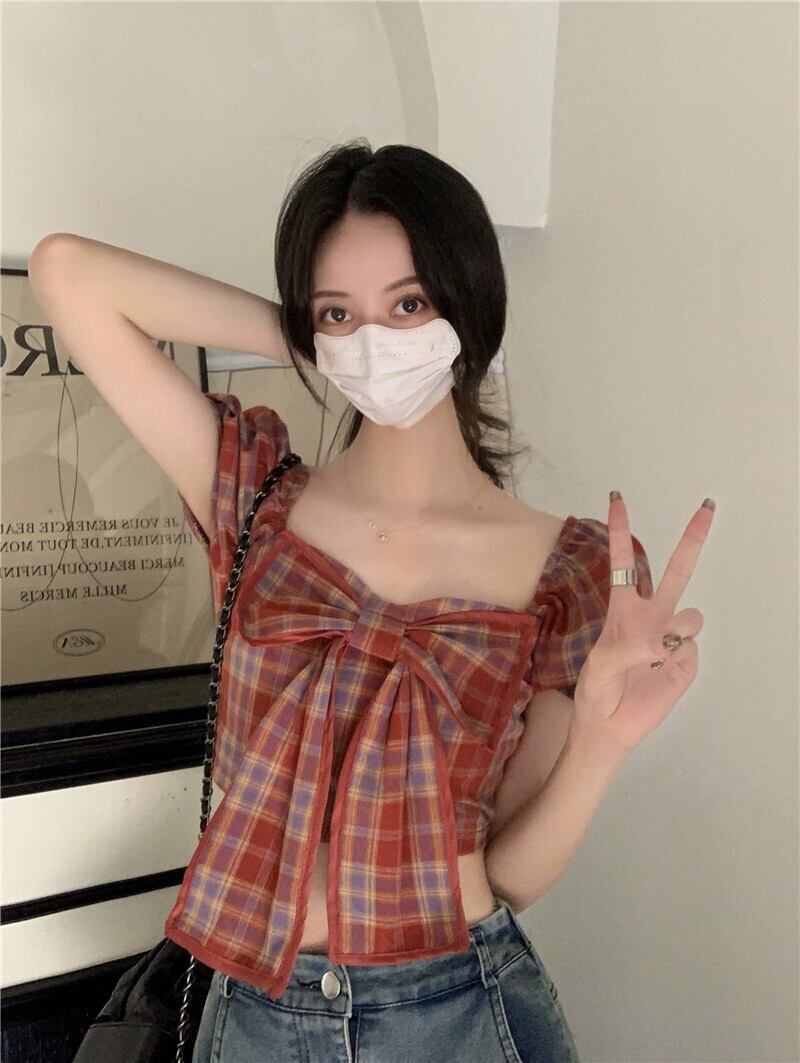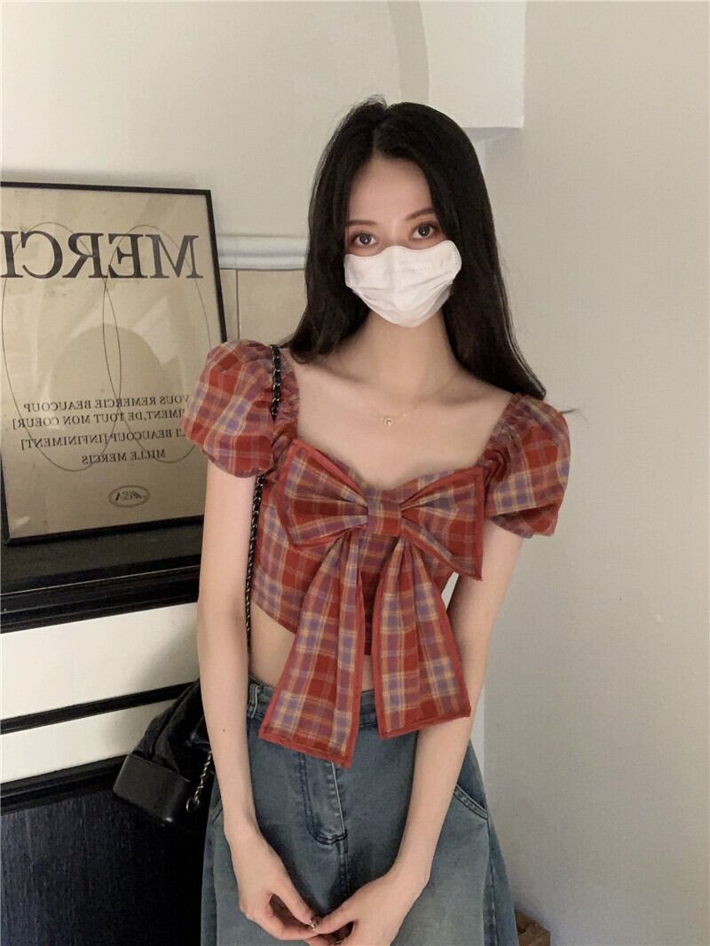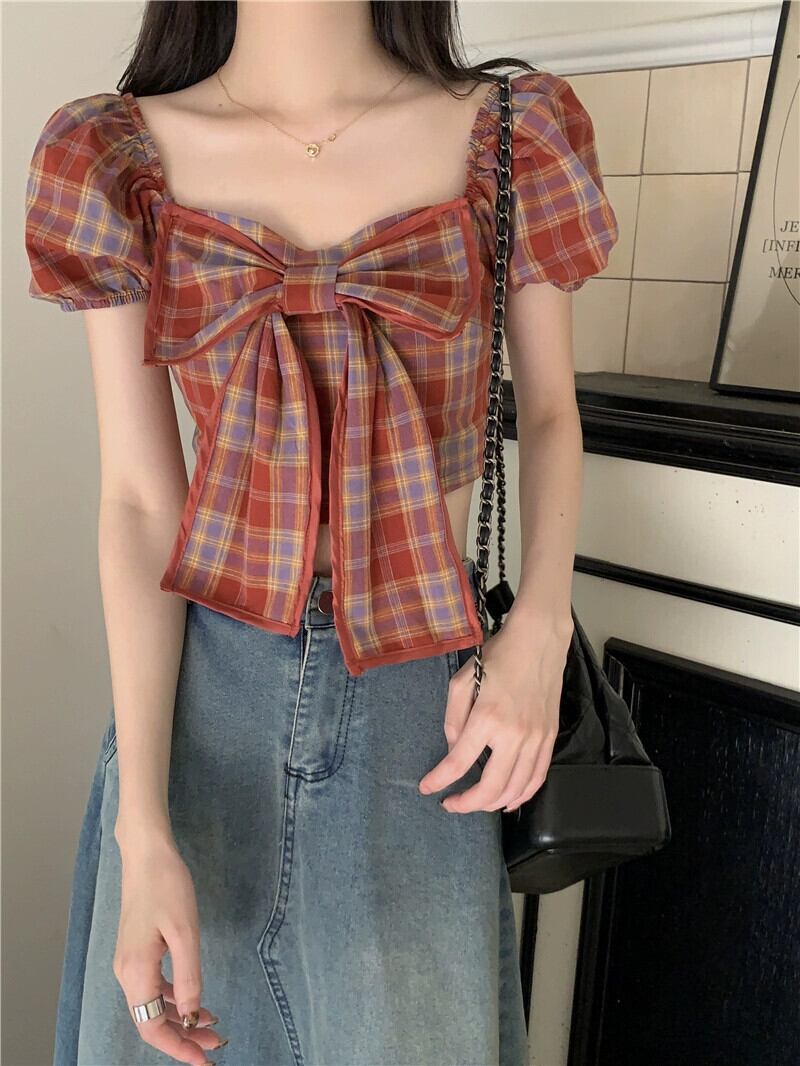 ちょう結びチェック柄半袖シャツレディース夏フレンチレトロデザインセンスニッチハイウエストショートスクエアカラートップ ハイウェスト サマー 夏物 スクウェア 7460026551885385 | framboise21