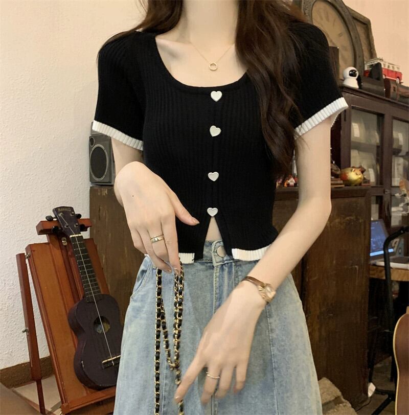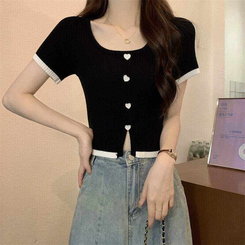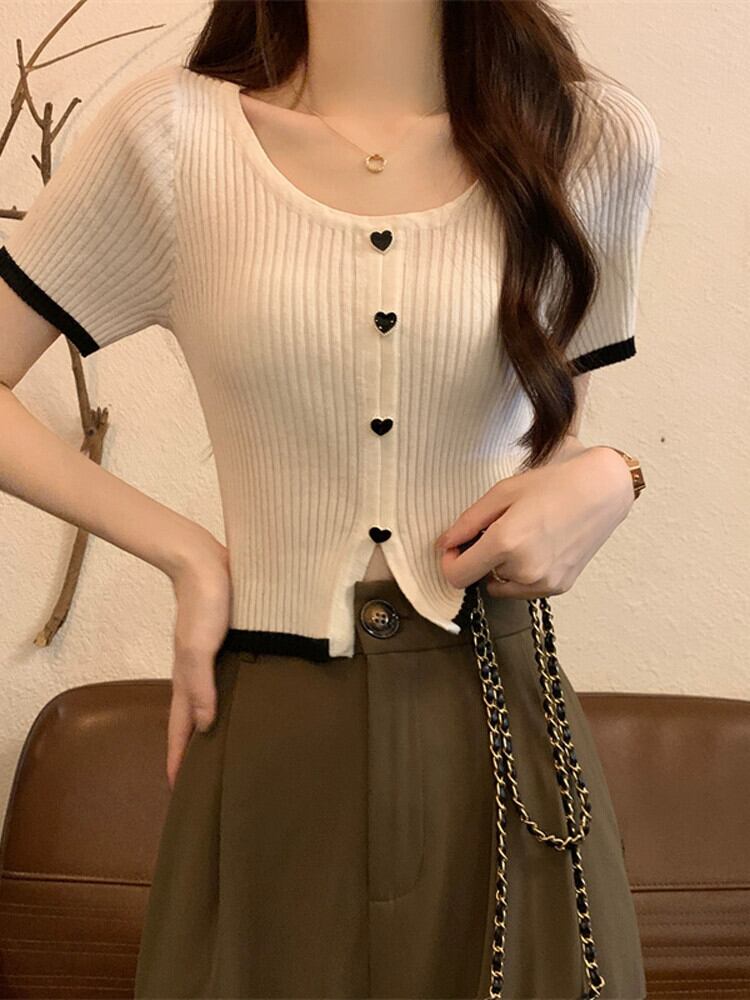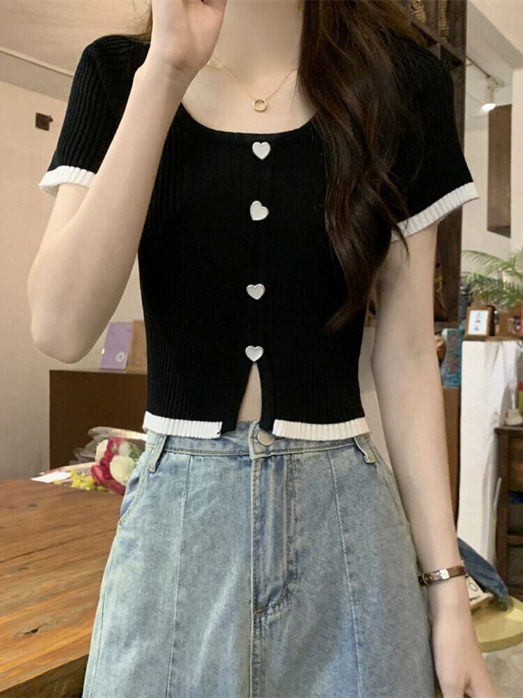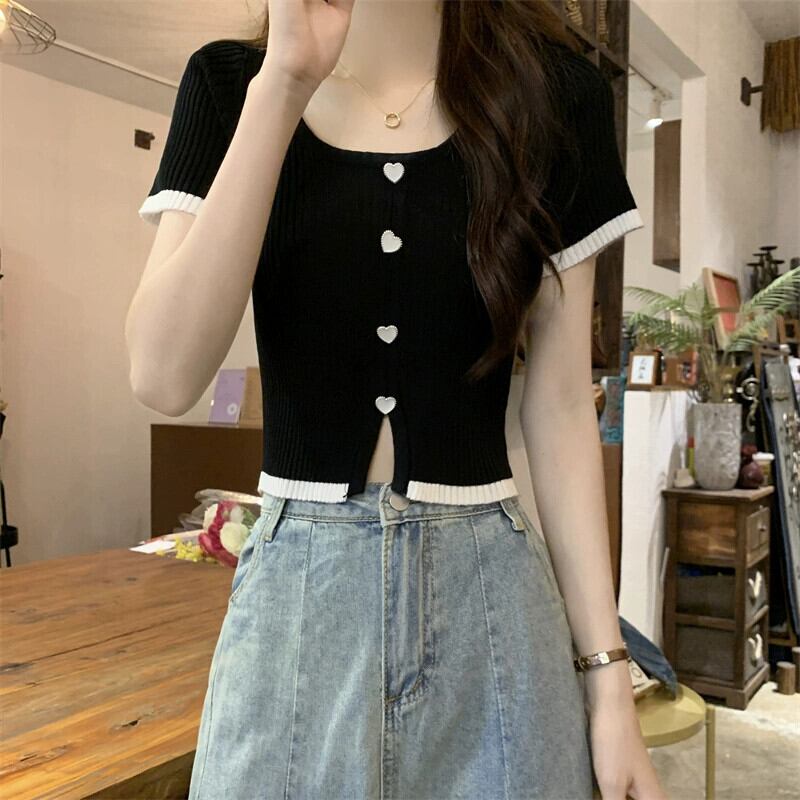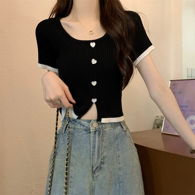 フロントショルダーニット半袖Tシャツレディース夏スモールフレグランスファッションスリムフィットウエスタンスタイル裾スリットハイウエストショートトップ ハイウェスト サマー 夏物 746007319749310 | framboise21