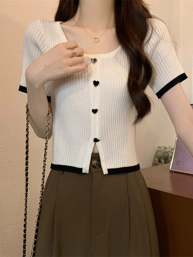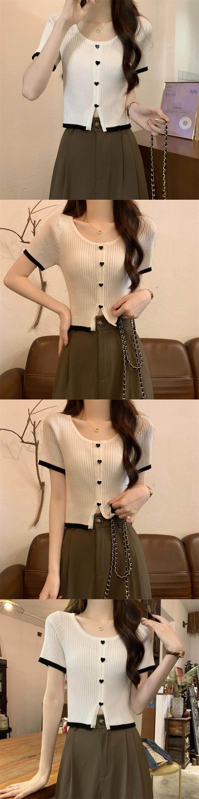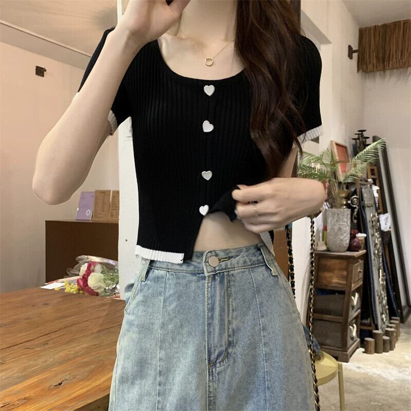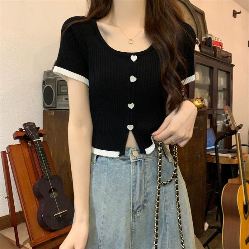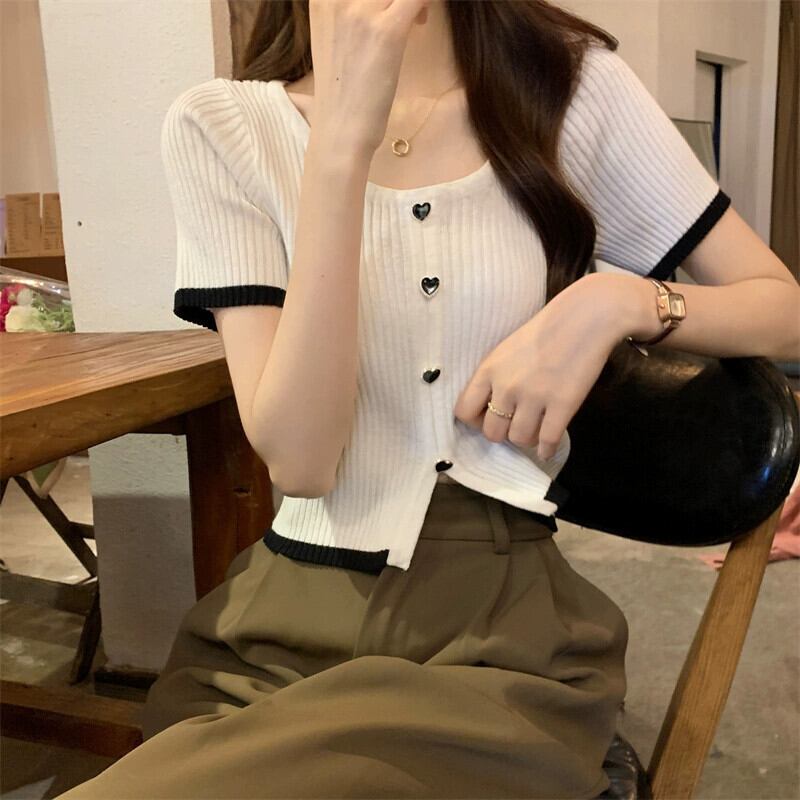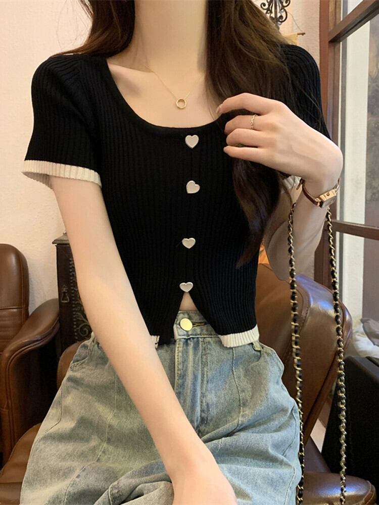 フロントショルダーニット半袖Tシャツレディース夏スモールフレグランスファッションスリムフィットウエスタンスタイル裾スリットハイウエストショートトップ ハイウェスト サマー 夏物 746007319749310 | framboise21