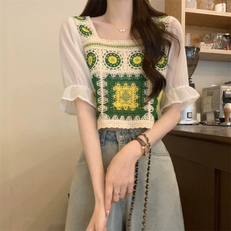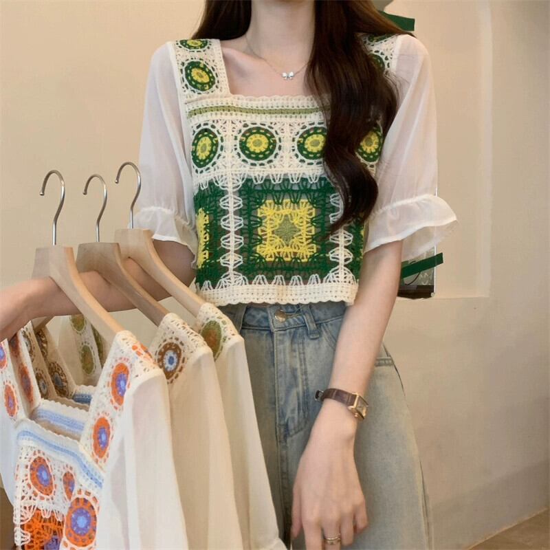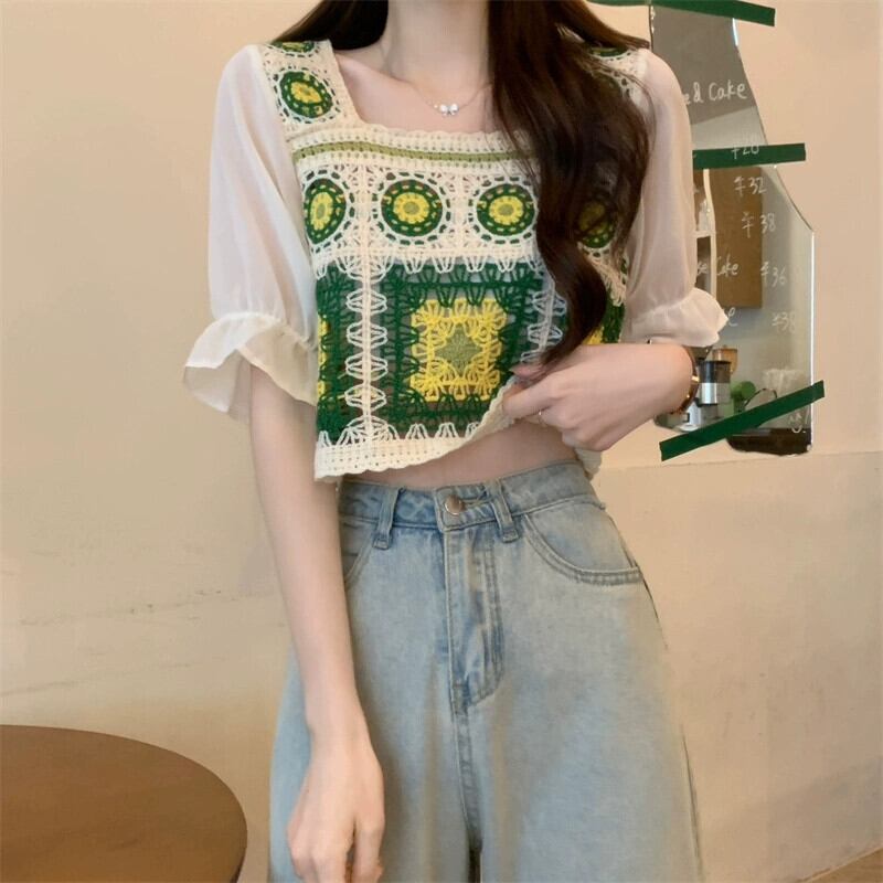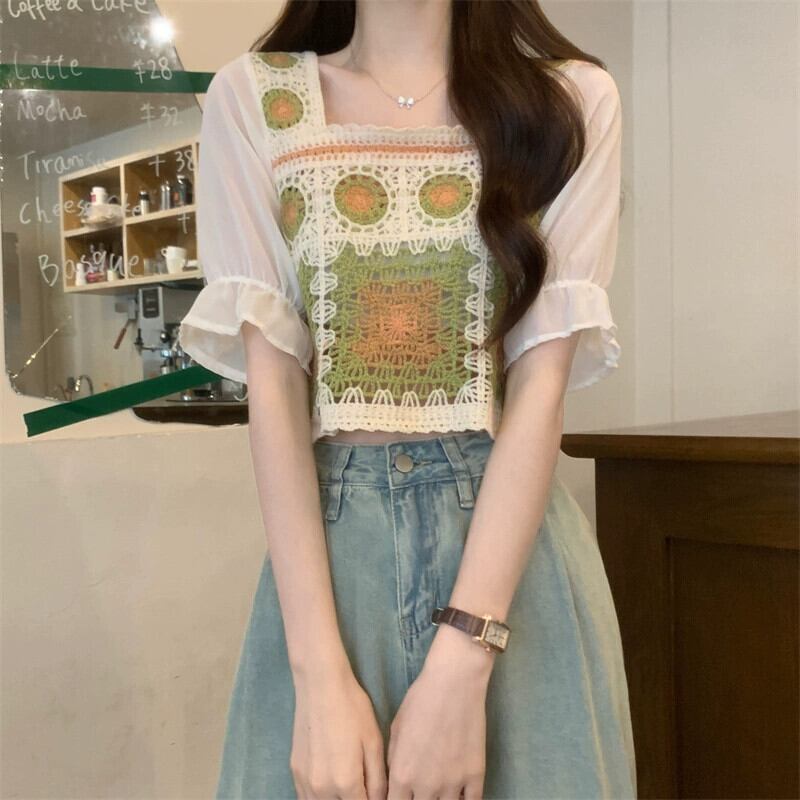 チェーンリンクフラワー中空半袖シャツレディース夏デザインセンスニッチシックショートスプライシングシフォンパフスリーブトップトレンディ サマー 夏物 フラワーデザイン 7460036166387580 | framboise21