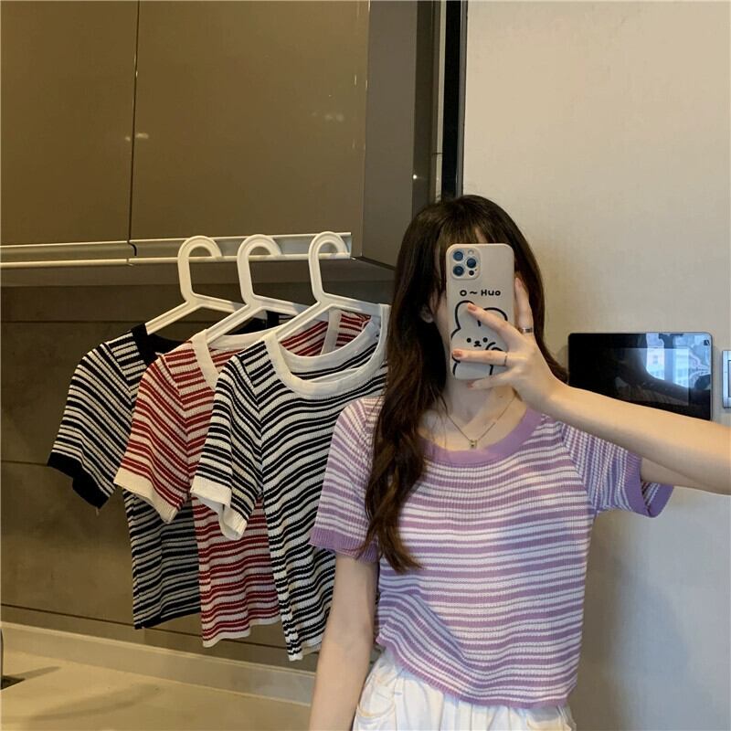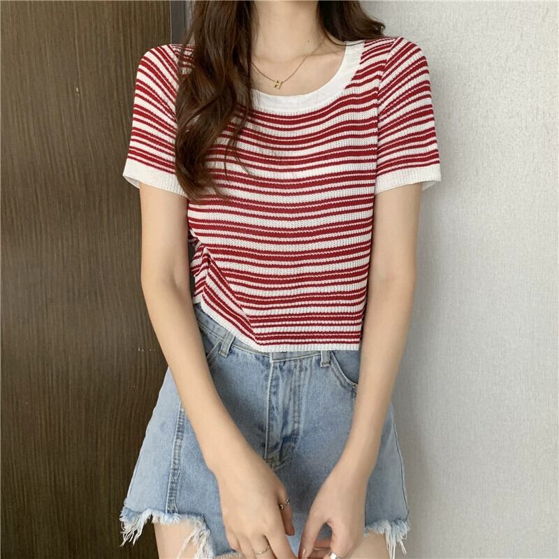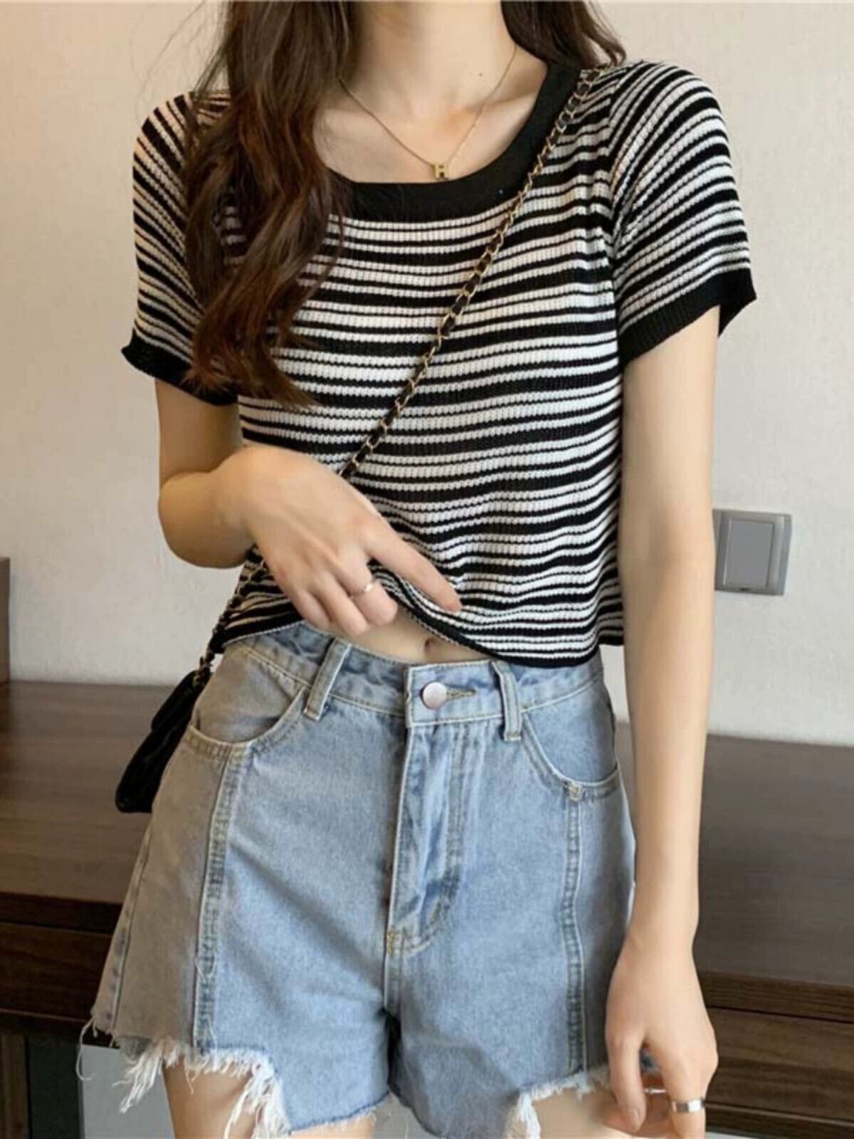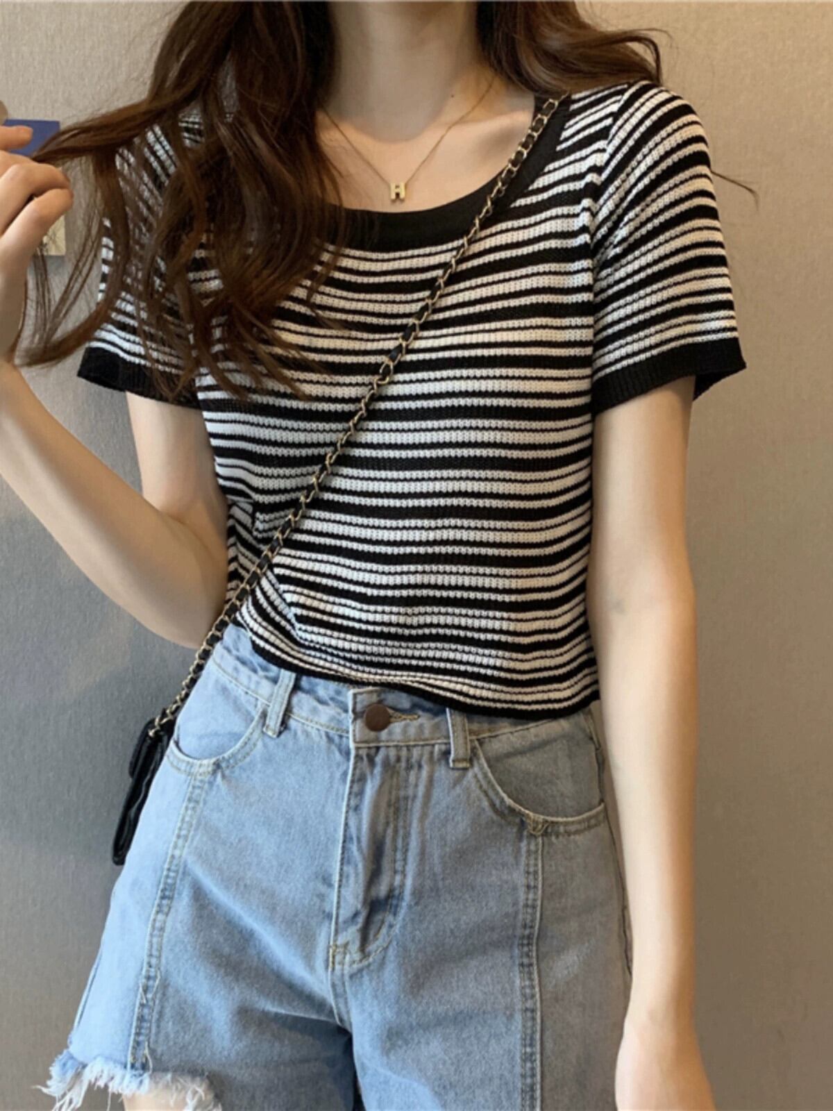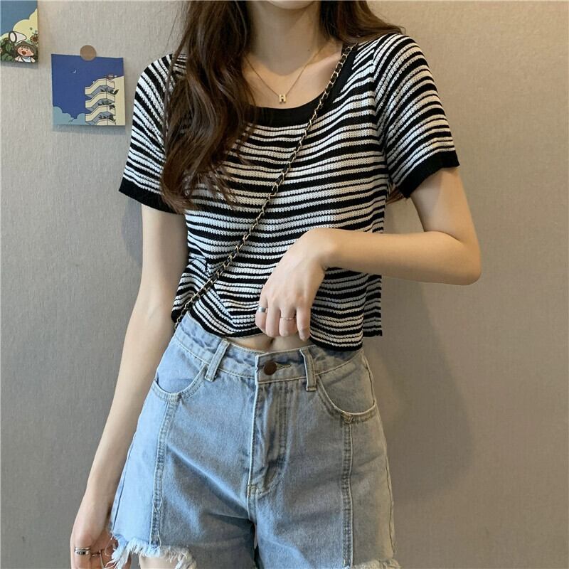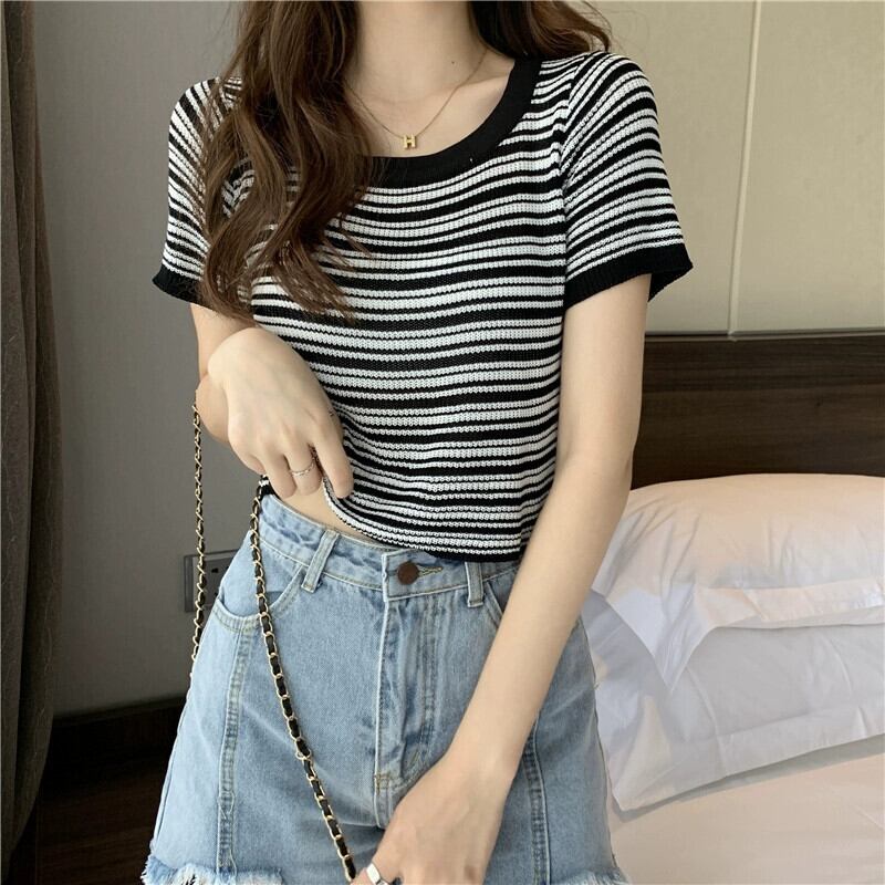 黒と白のストライプのニット半袖 T シャツの女性の夏自己修養デザインセンス小背の高いウエスト露出へそショート アイス シルク トップ ホワイト ブラック サマー 夏物 Tシャツ 7460029851295560 | framboise21