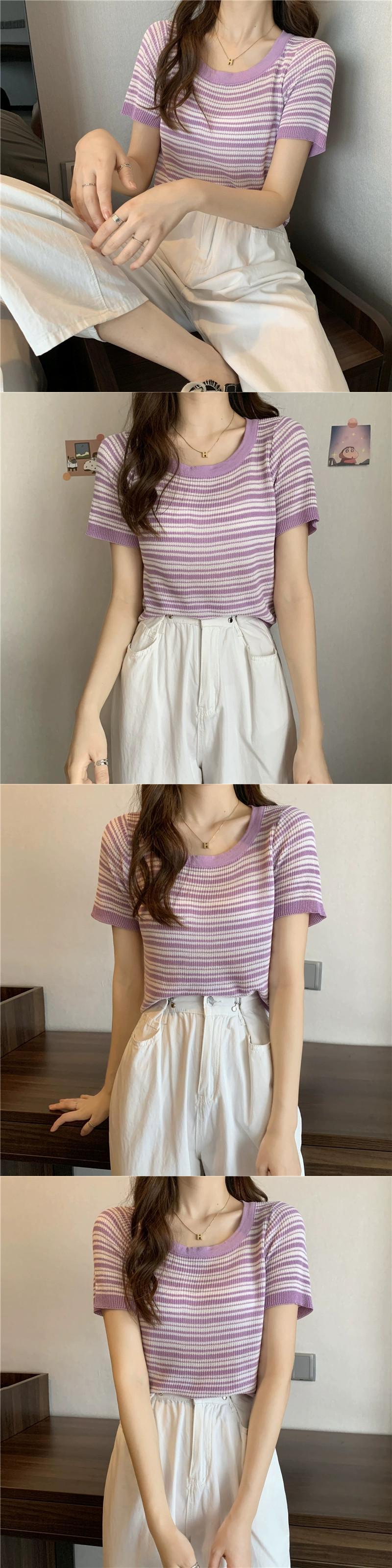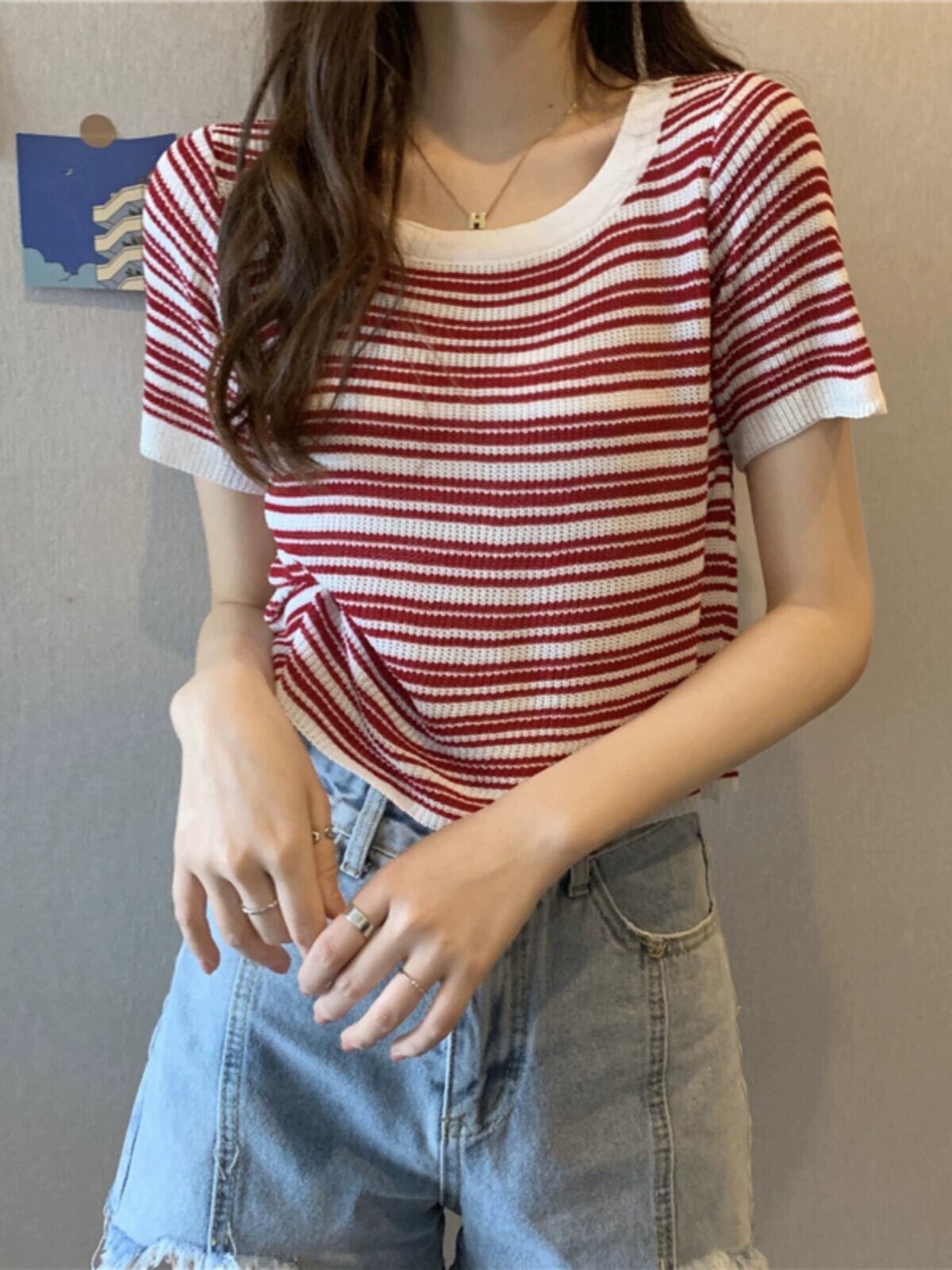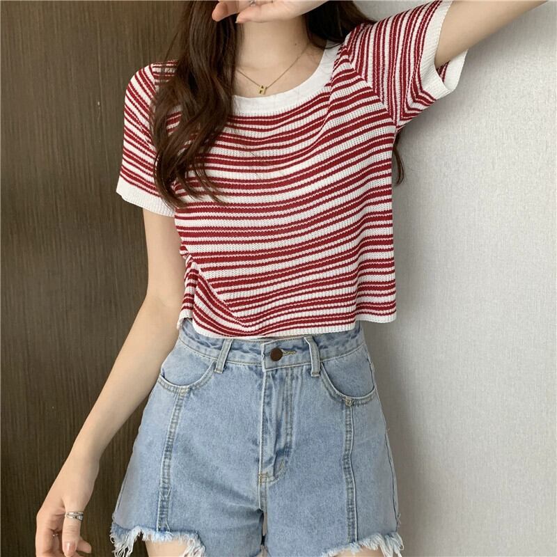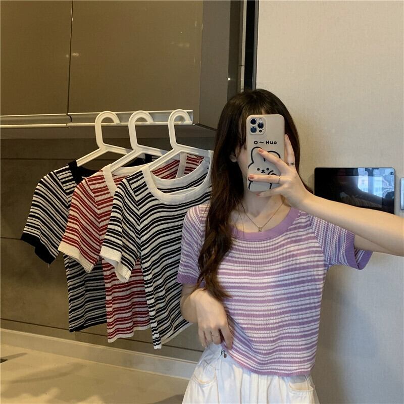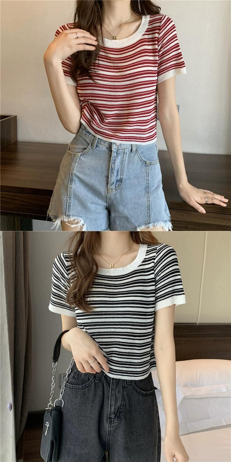 黒と白のストライプのニット半袖 T シャツの女性の夏自己修養デザインセンス小背の高いウエスト露出へそショート アイス シルク トップ ホワイト ブラック サマー 夏物 Tシャツ 7460029851295560 | framboise21