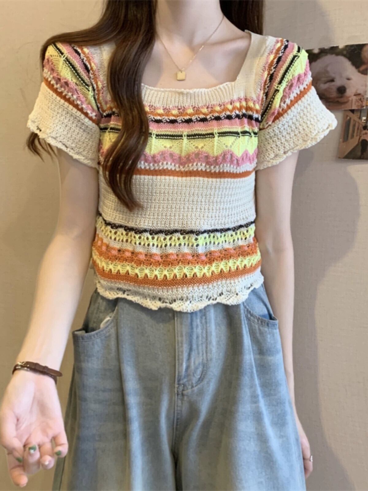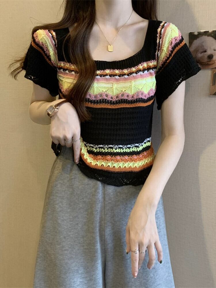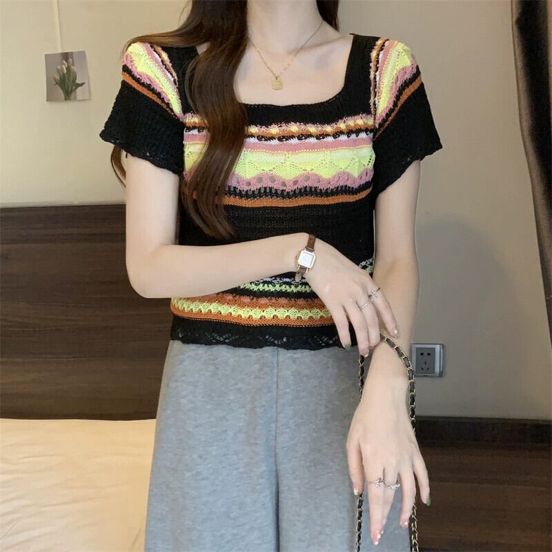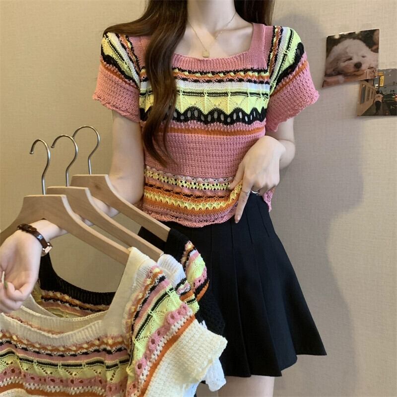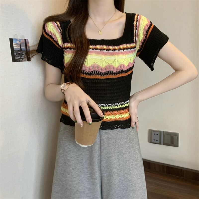 レインボーストライプニット半袖Tシャツレディース夏レトロデザイン自己修養の感覚と薄いショートスクエアカラーアイスシルクトップ薄い サマー 夏物 スクウェア 7460025273554262 | framboise21