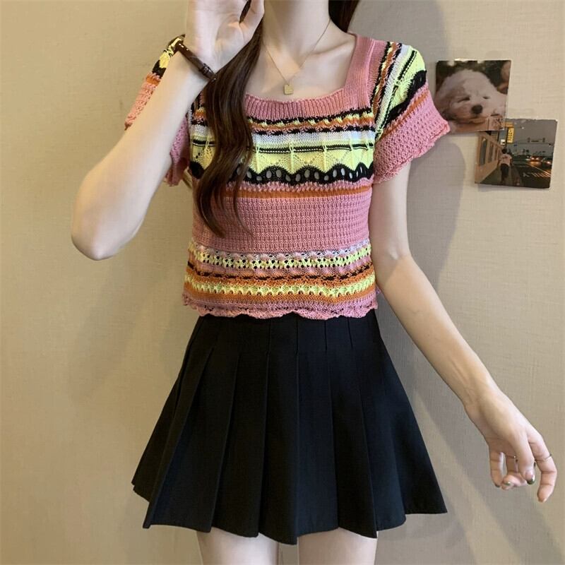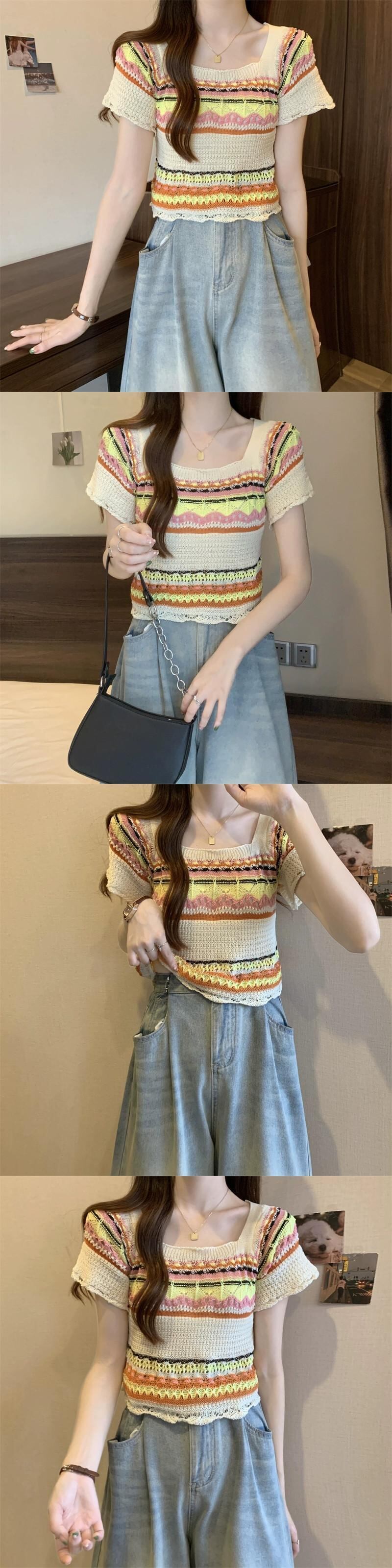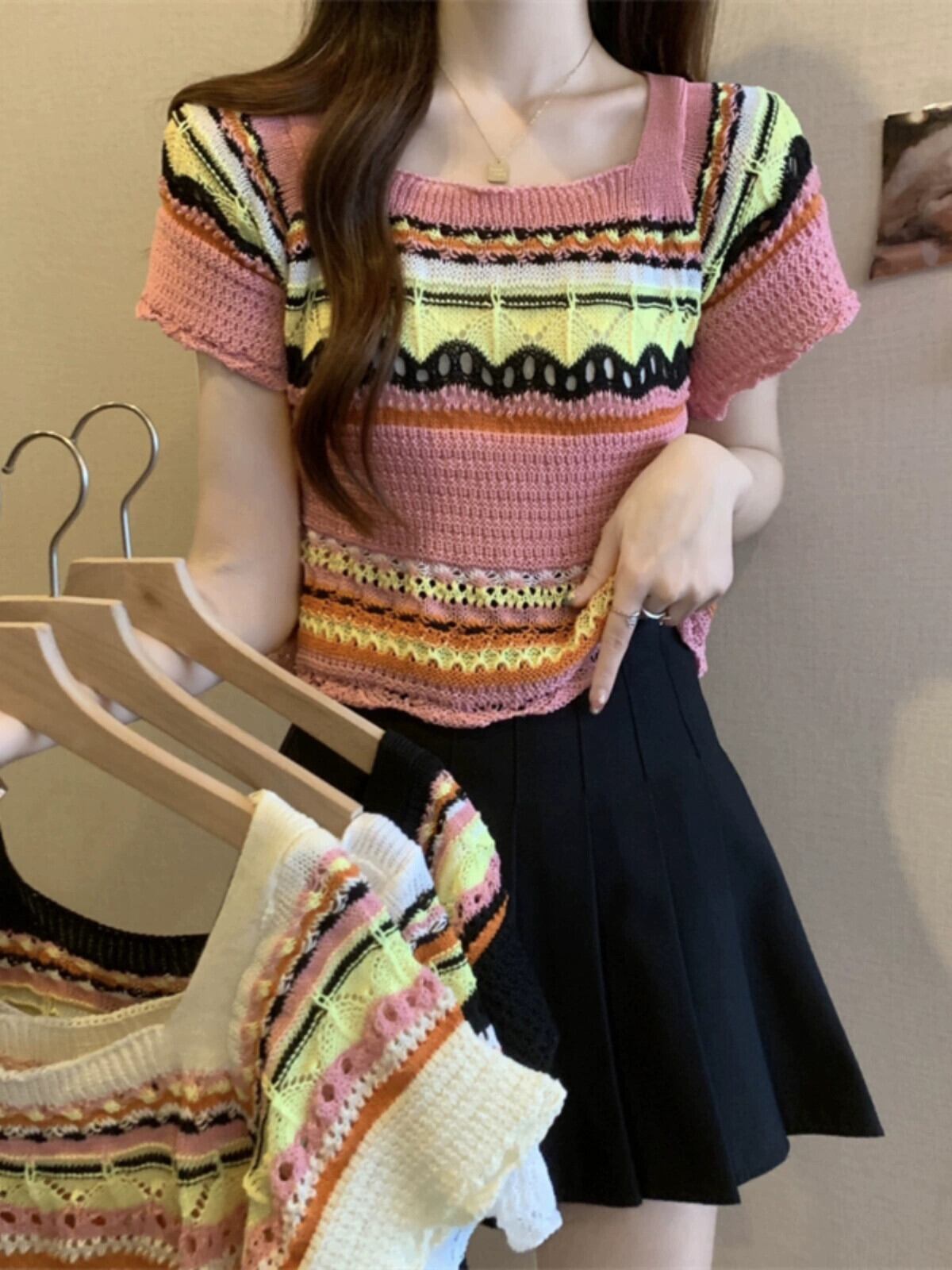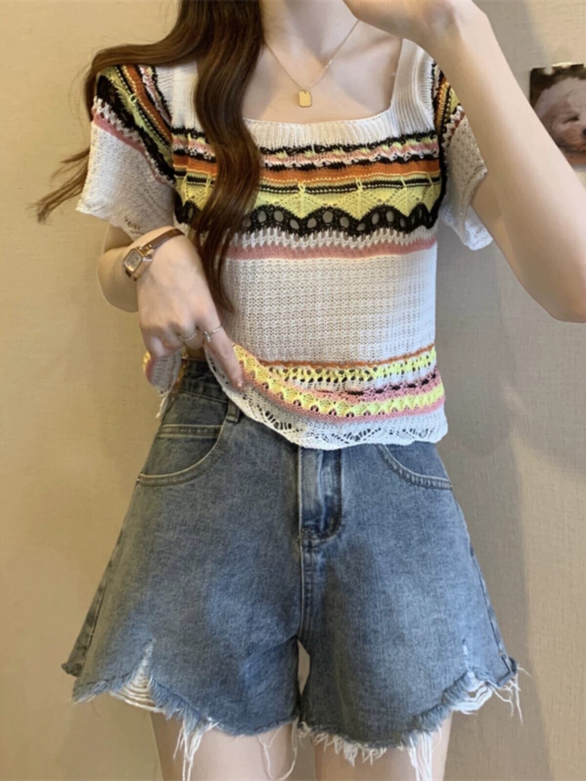 レインボーストライプニット半袖Tシャツレディース夏レトロデザイン自己修養の感覚と薄いショートスクエアカラーアイスシルクトップ薄い サマー 夏物 スクウェア 7460025273554262 | framboise21