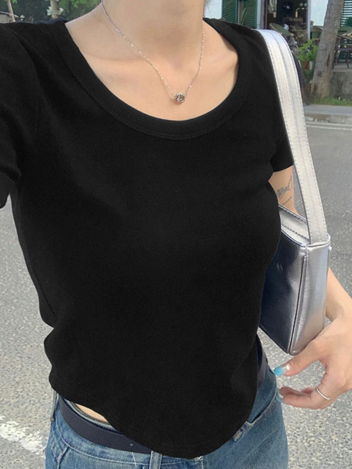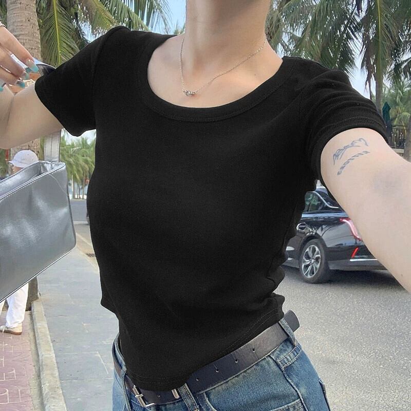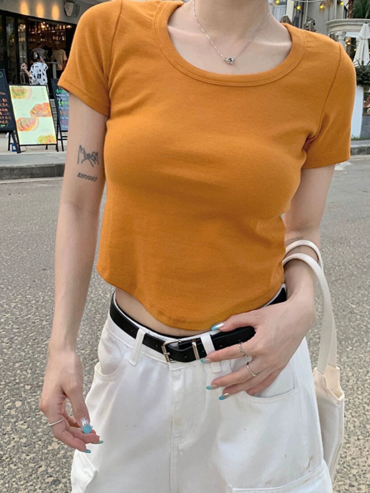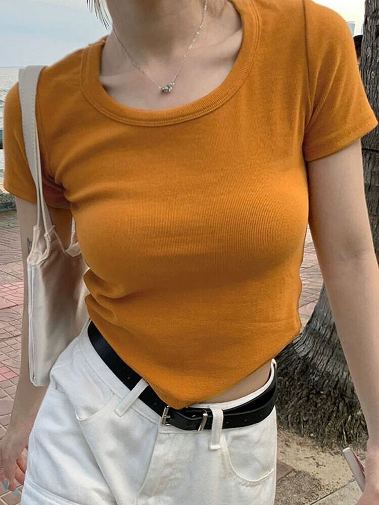 オレンジフロントショルダー半袖Tシャツレディース2023夏新作小男スリムスリムオールマッチベーシックラウンドネックトップ サマー 夏物 Oネック 7460010612159210 | framboise21