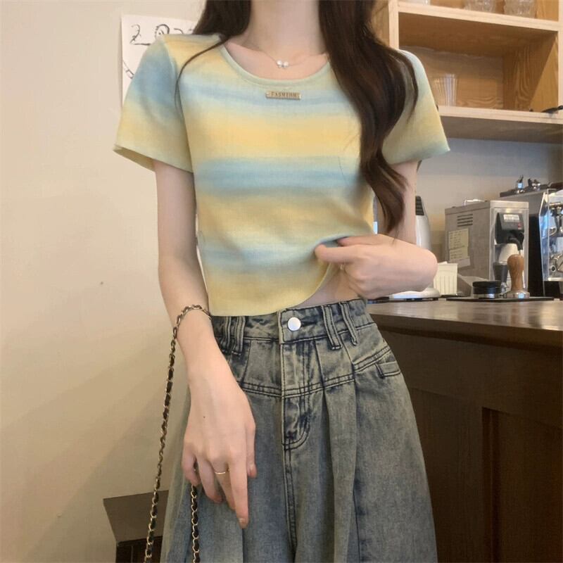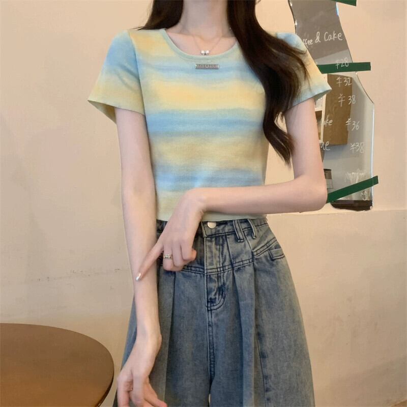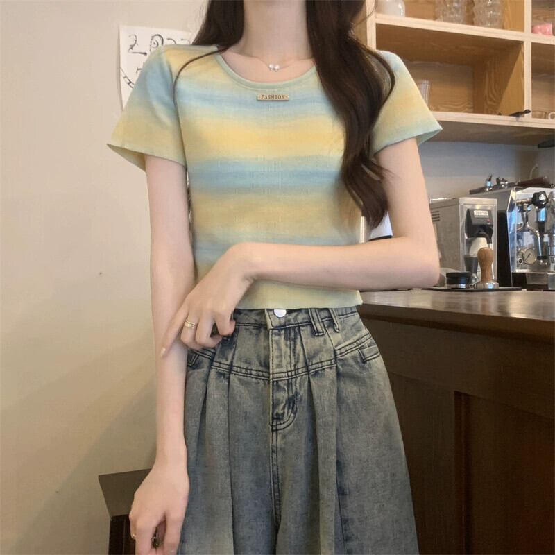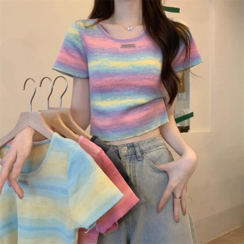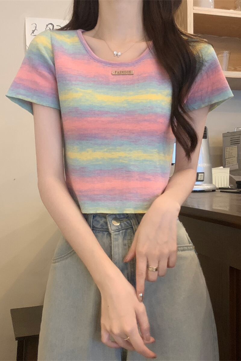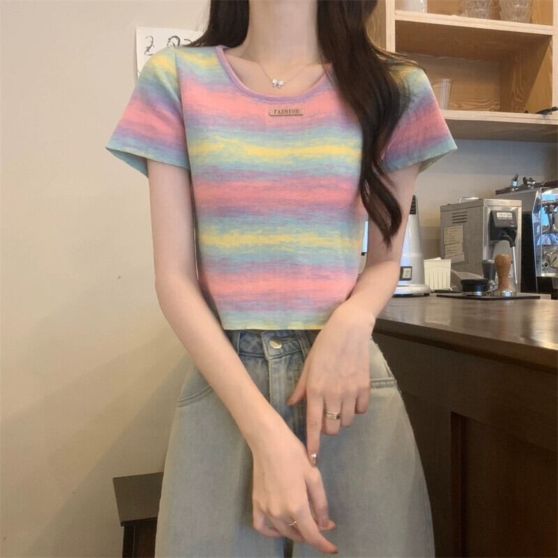 レインボーストライプニット半袖Tシャツレディース夏フレンチレトロデザインセンスショートセクションへそラウンドネックトップ サマー 夏物 Oネック 7460010088061027 | framboise21