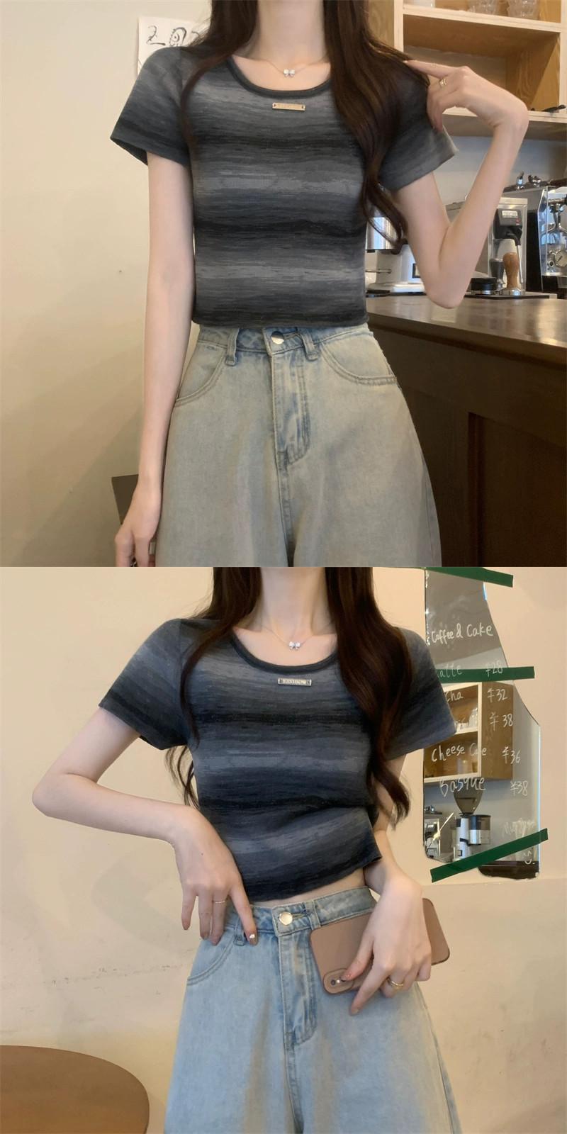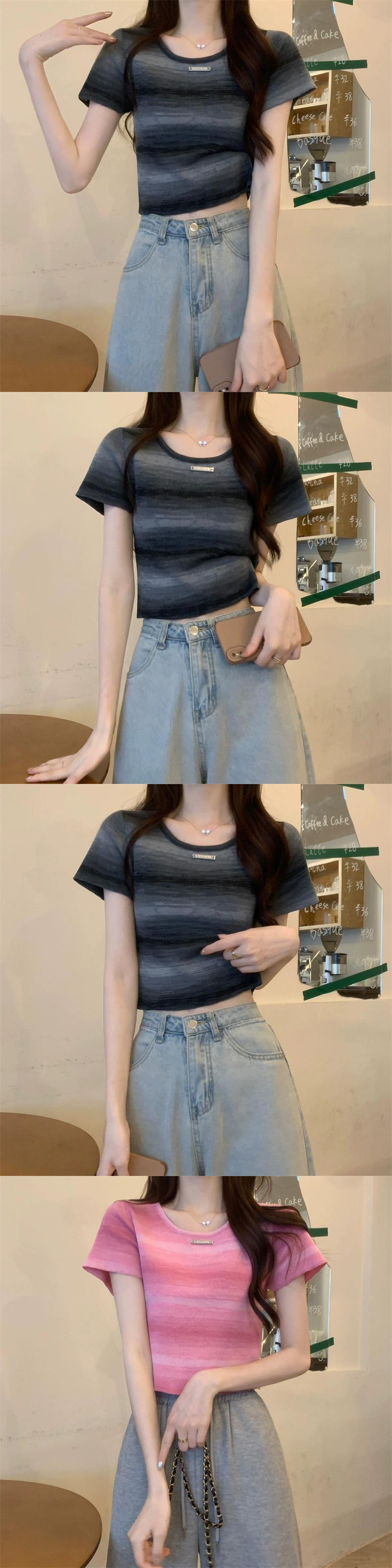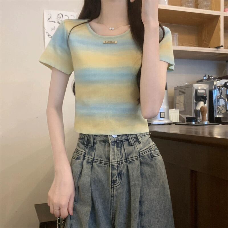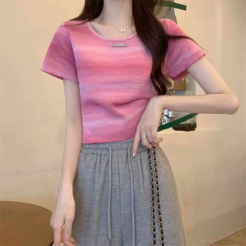レインボーストライプニット半袖Tシャツレディース夏フレンチレトロデザインセンスショートセクションへそラウンドネックトップ サマー 夏物 Oネック 7460010088061027 | framboise21