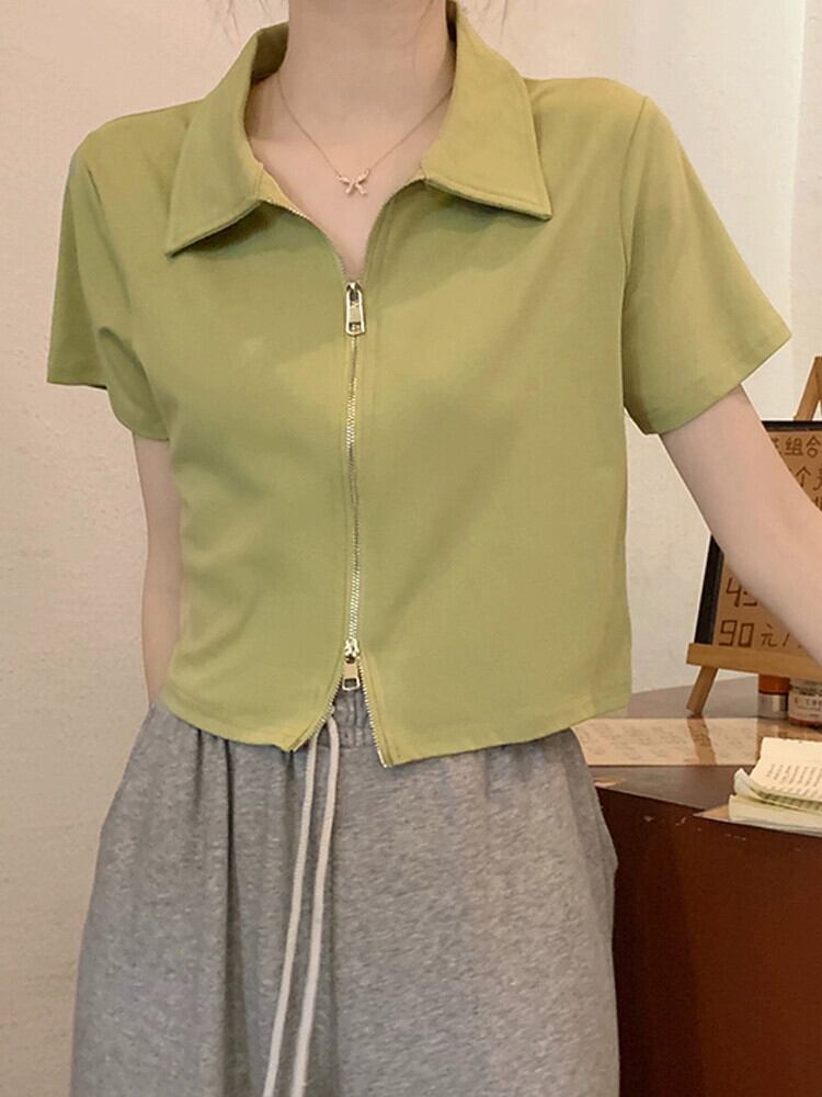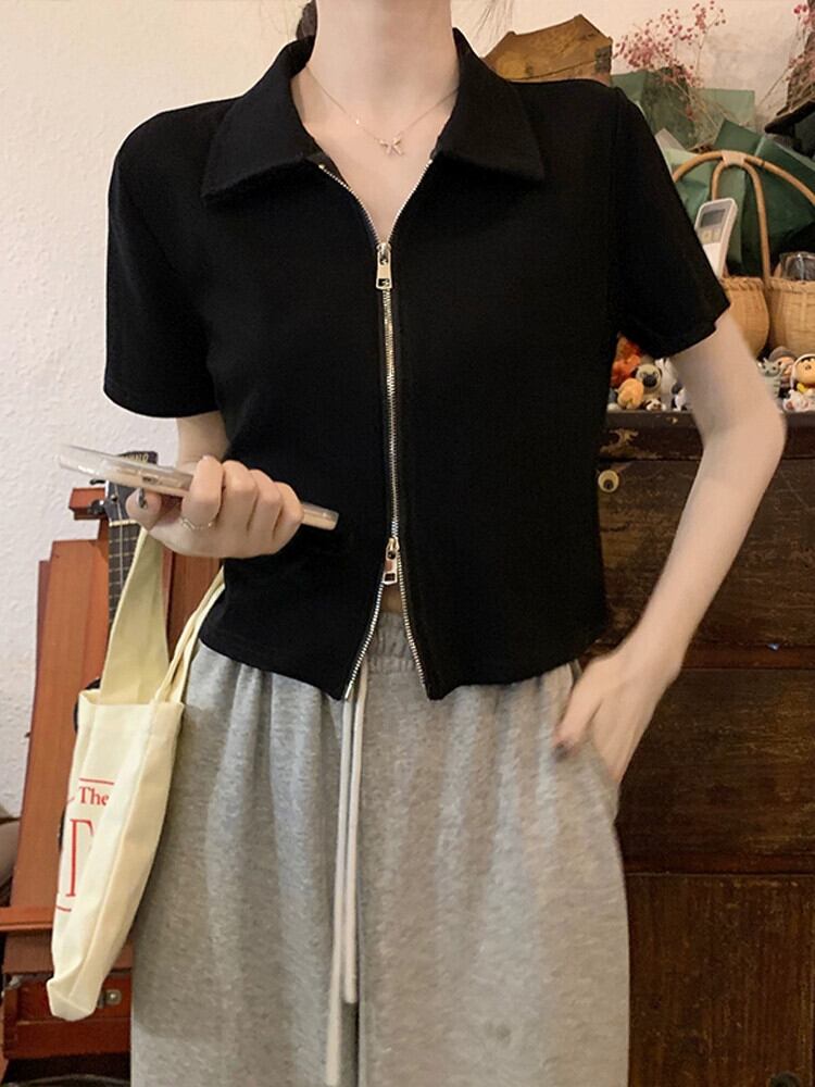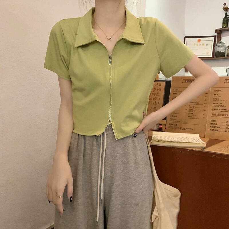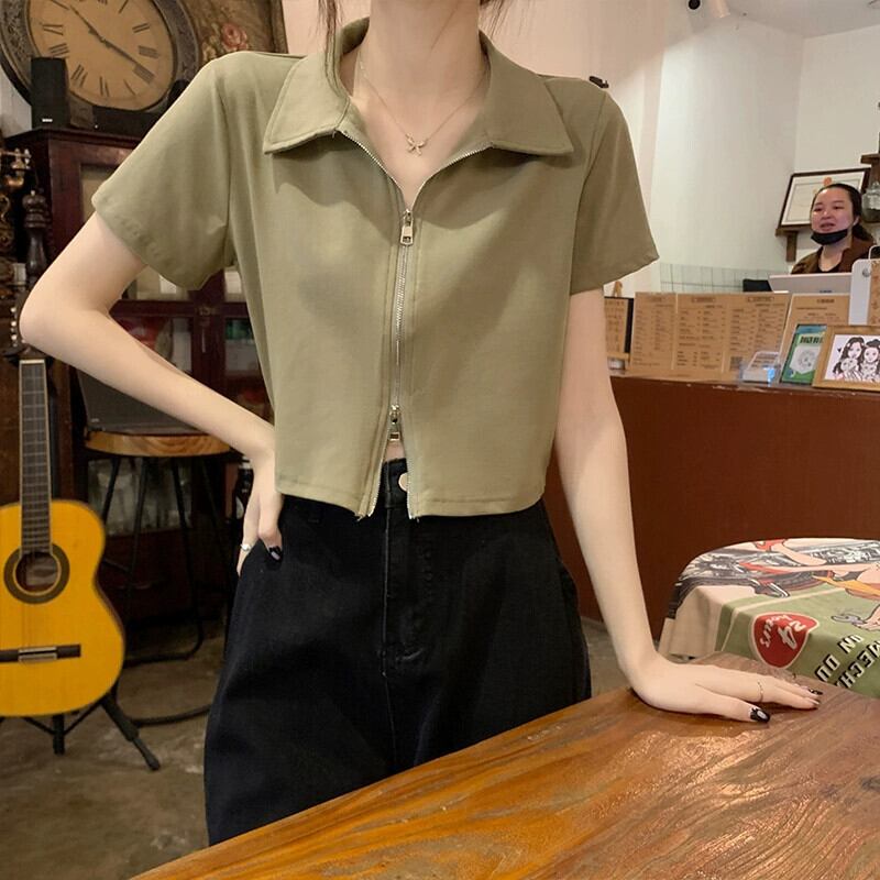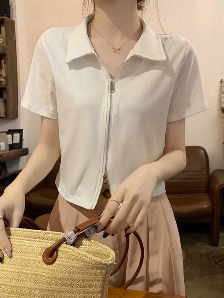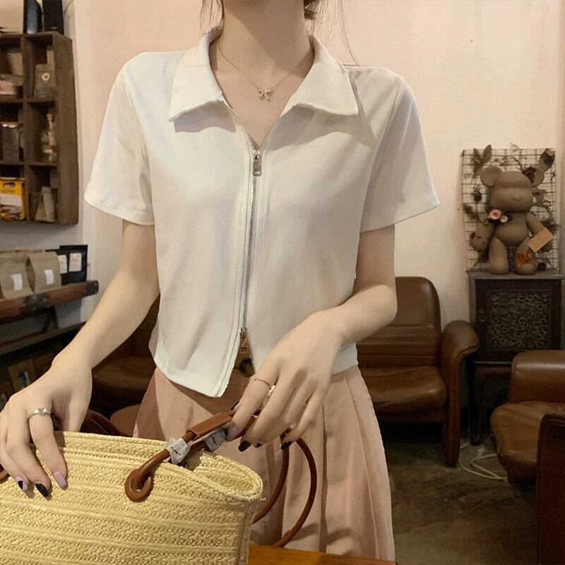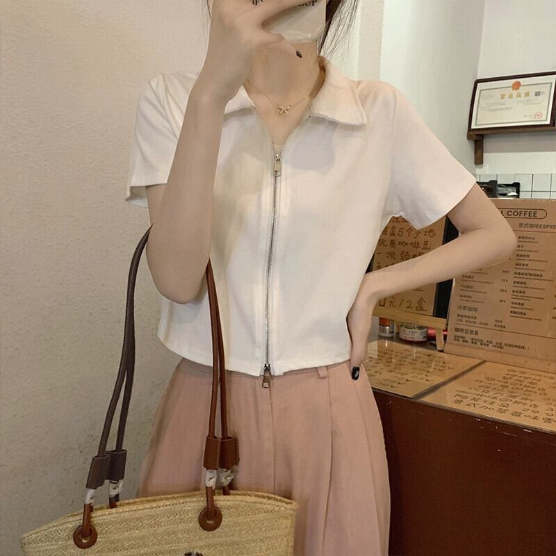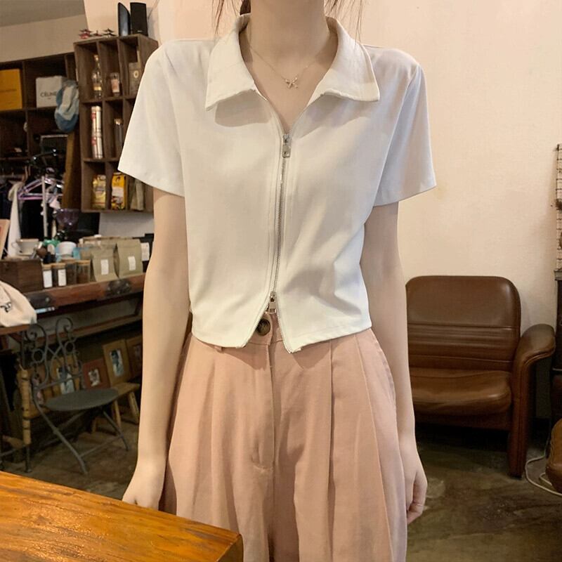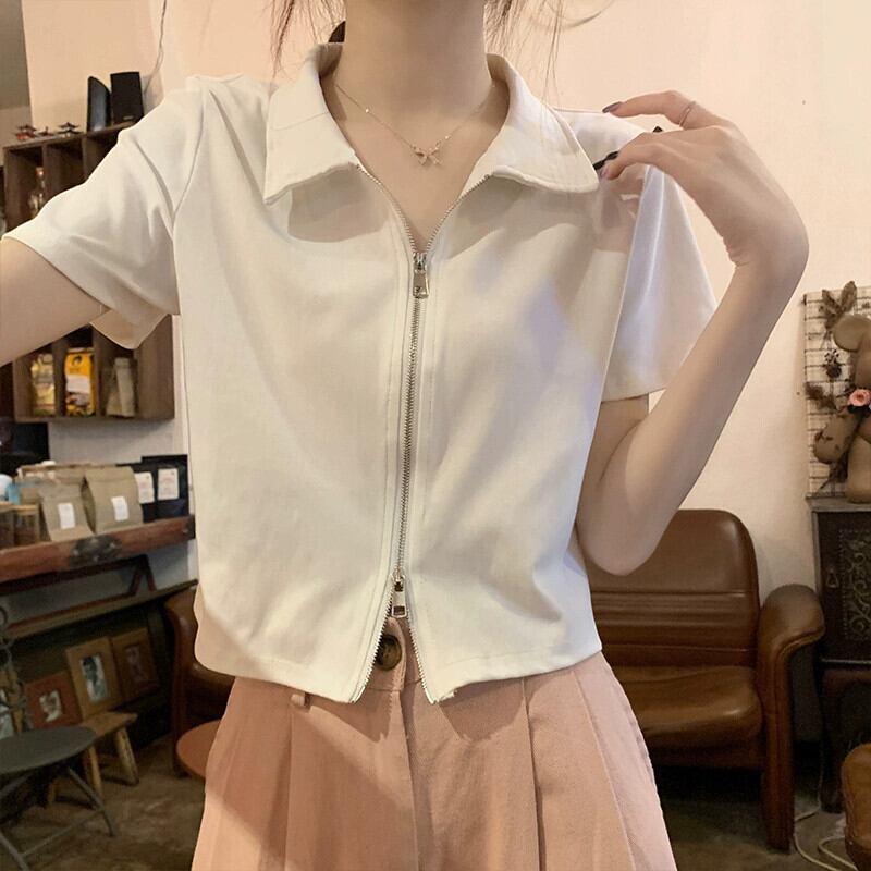 ダブルジッパー半袖 Tシャツレディース夏ルーズホワイトポロシャツデザインショルダースリムハイウエストショートトップ ハイウェスト サマー 夏物 7460044407565704 | framboise21