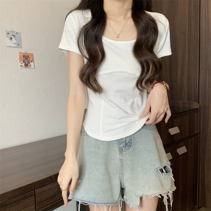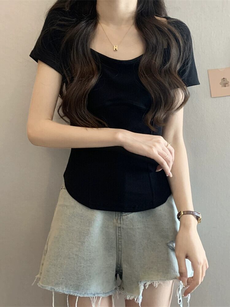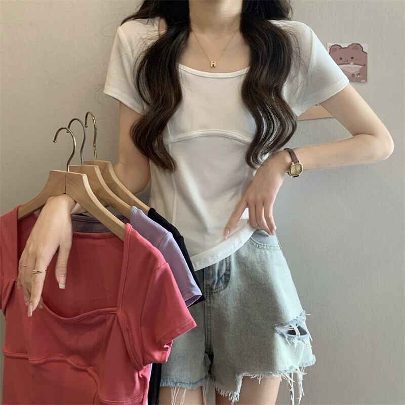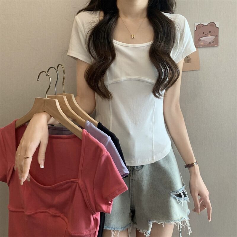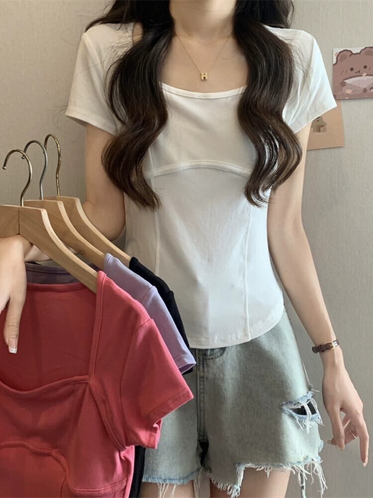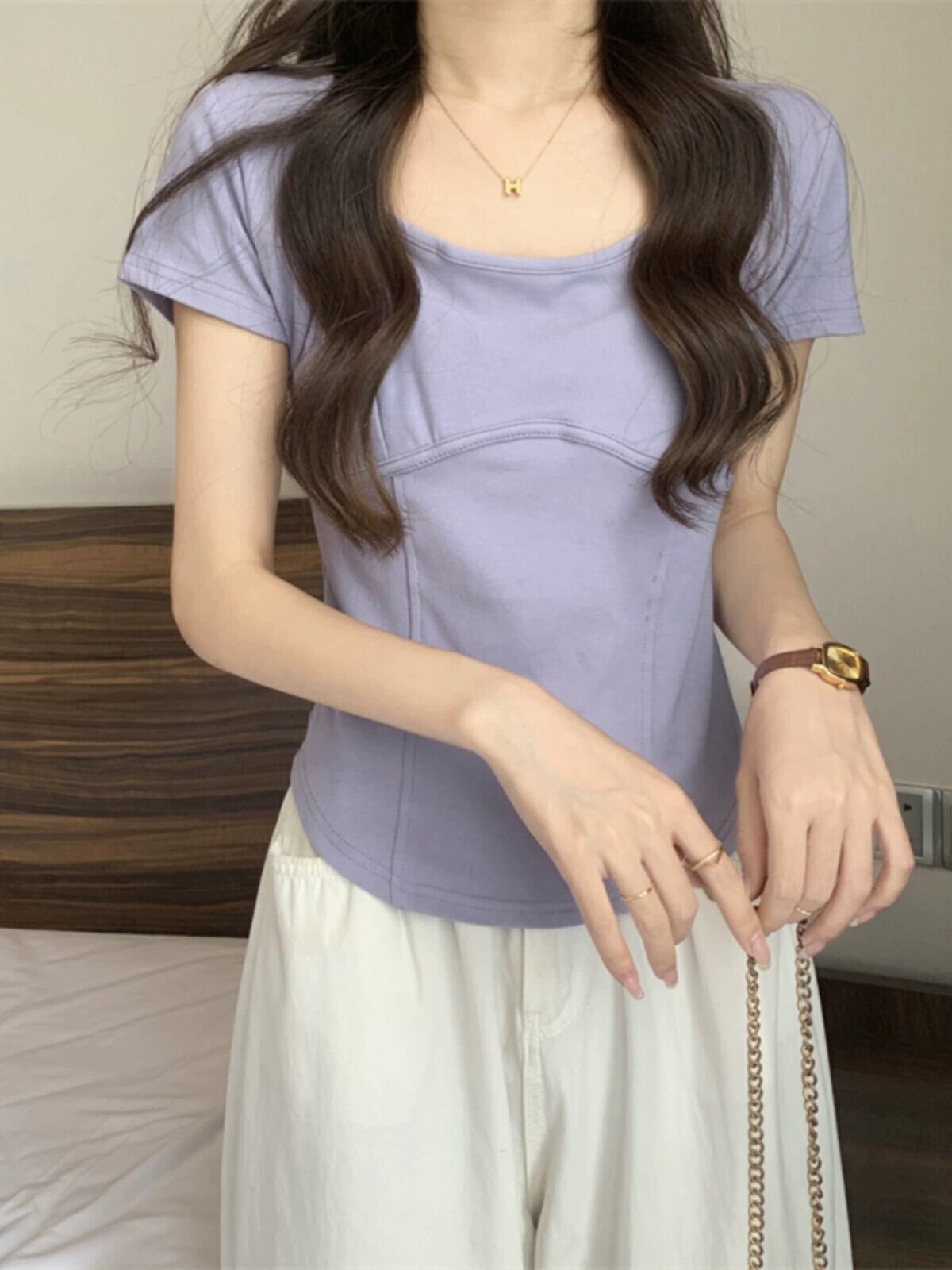 ピュアコットンラウンドネック半袖Tシャツレディース夏シックスリムデザインセンスニッチ不規則なショートフィッシュボーントップパープル サマー 夏物 Oネック 7460072537768877 | framboise21