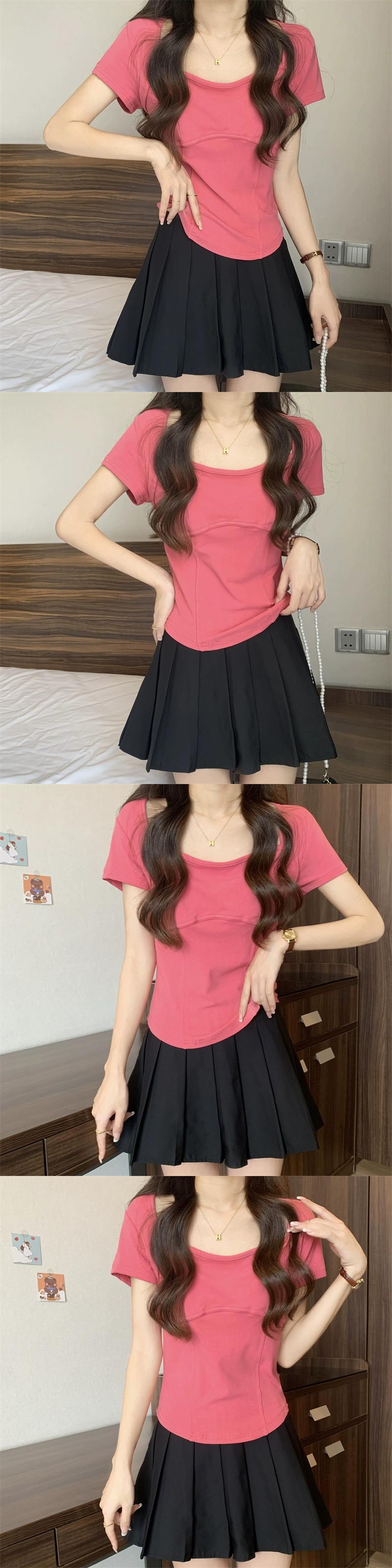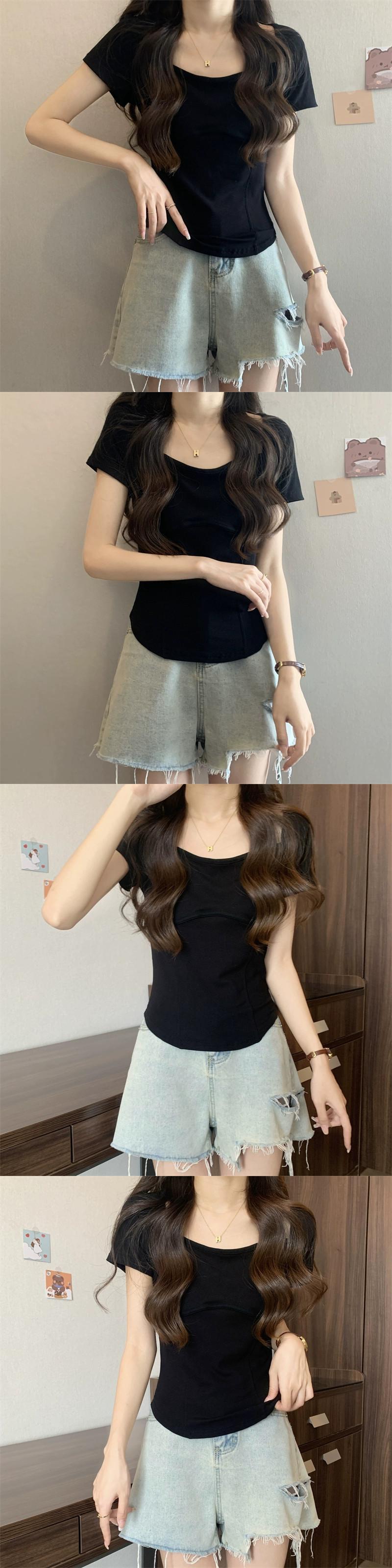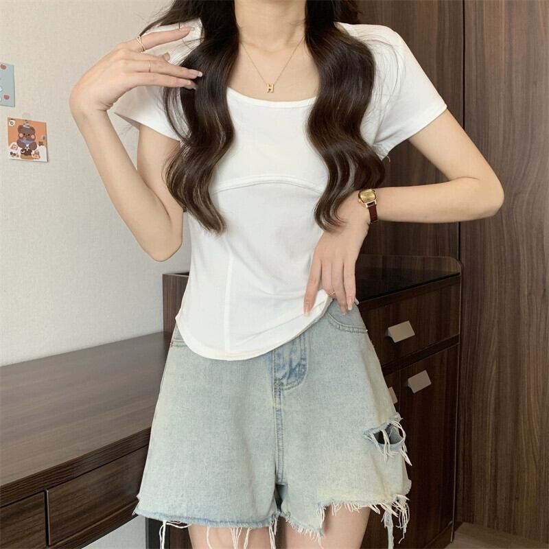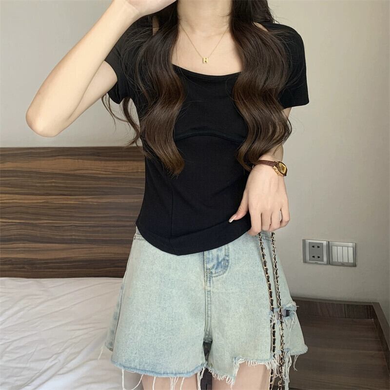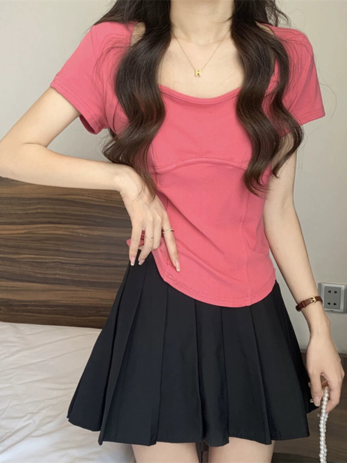 ピュアコットンラウンドネック半袖Tシャツレディース夏シックスリムデザインセンスニッチ不規則なショートフィッシュボーントップパープル サマー 夏物 Oネック 7460072537768877 | framboise21
