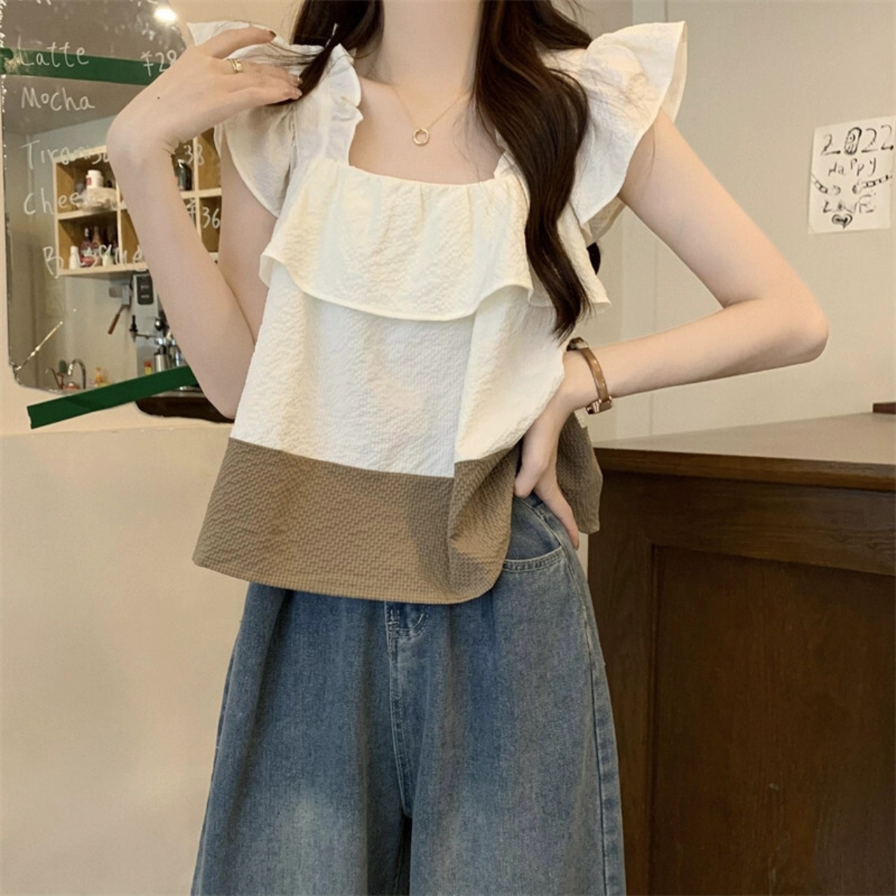 ノースリーブシャツレディース夏フレンチデザインセンスゆったりオールマッチスクエアカラードールシャツ配色ショートセクション小フライングスリーブトップ サマー 夏物 スクウェア 7460027217778852