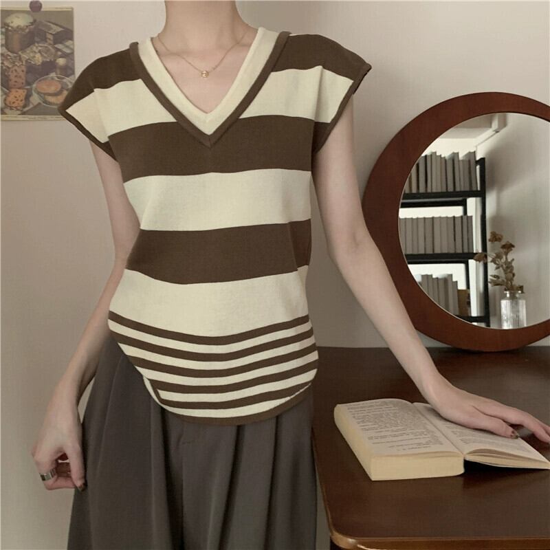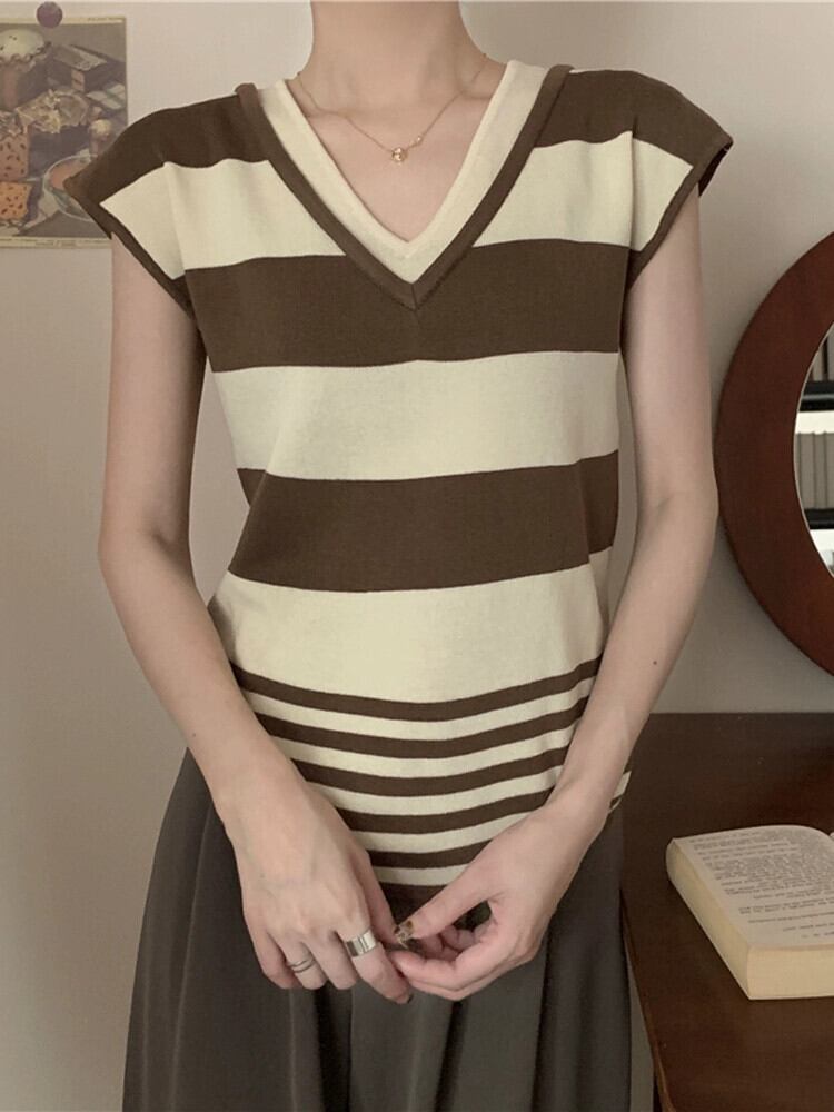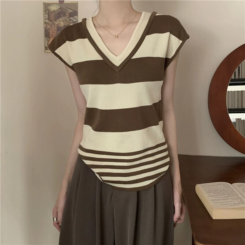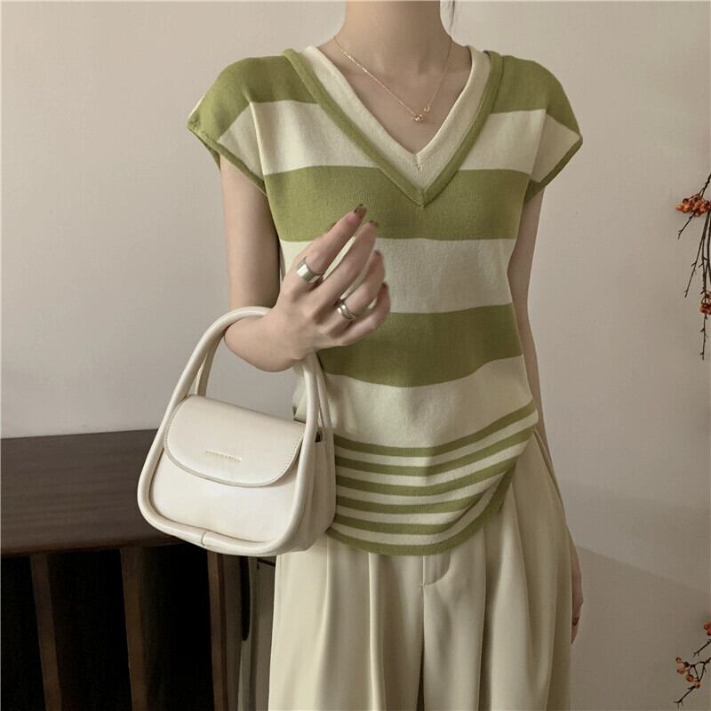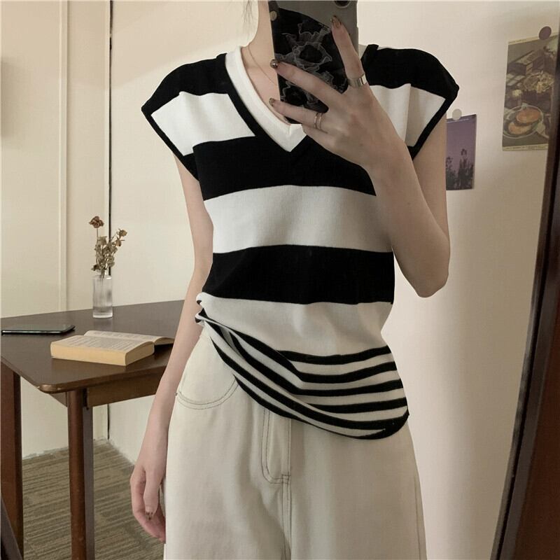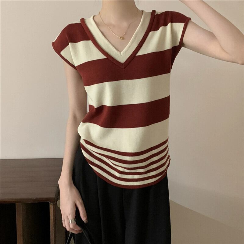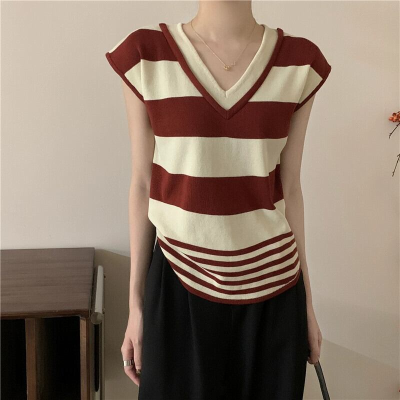 ストライプニットベストノースリーブTシャツレディース夏フレンチデザインセンスルーズファッションフェイクツーピースVネック小さなフライングスリーブトップ サマー 夏物 7460030765507550 | framboise21