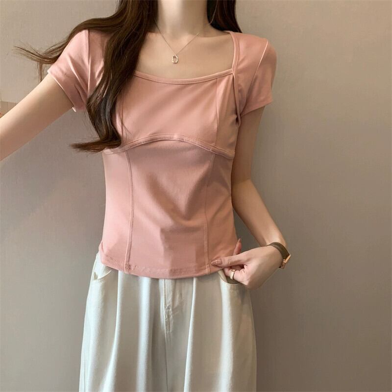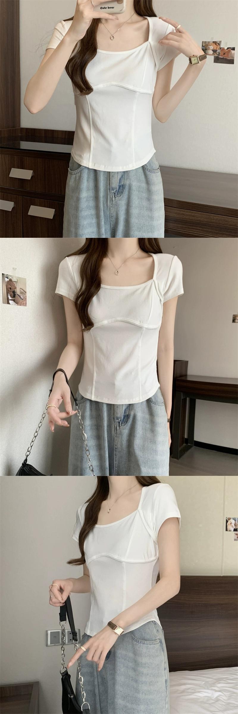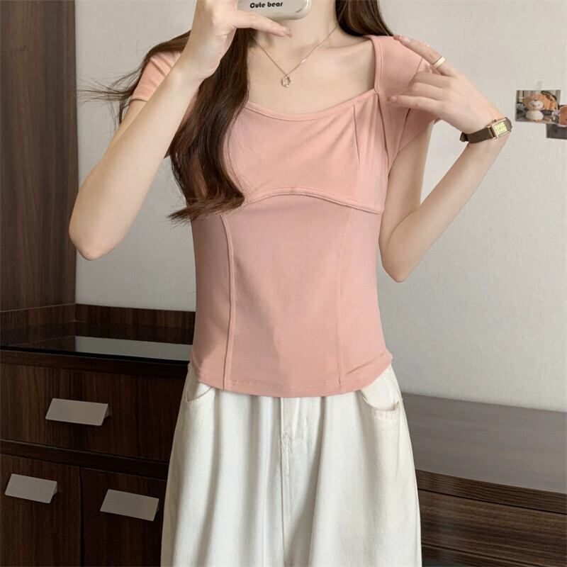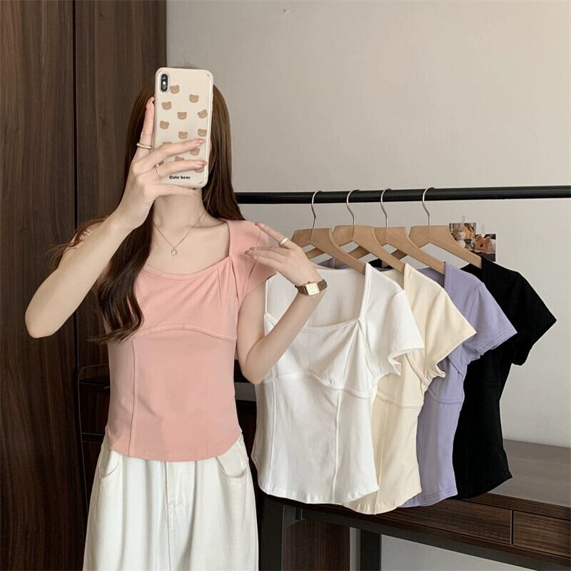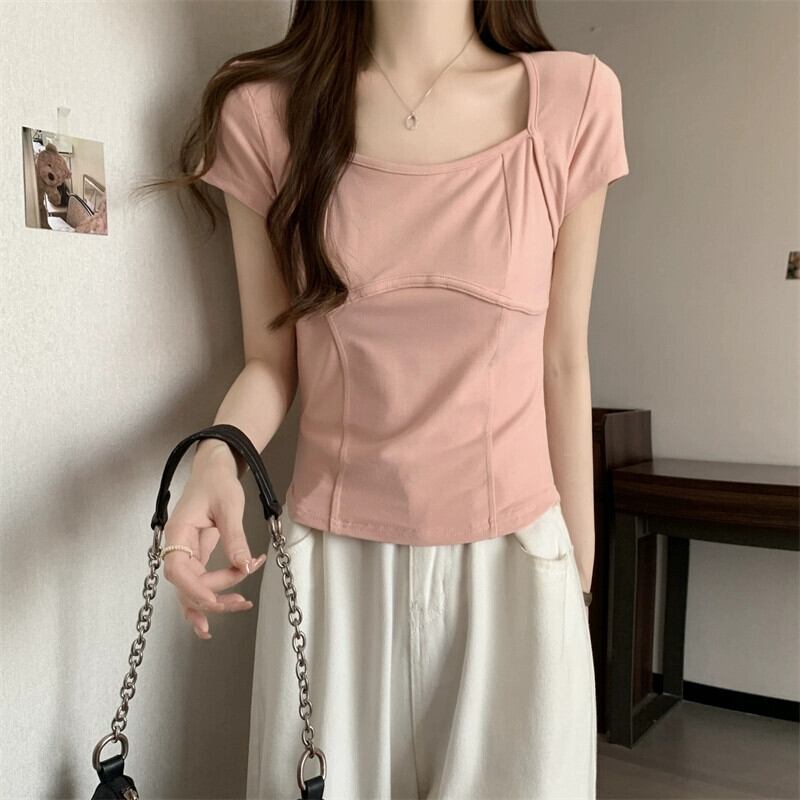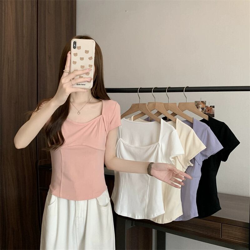 フロントショルダー純綿半袖Tシャツレディース2023年夏新デザインセンススリムフィット裾カーブショートスクエアカラートップ コットン サマー 夏物 ピュア スクウェア 7460011205363924 | framboise21