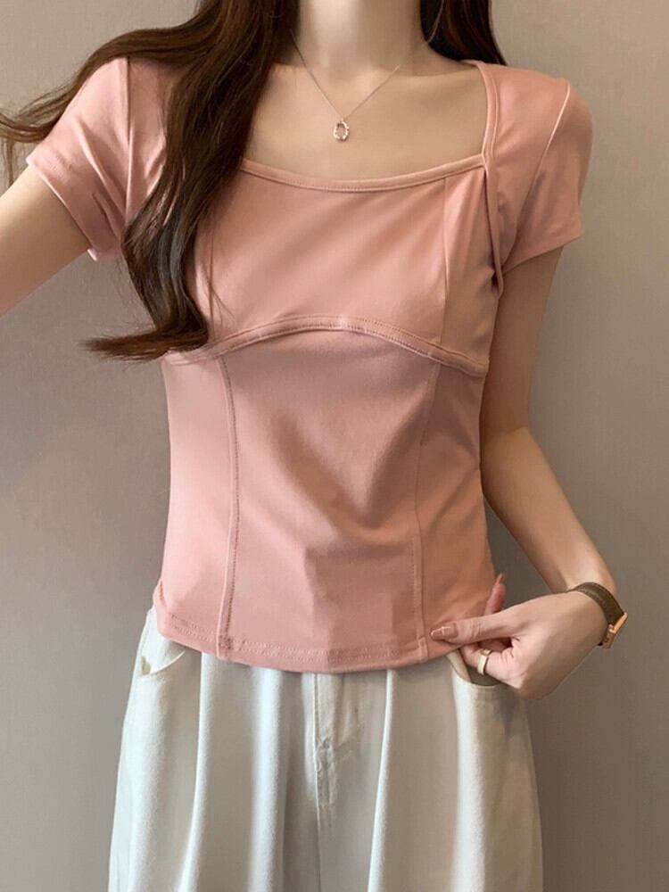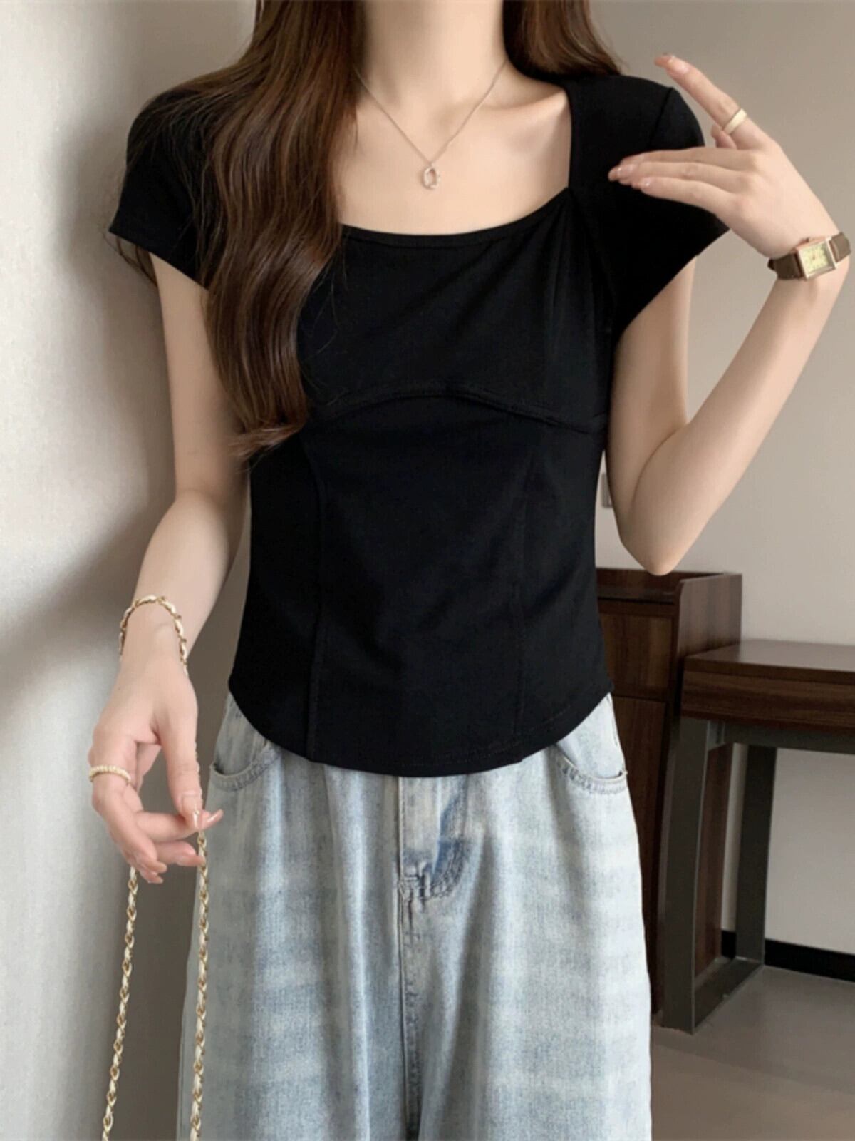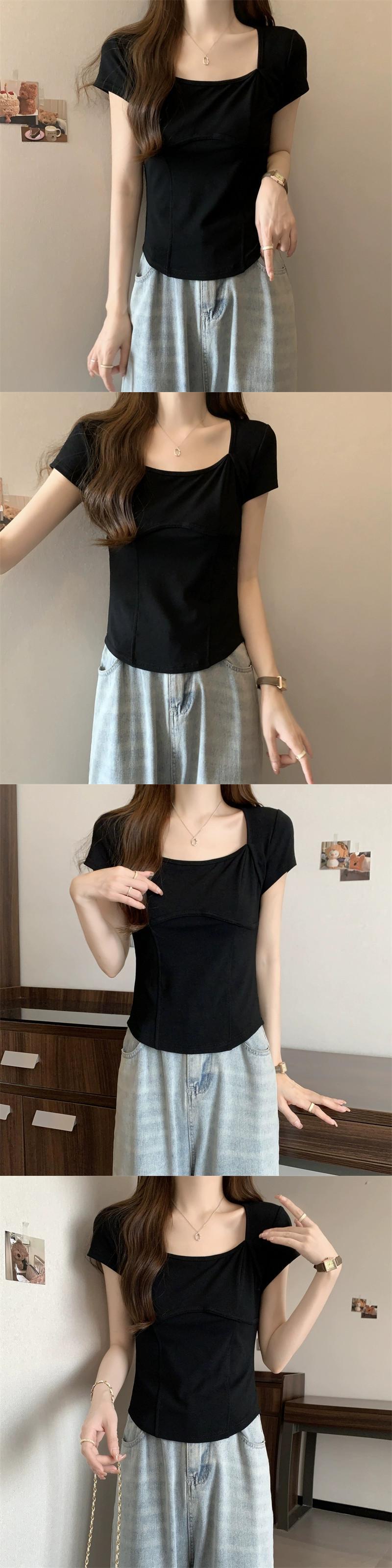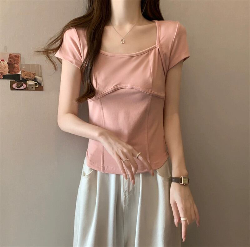 フロントショルダー純綿半袖Tシャツレディース2023年夏新デザインセンススリムフィット裾カーブショートスクエアカラートップ コットン サマー 夏物 ピュア スクウェア 7460011205363924 | framboise21
