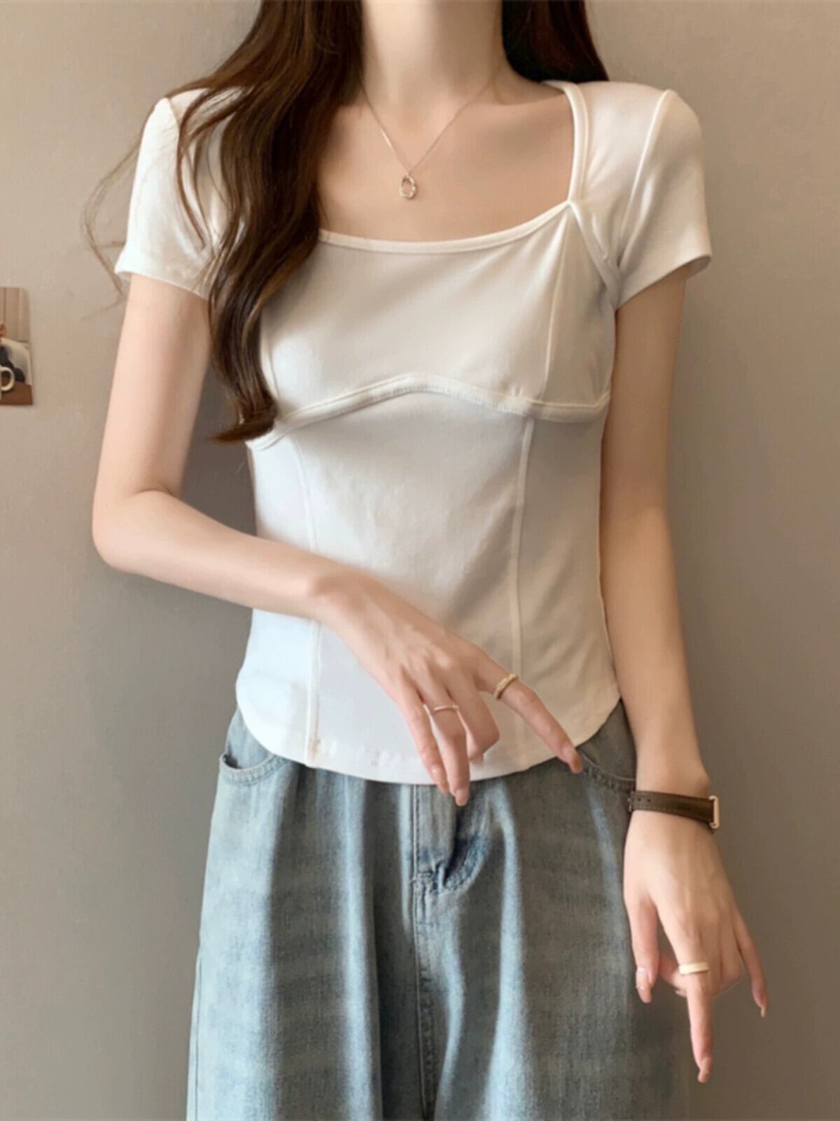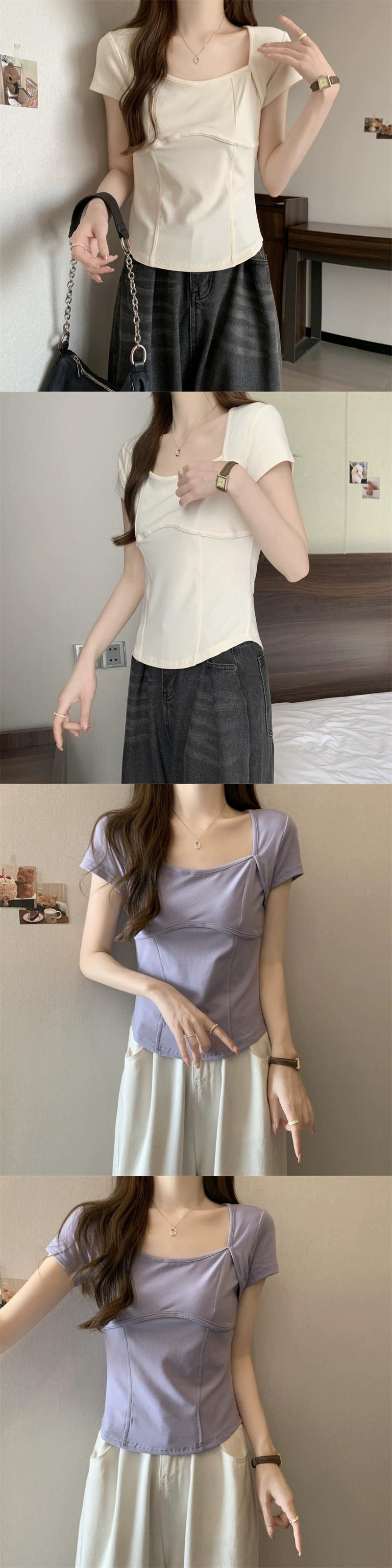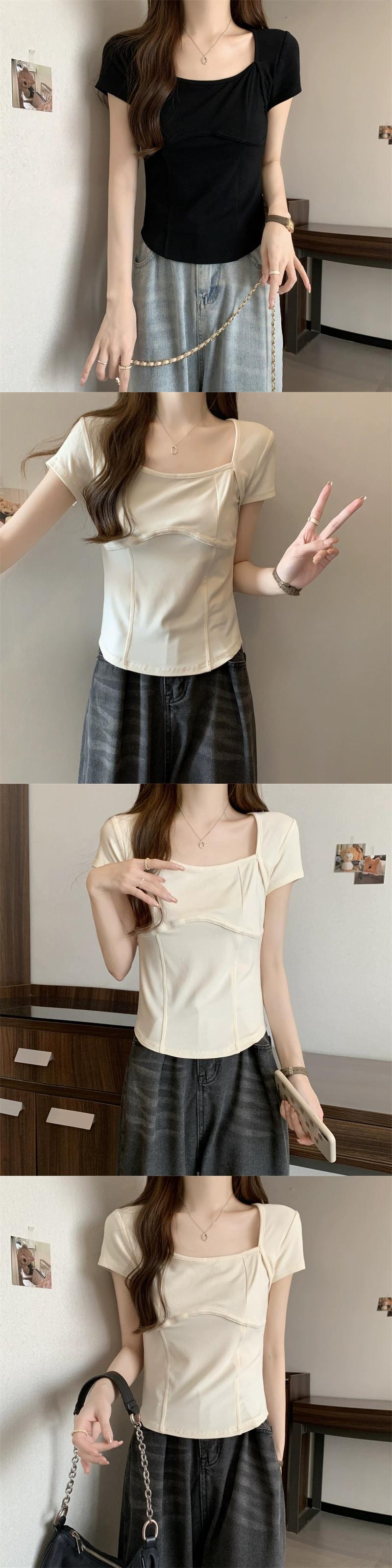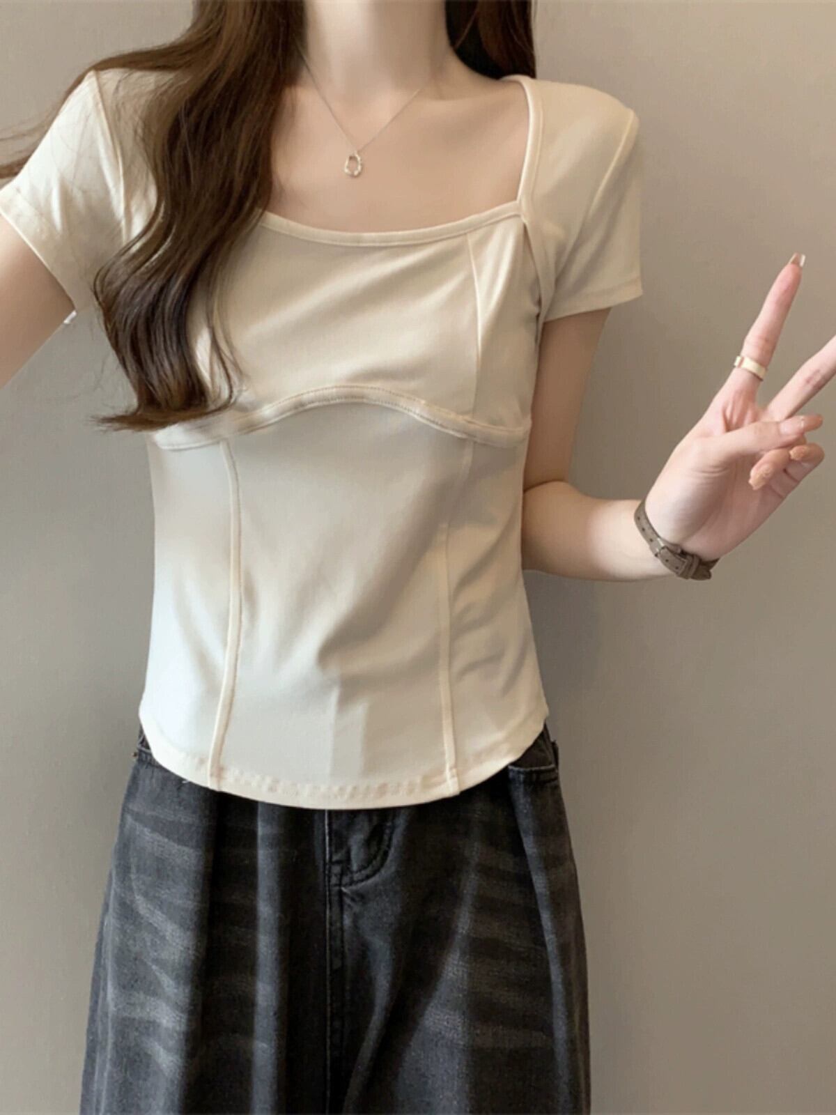 フロントショルダー純綿半袖Tシャツレディース2023年夏新デザインセンススリムフィット裾カーブショートスクエアカラートップ コットン サマー 夏物 ピュア スクウェア 7460011205363924 | framboise21