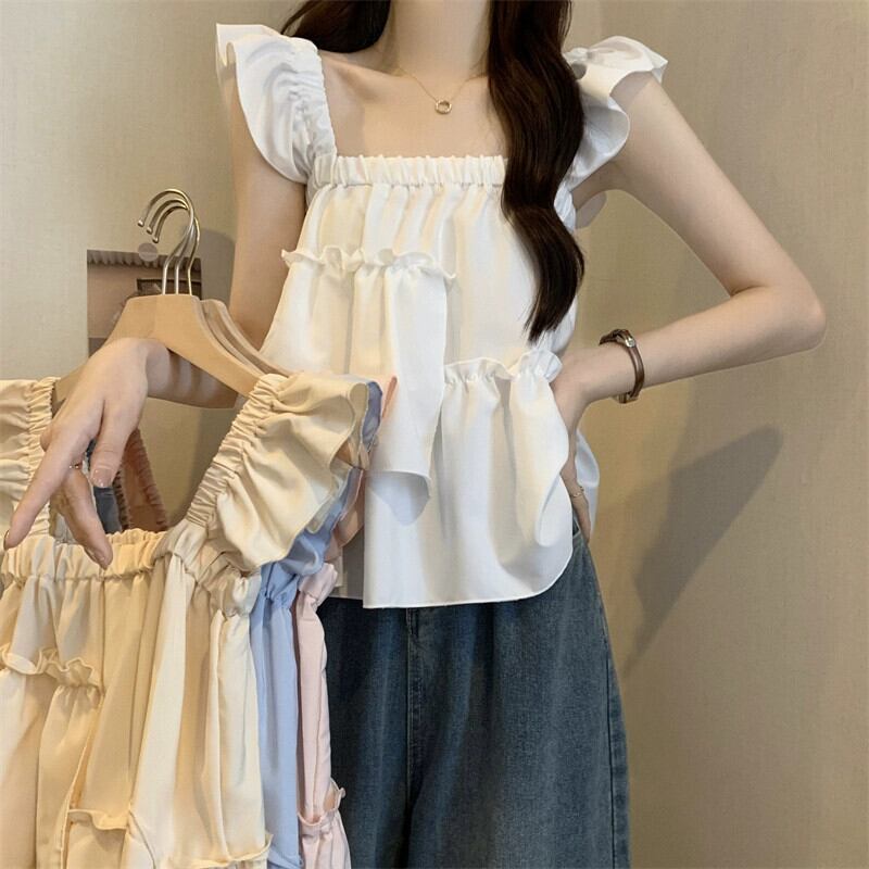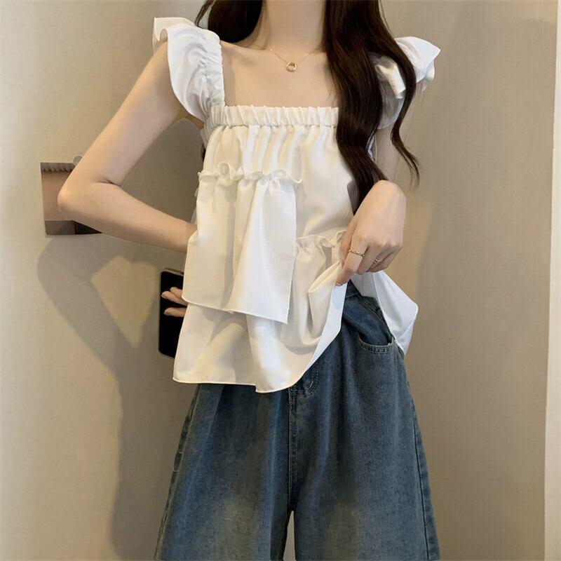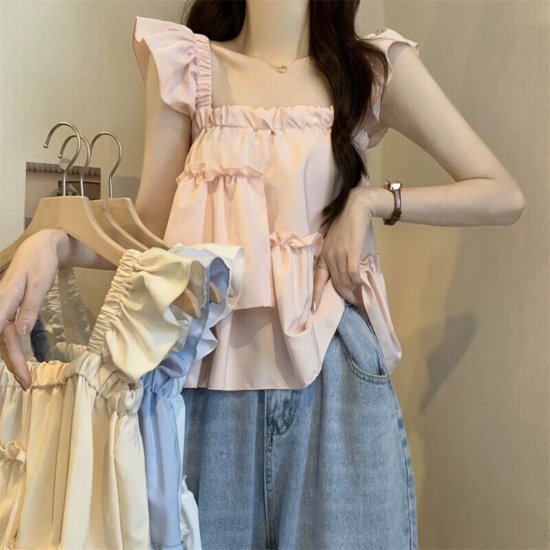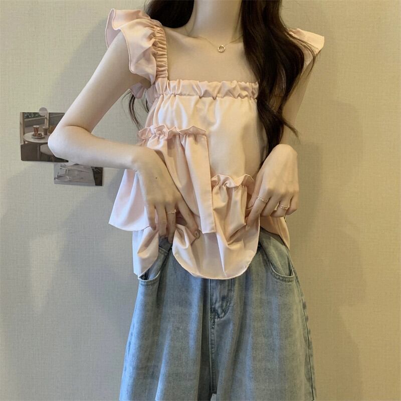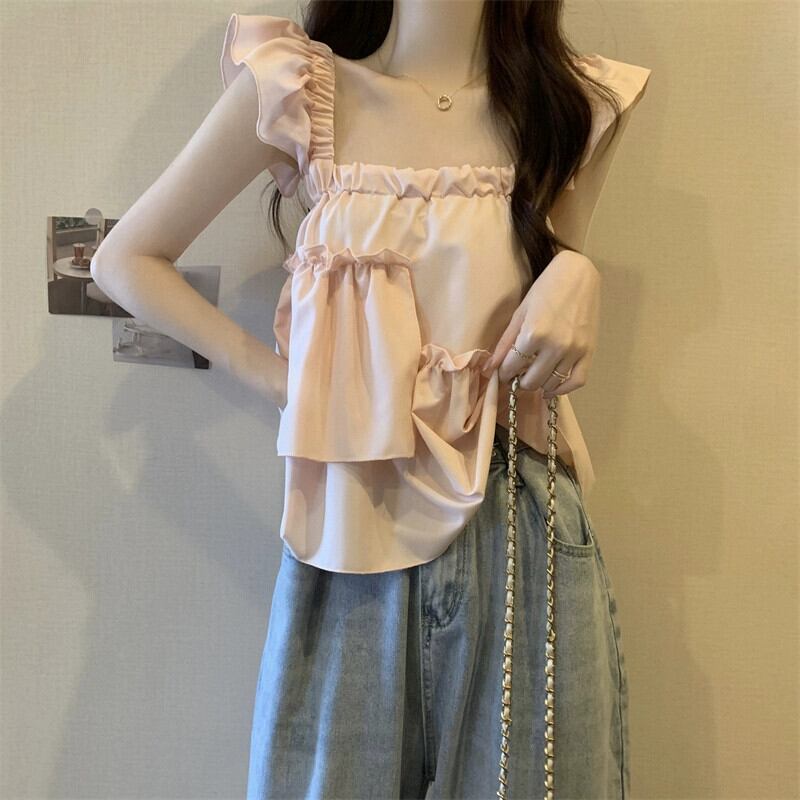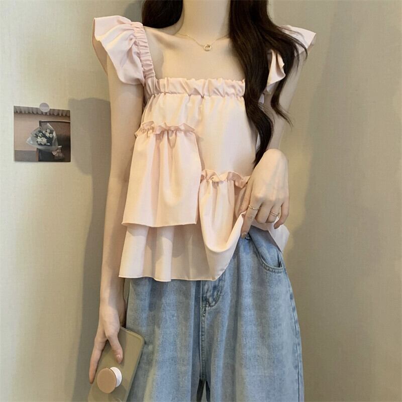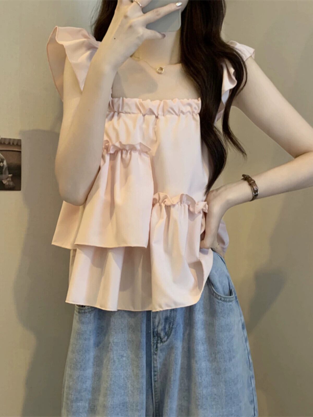 ピンクのノースリーブキャミソール女性の夏のデザインルーズアウターショートスクエアカラー小さなフライングスリーブボトミングトップ サマー 夏物 スクウェア 7460078542878589 | framboise21