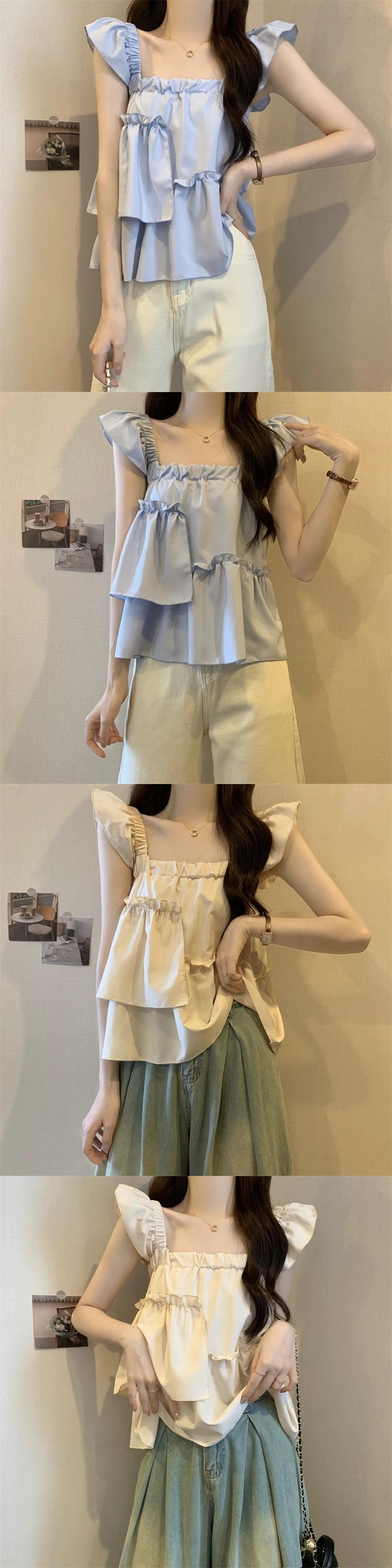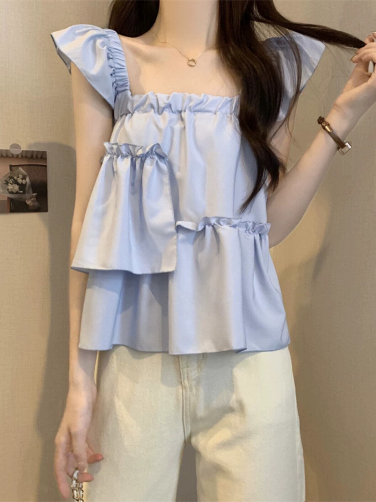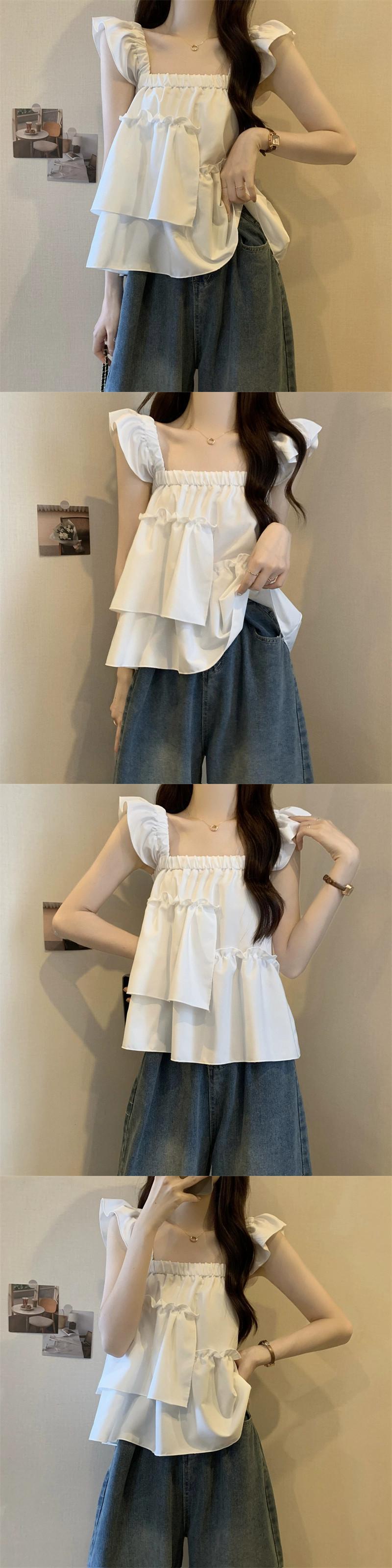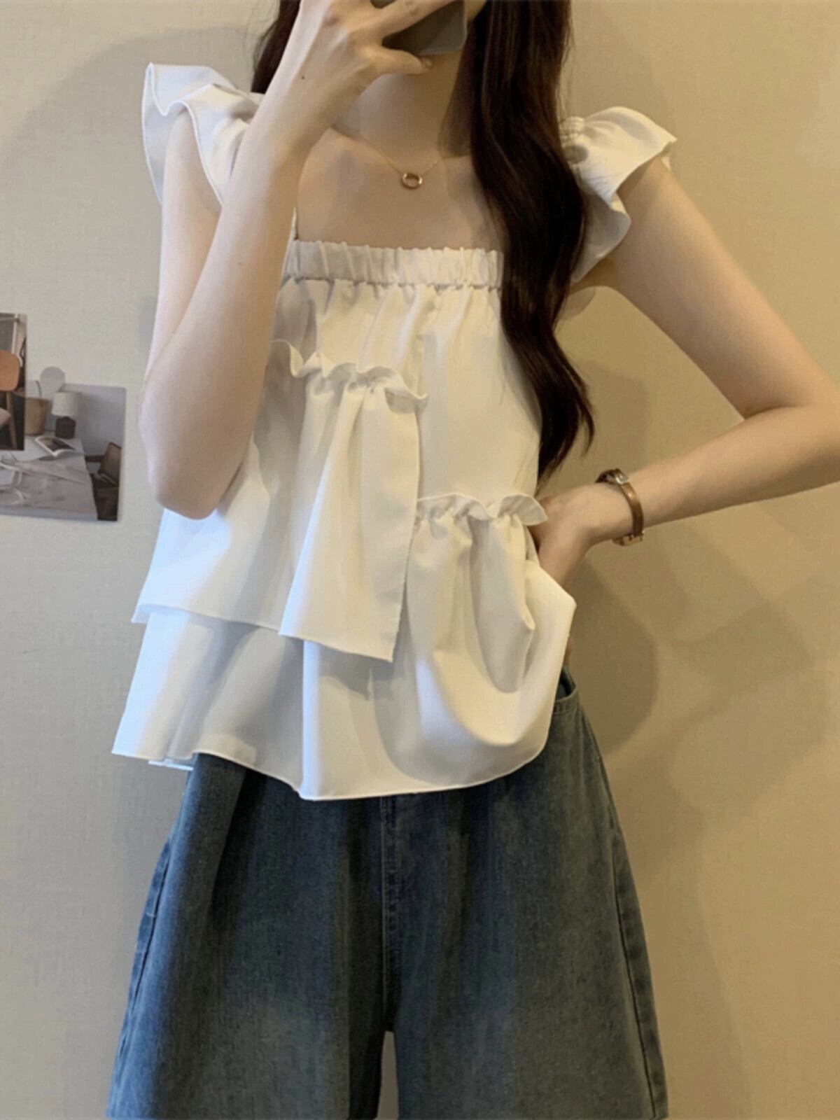 ピンクのノースリーブキャミソール女性の夏のデザインルーズアウターショートスクエアカラー小さなフライングスリーブボトミングトップ サマー 夏物 スクウェア 7460078542878589 | framboise21