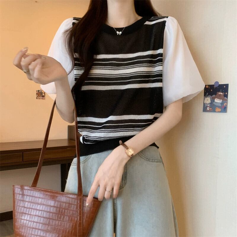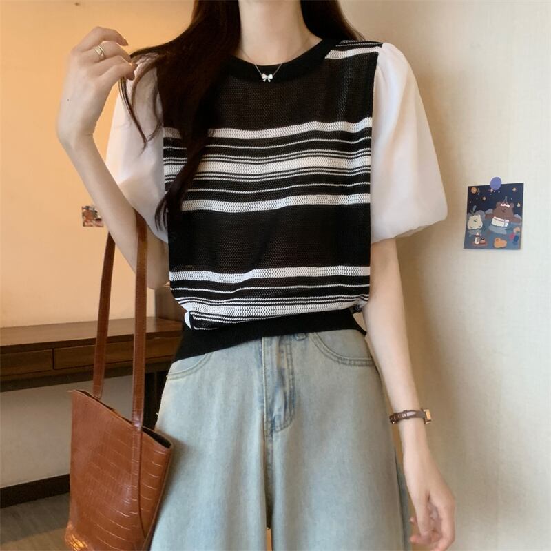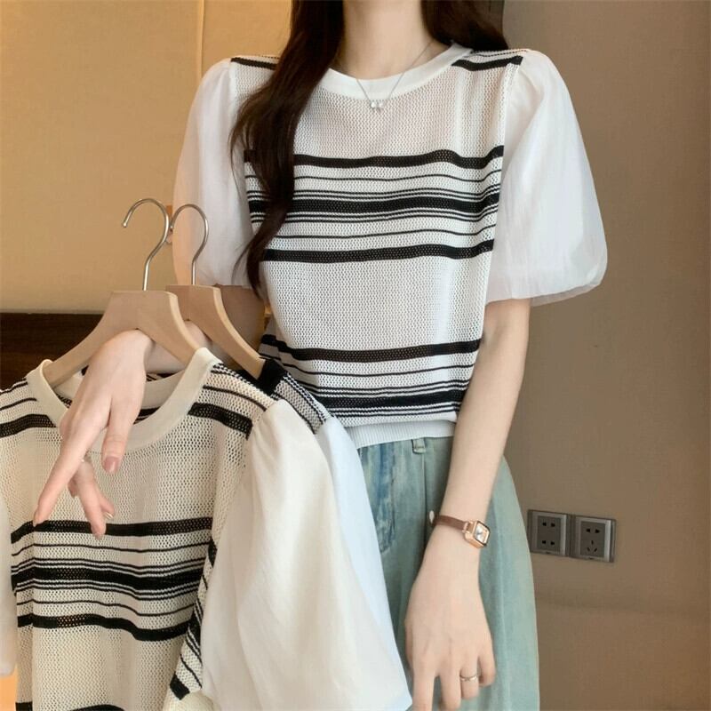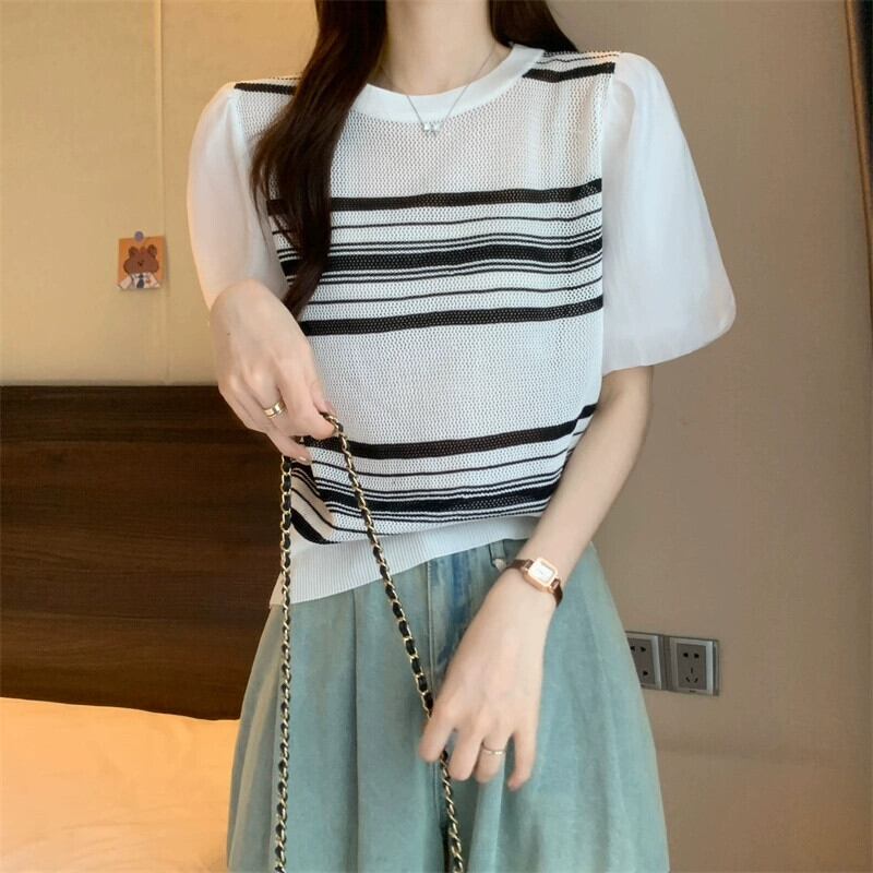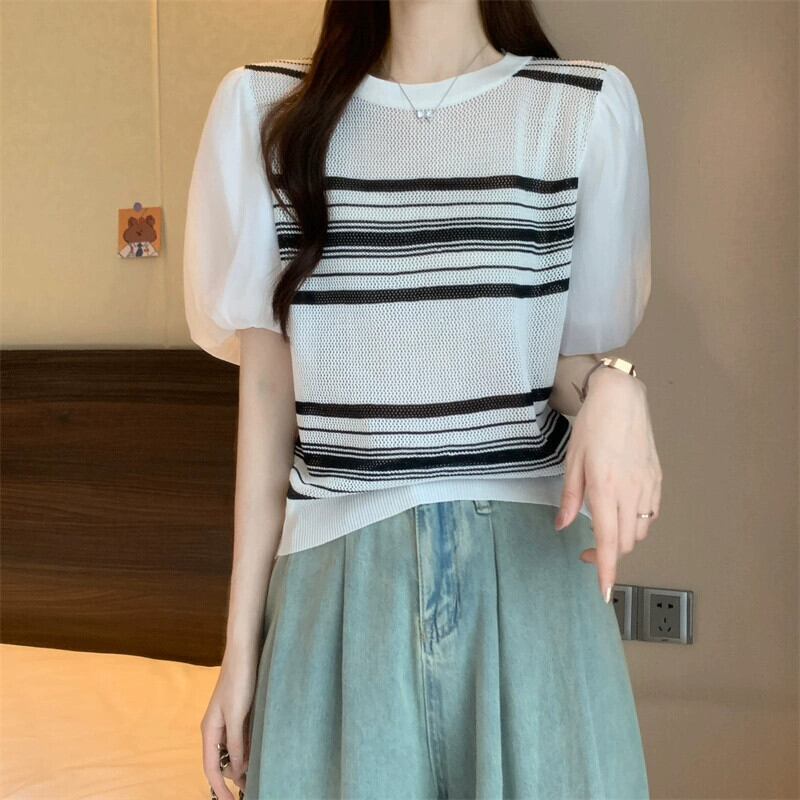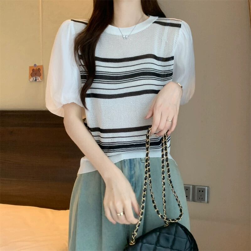 中空の薄いアイスシルク半袖ニットセーター女性の夏フレンチニッチデザインルーズファッションストライプラウンドネックトップ サマー 夏物 Oネック 7460015985659288 | framboise21