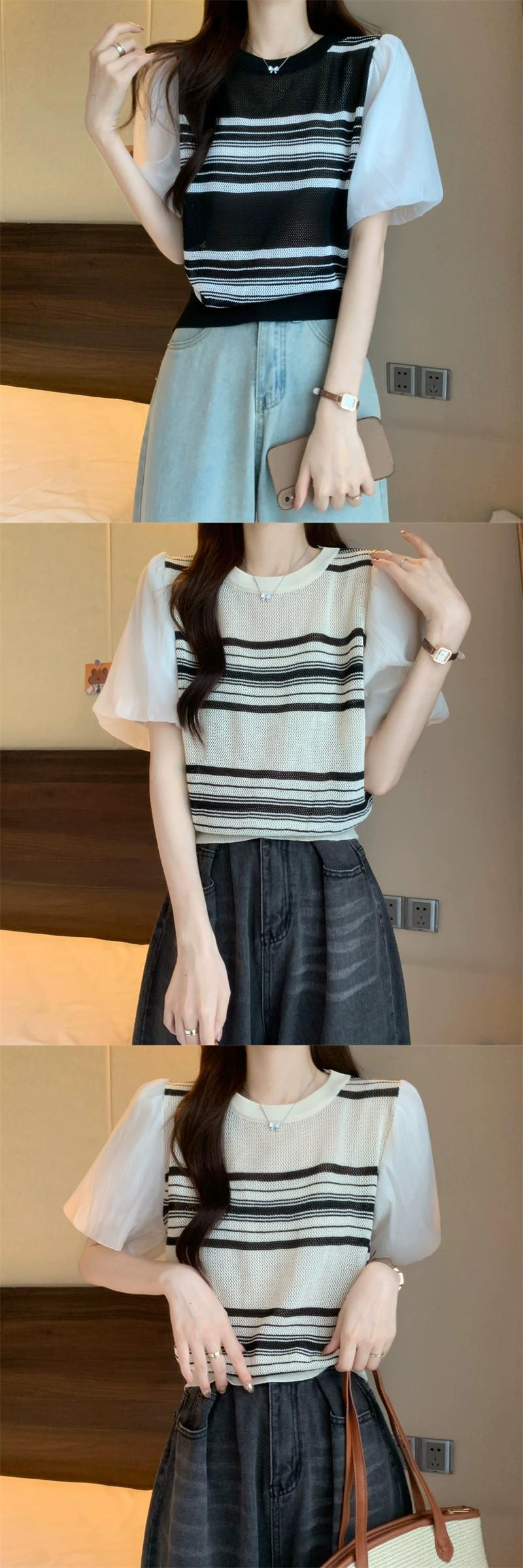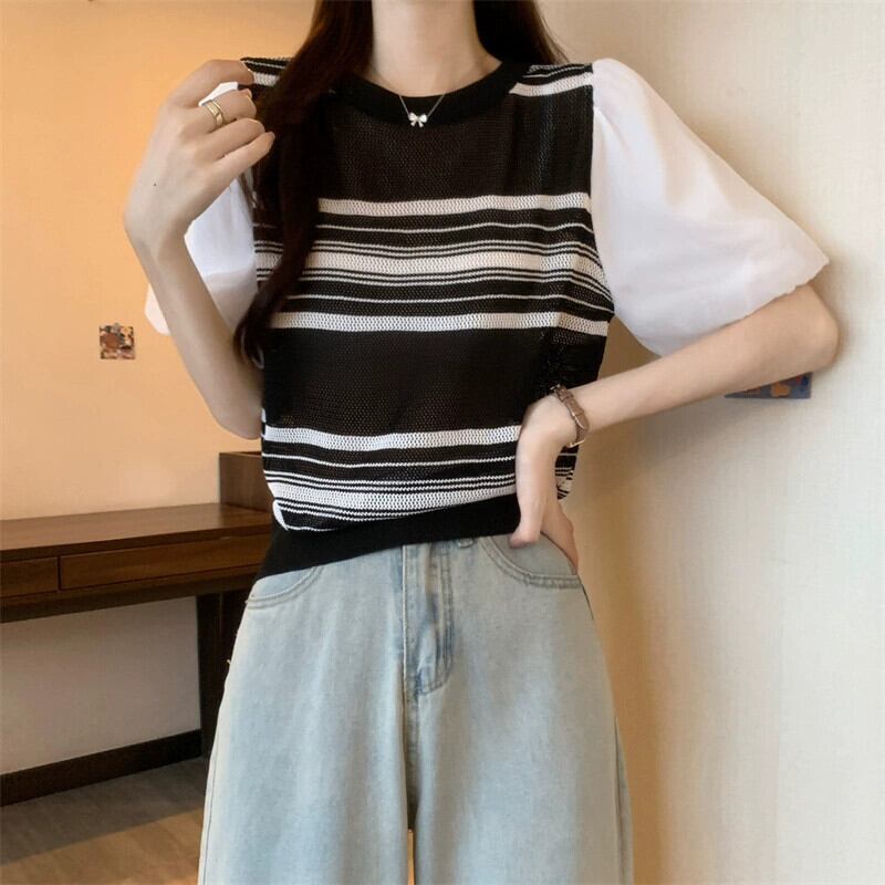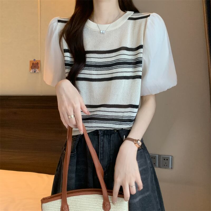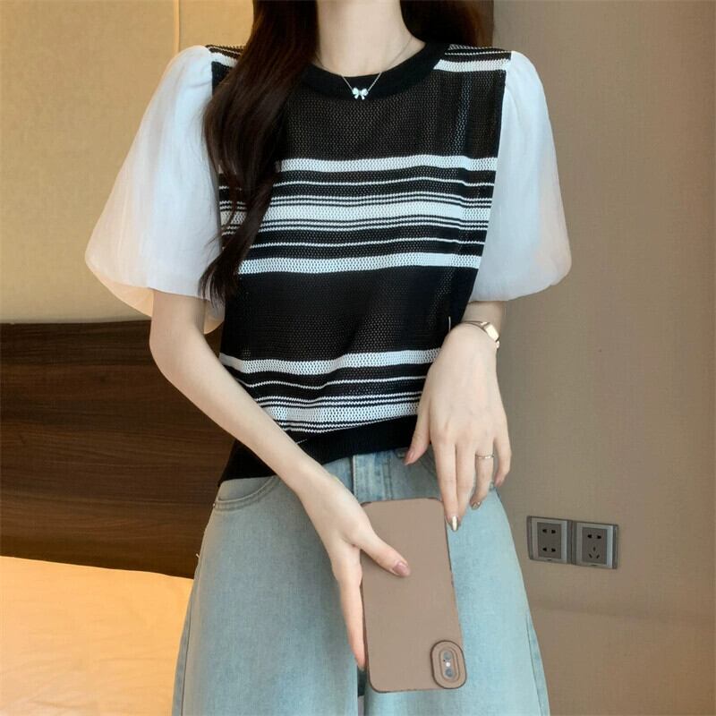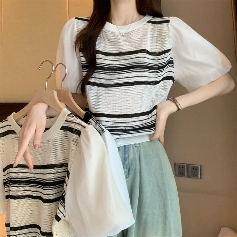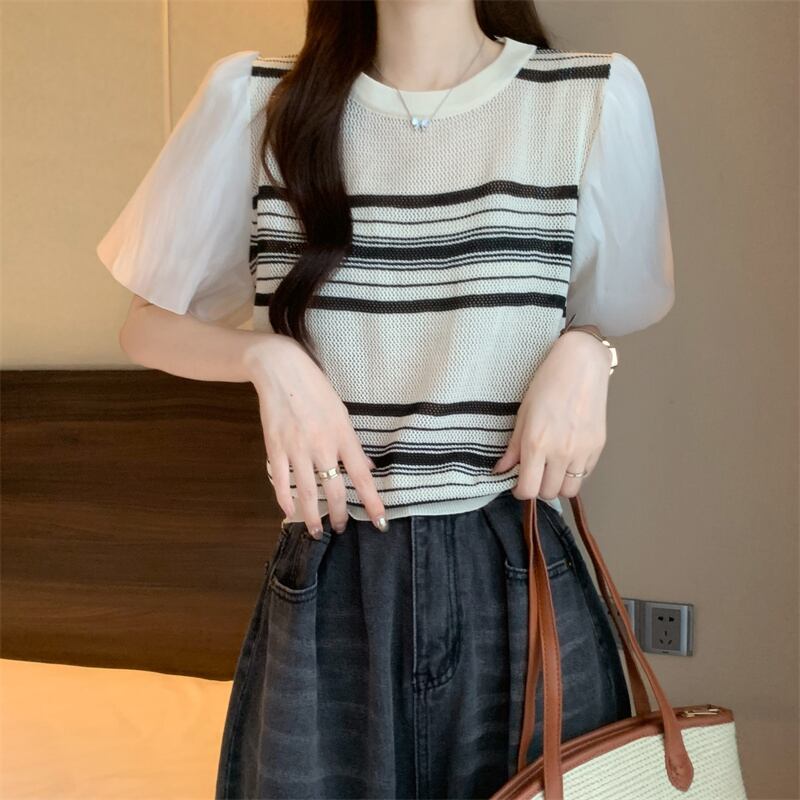 中空の薄いアイスシルク半袖ニットセーター女性の夏フレンチニッチデザインルーズファッションストライプラウンドネックトップ サマー 夏物 Oネック 7460015985659288 | framboise21