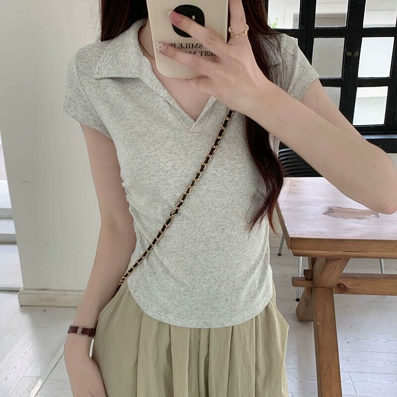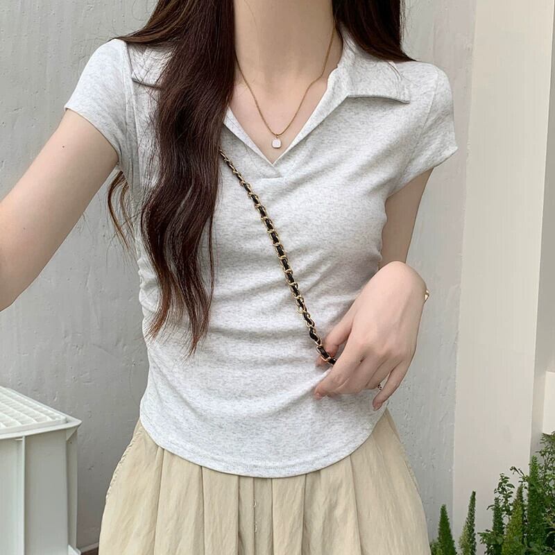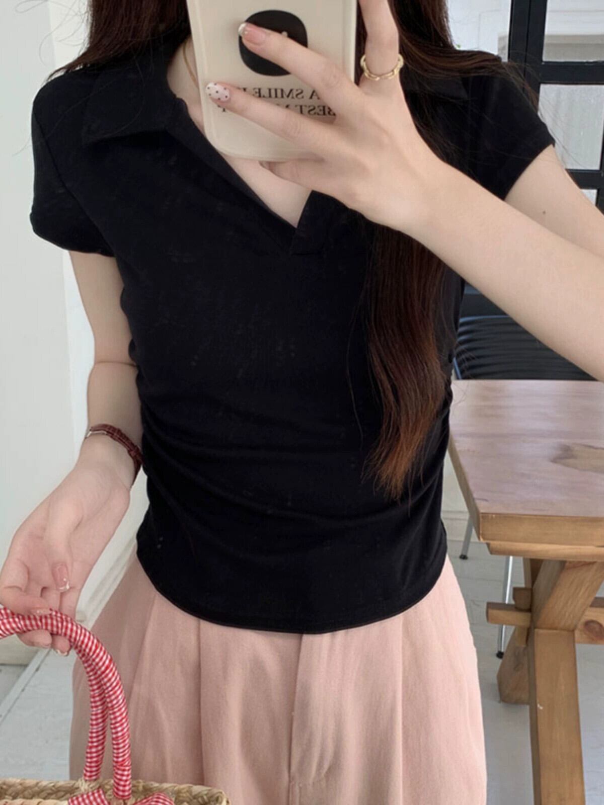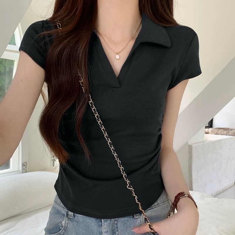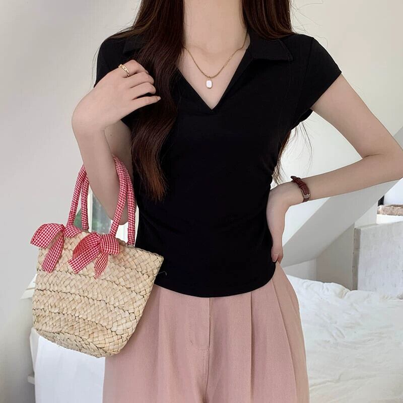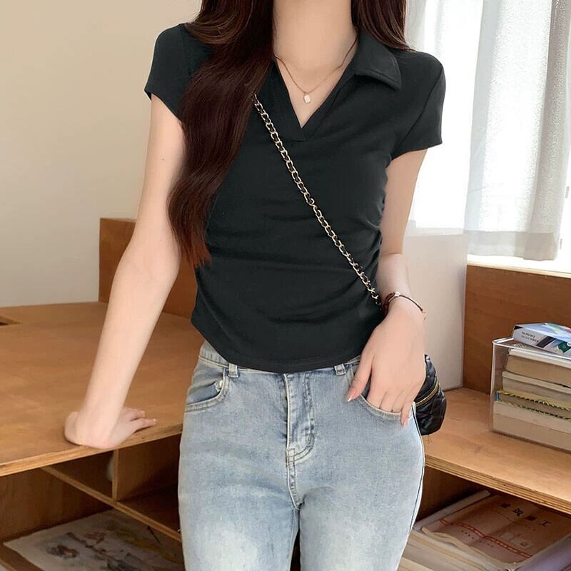 フロントショルダーポロカラー純綿半袖Tシャツ女性の夏の自己修養デザインセンスファッションイレギュラーヘムショートトップ コットン サマー 夏物 ピュア 7460016191904800 | framboise21