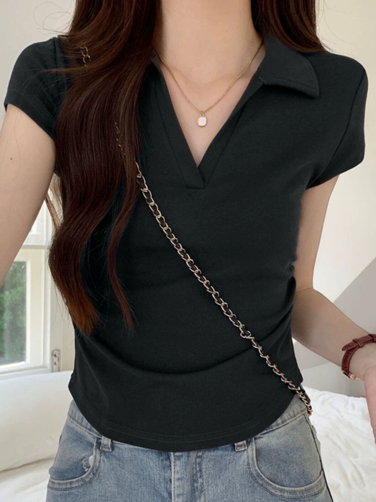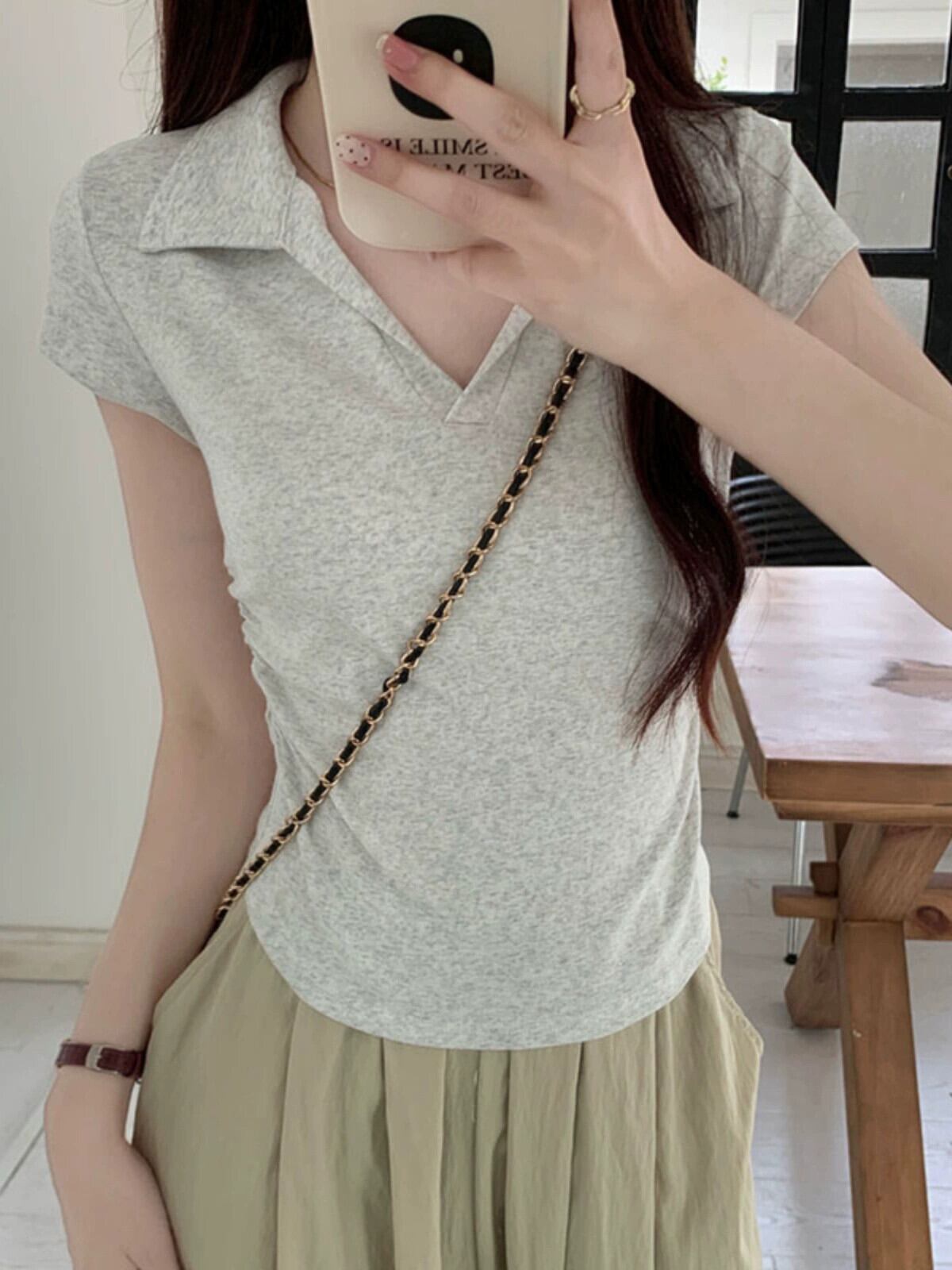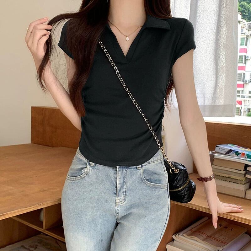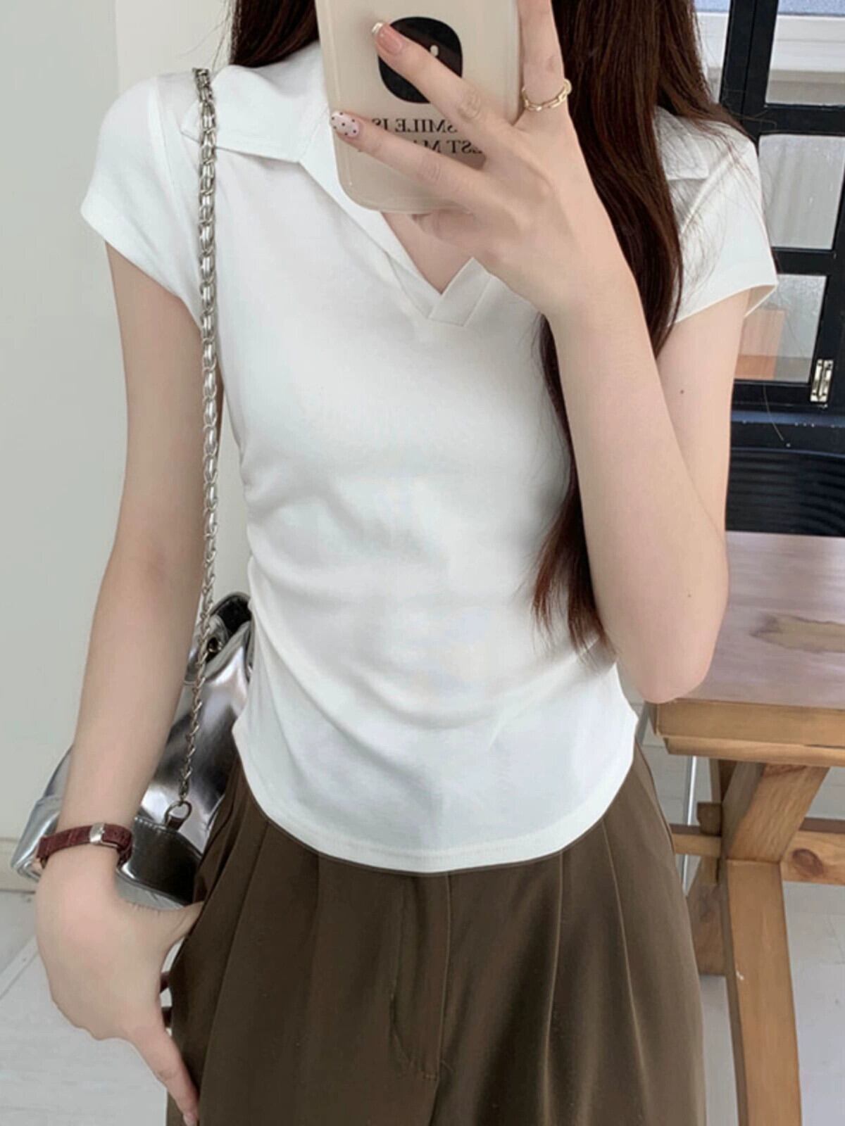 フロントショルダーポロカラー純綿半袖Tシャツ女性の夏の自己修養デザインセンスファッションイレギュラーヘムショートトップ コットン サマー 夏物 ピュア 7460016191904800 | framboise21