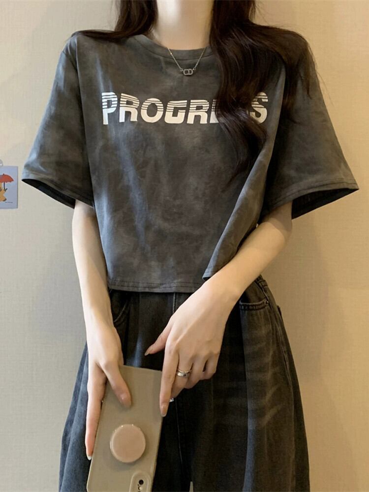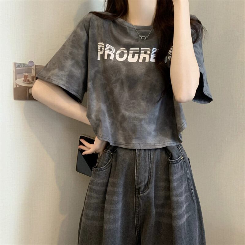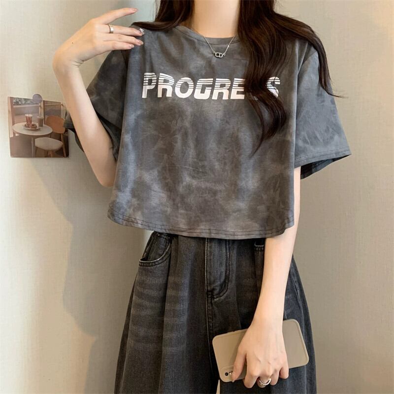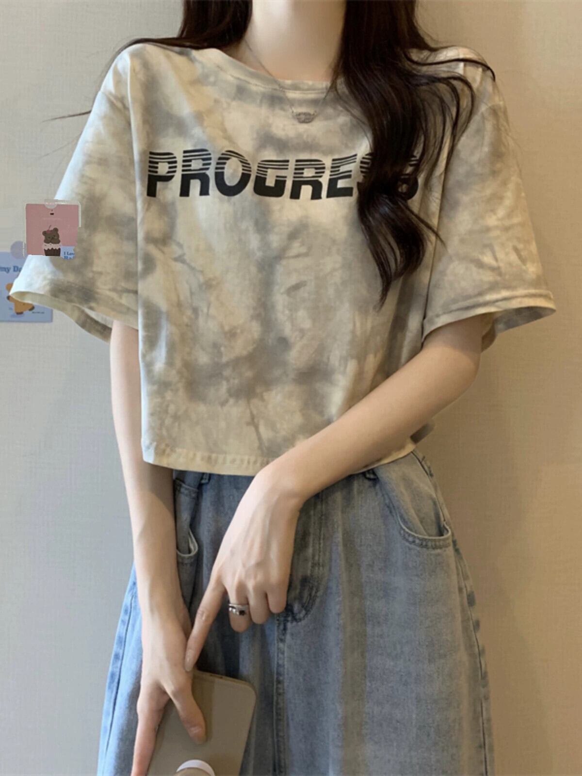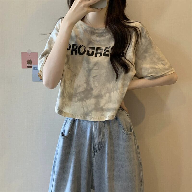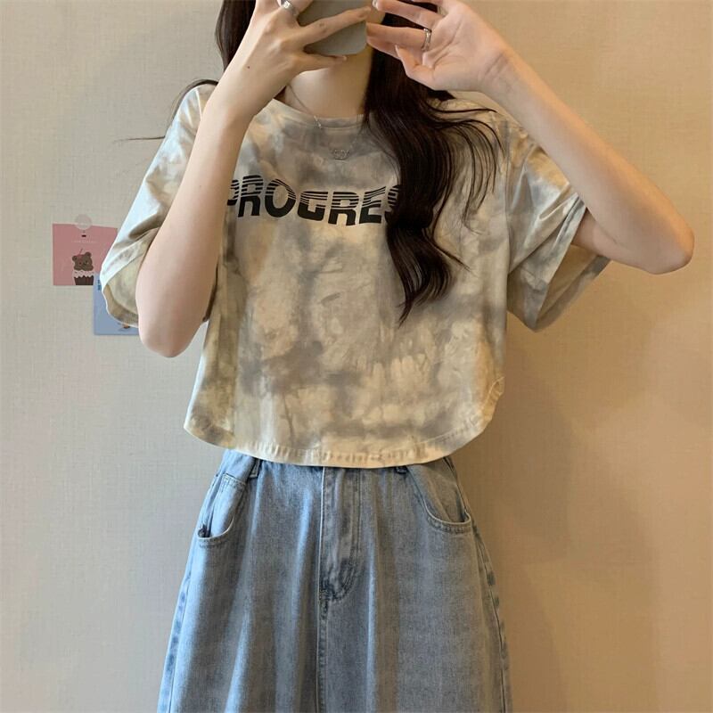 タイダイフロントショルダー半袖Tシャツレディース夏アメリカンレトロデザイン感ゆるいへその緒ショートラウンドネックトップ サマー 夏物 Oネック 7460083286691183 | framboise21