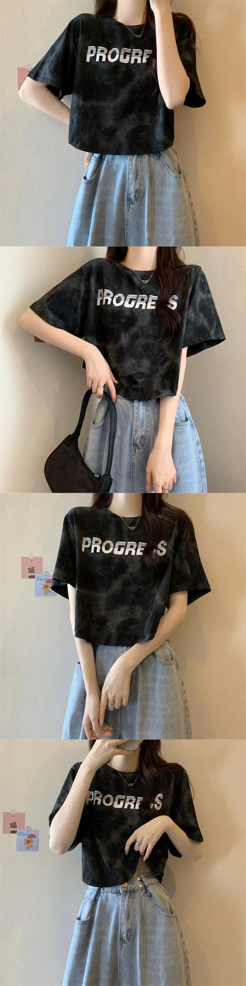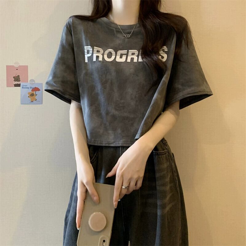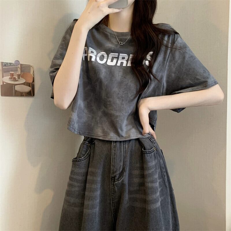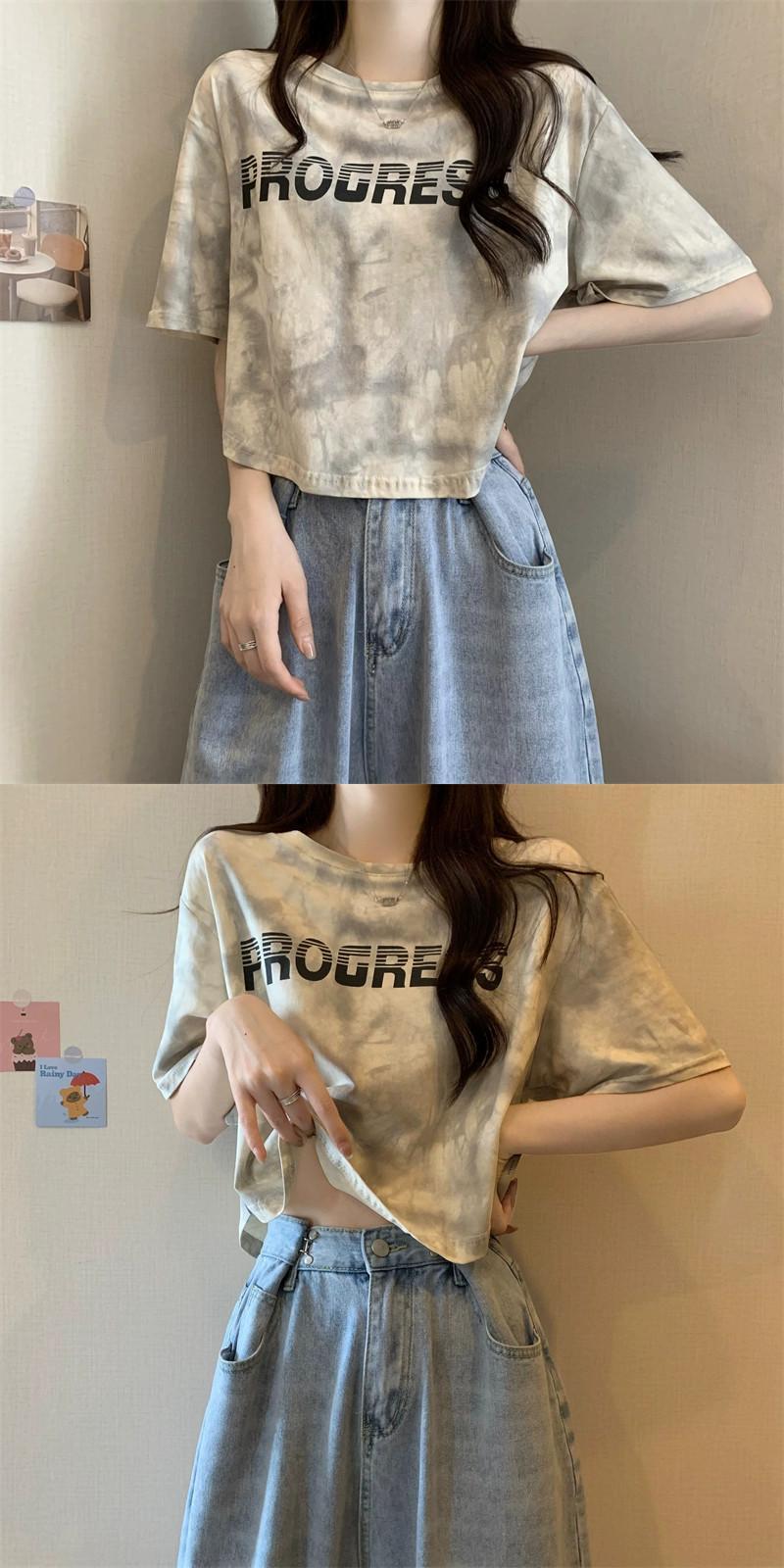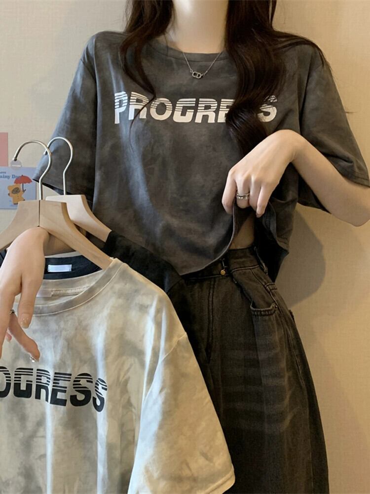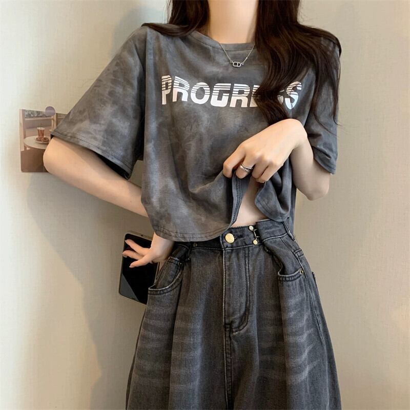 タイダイフロントショルダー半袖Tシャツレディース夏アメリカンレトロデザイン感ゆるいへその緒ショートラウンドネックトップ サマー 夏物 Oネック 7460083286691183 | framboise21