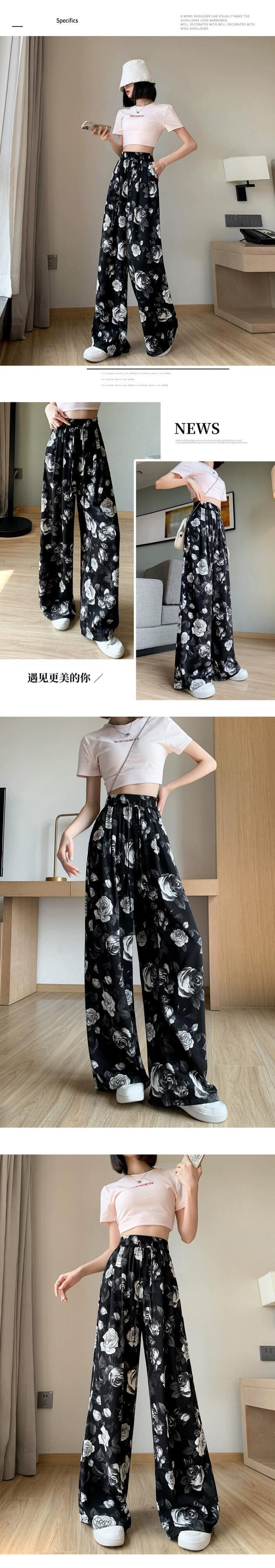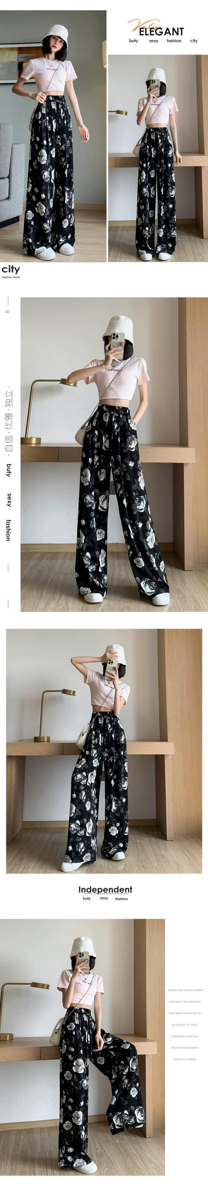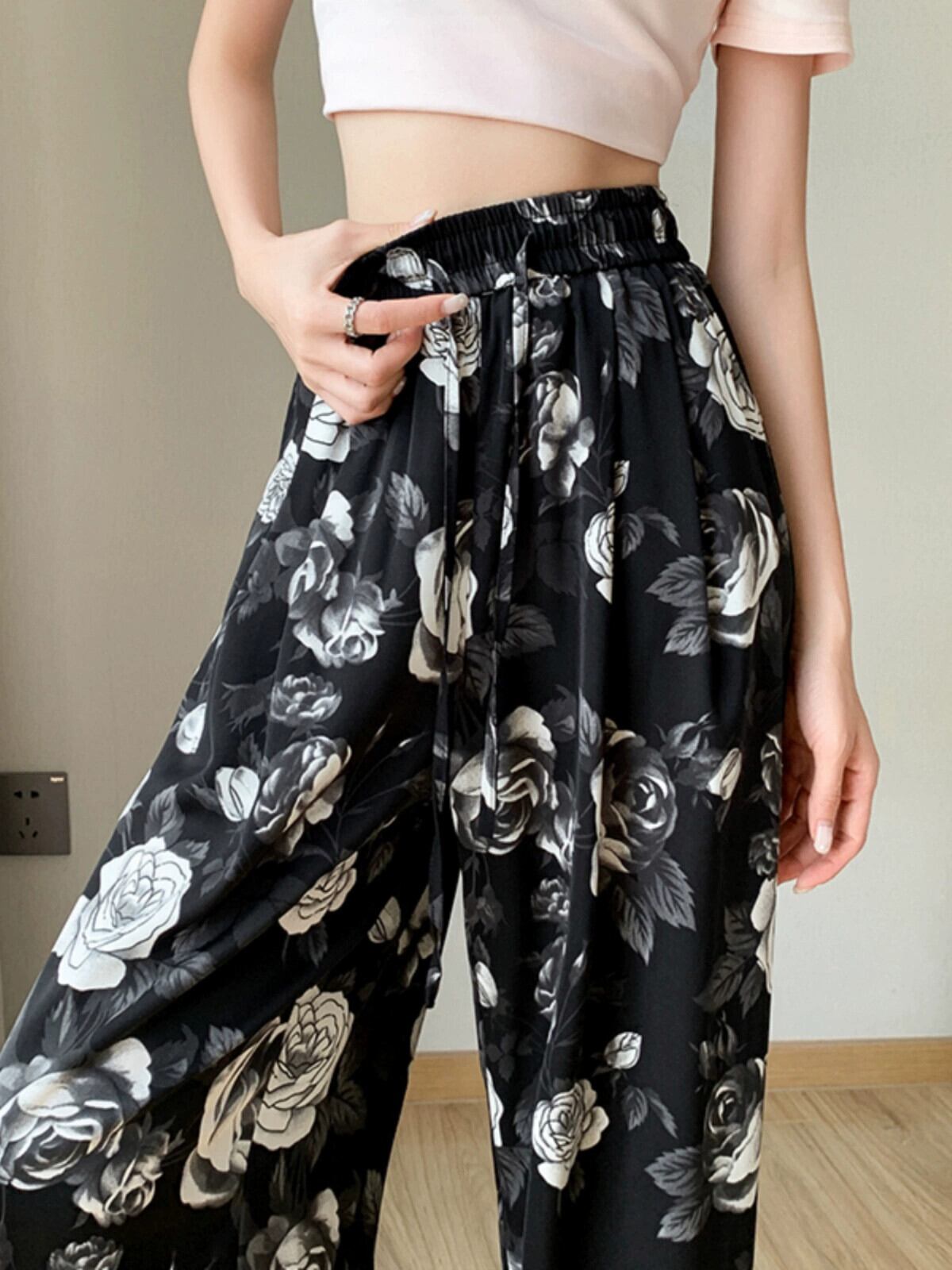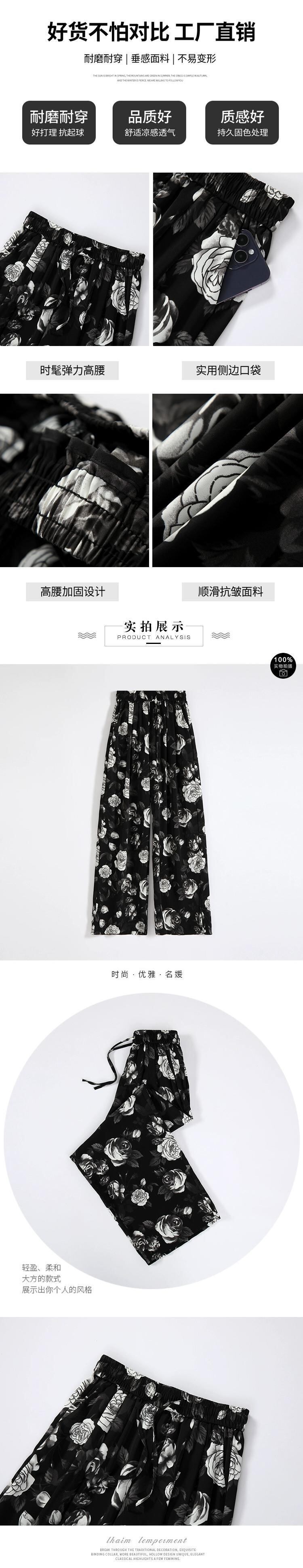 黒のプリントストレートパンツの女性の夏薄いセクション水墨画アイスシルクワイドレッグパンツカジュアルハイウエストドレープクールパンツ ハイウェスト ブラック サマー 夏物 7460084256832080 | framboise21