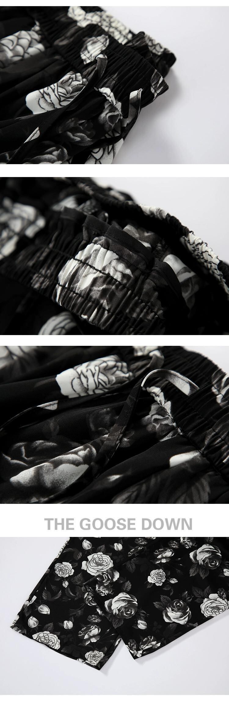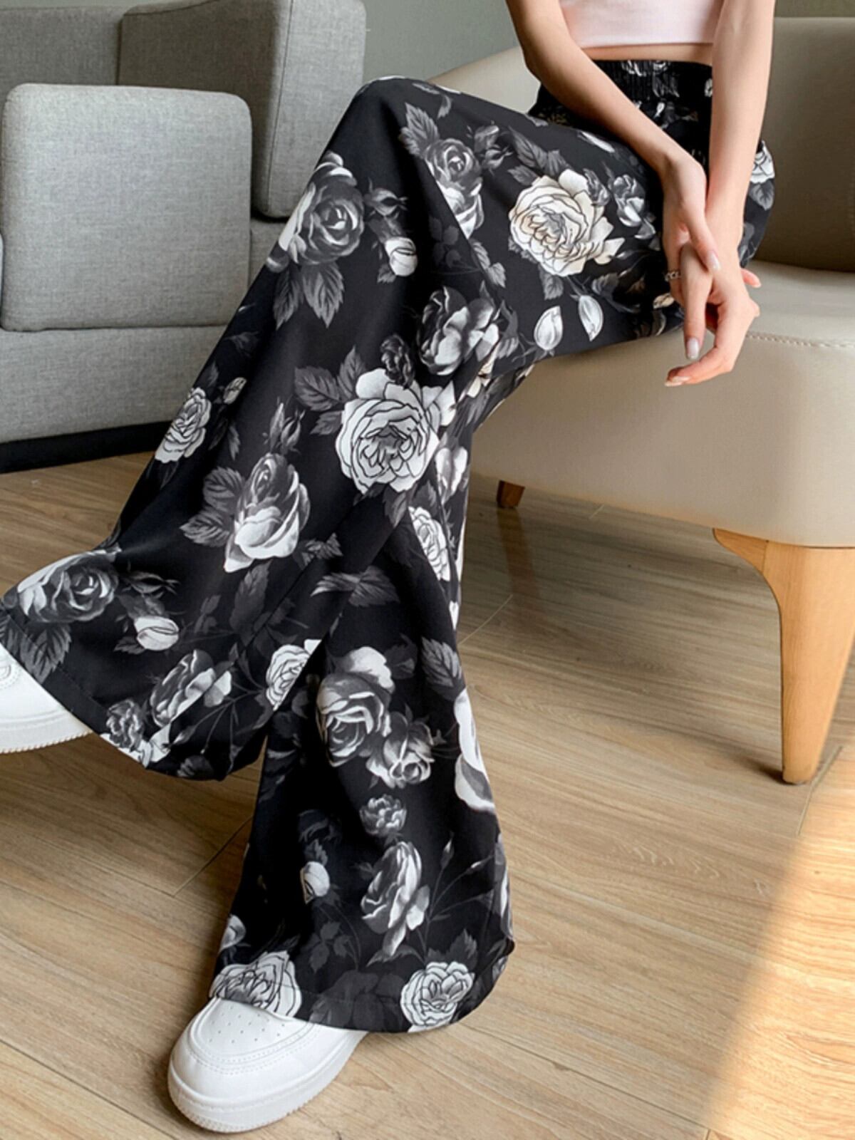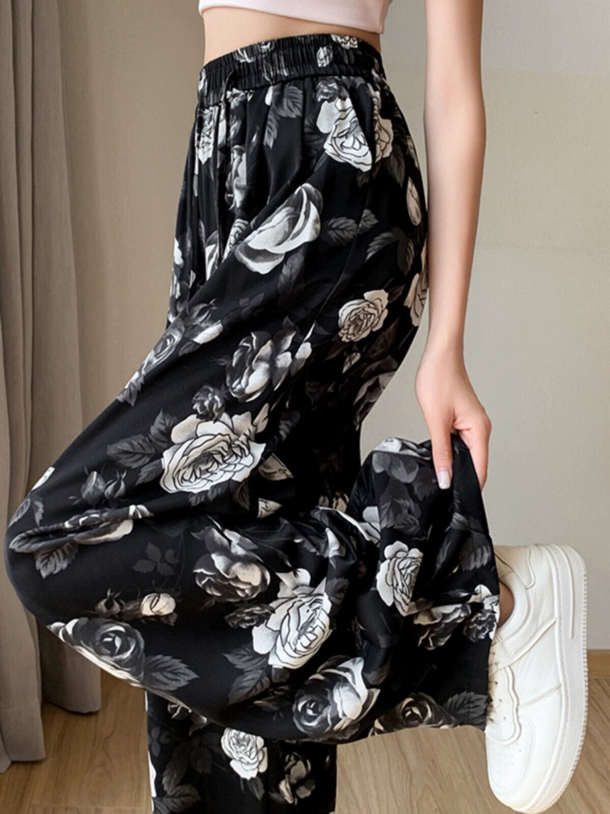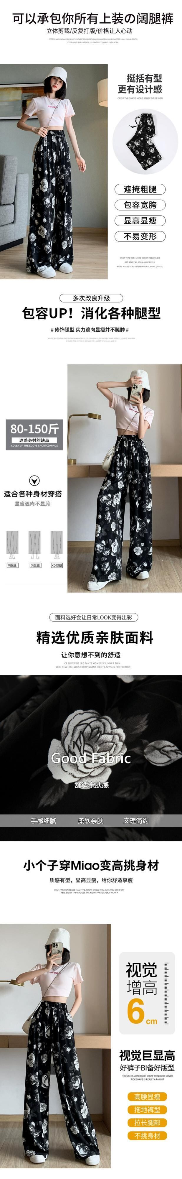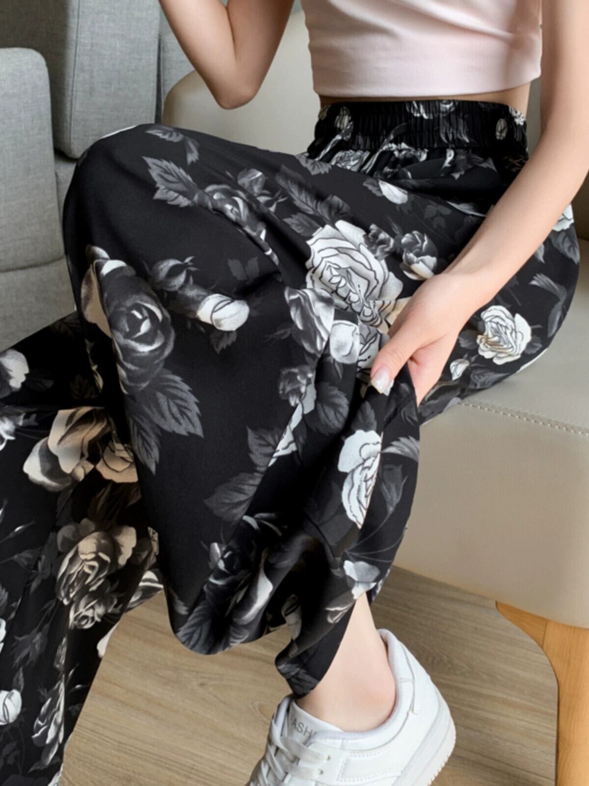 黒のプリントストレートパンツの女性の夏薄いセクション水墨画アイスシルクワイドレッグパンツカジュアルハイウエストドレープクールパンツ ハイウェスト ブラック サマー 夏物 7460084256832080 | framboise21