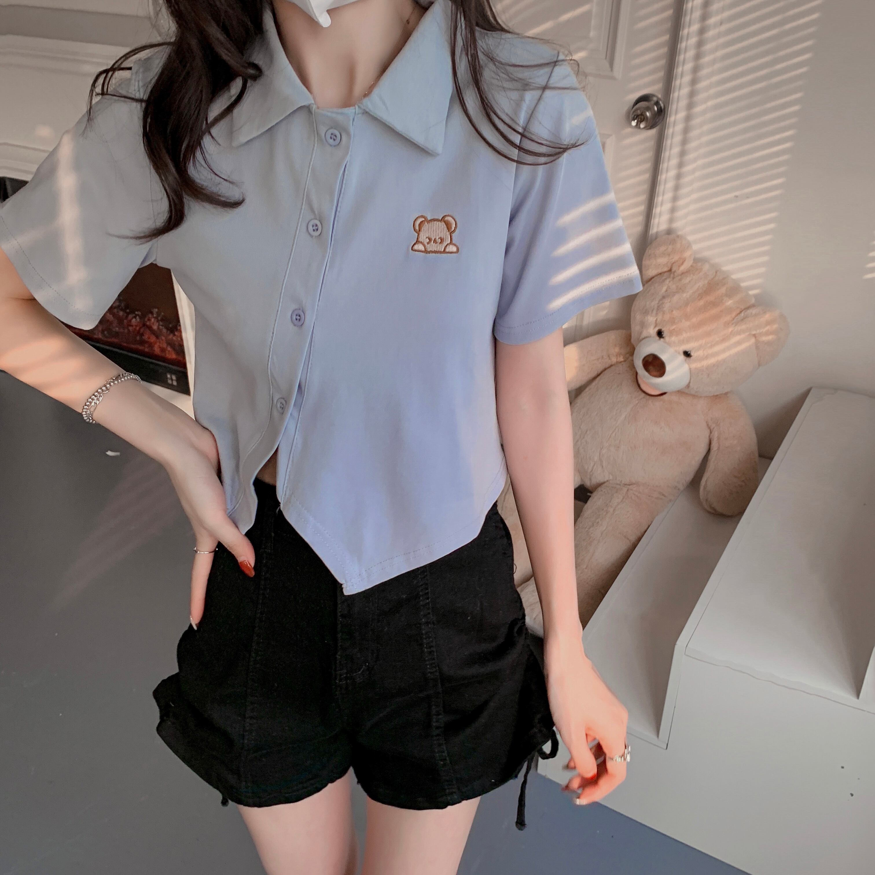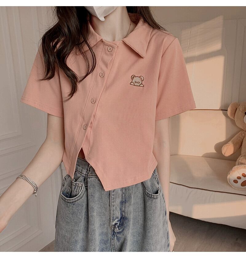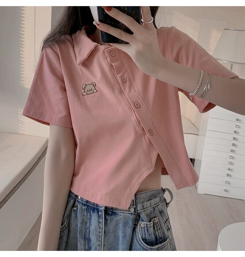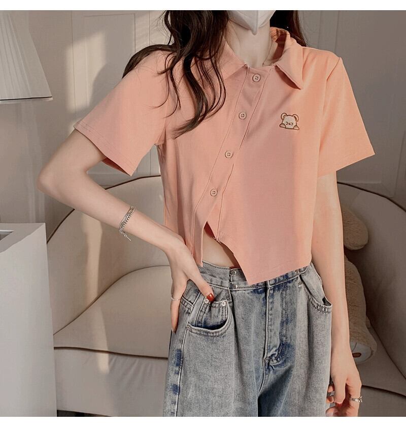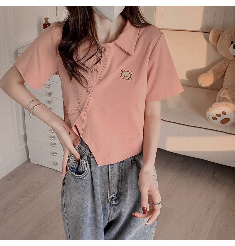 変則半袖Tシャツレディース夏甘デザインセンスゆったりオールマッチハイウエストショート刺繍ポロカラートップス ハイウェスト 大人ガーリー スウィート キュート カジュアル サマー 夏物 7460034862302964 | framboise21