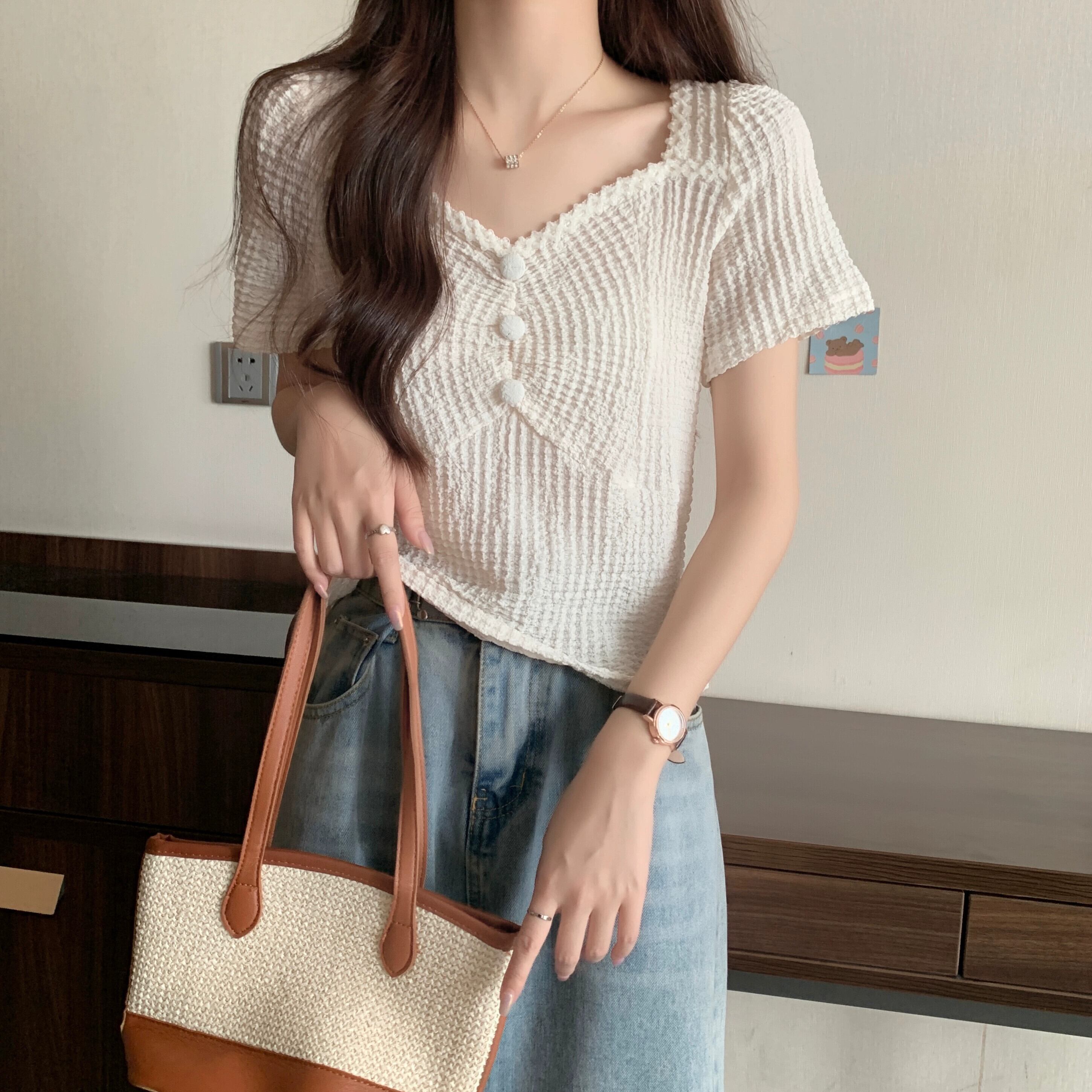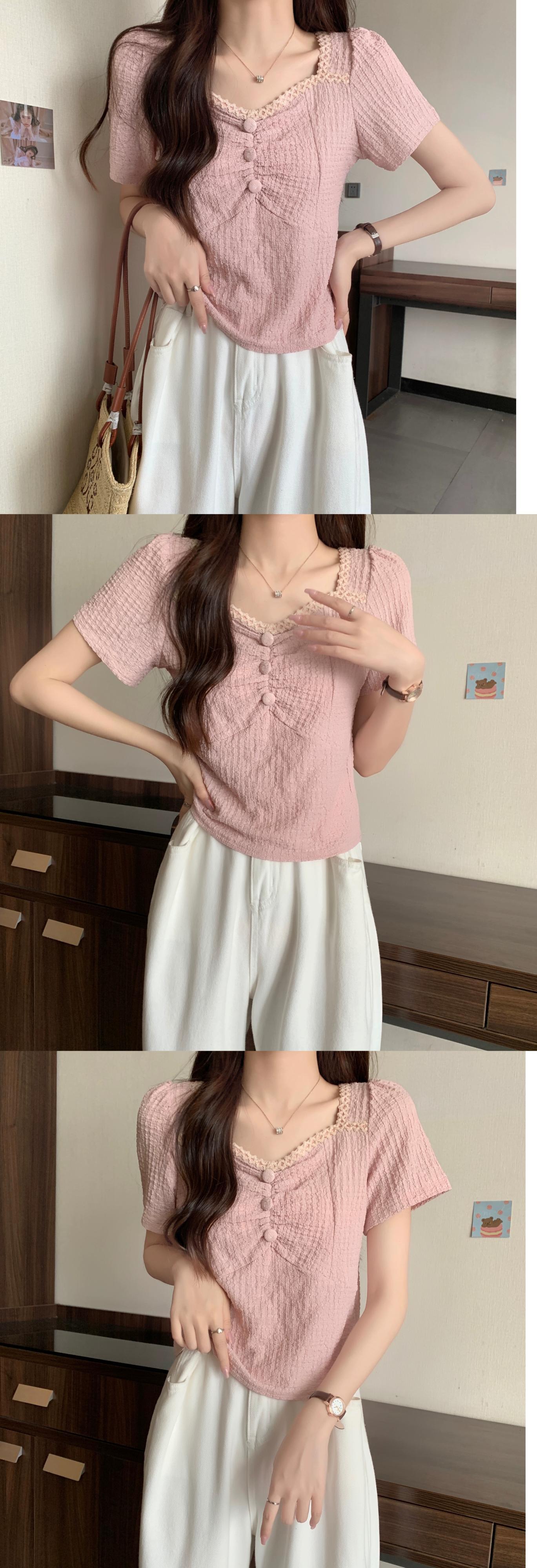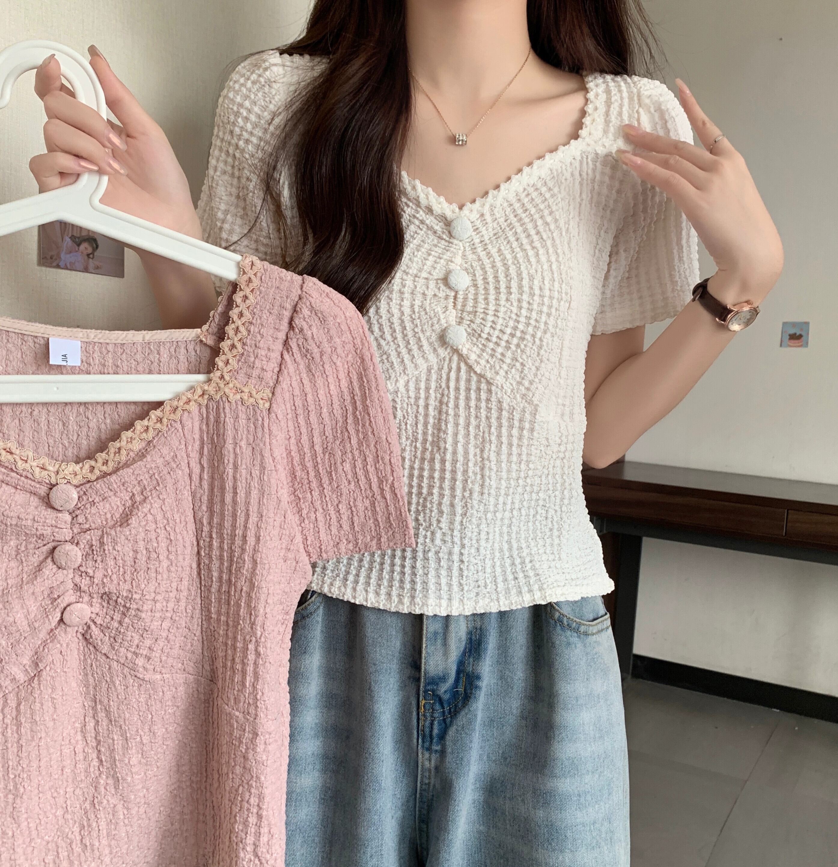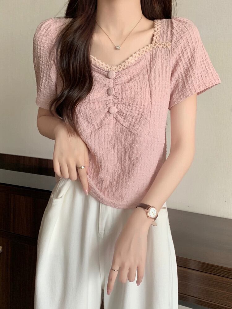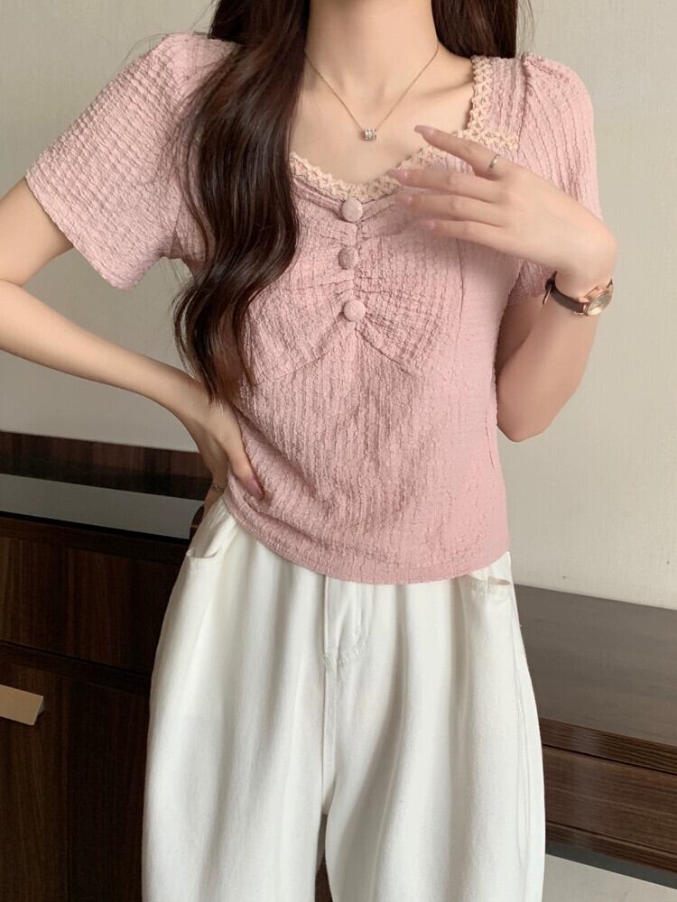 ピンクのショルダー半袖Tシャツレディース夏フレンチファッションデザイン自己修養の感覚とシックな短い質感のVネックトップ ショート サマー 夏物 7460075241360584 | framboise21