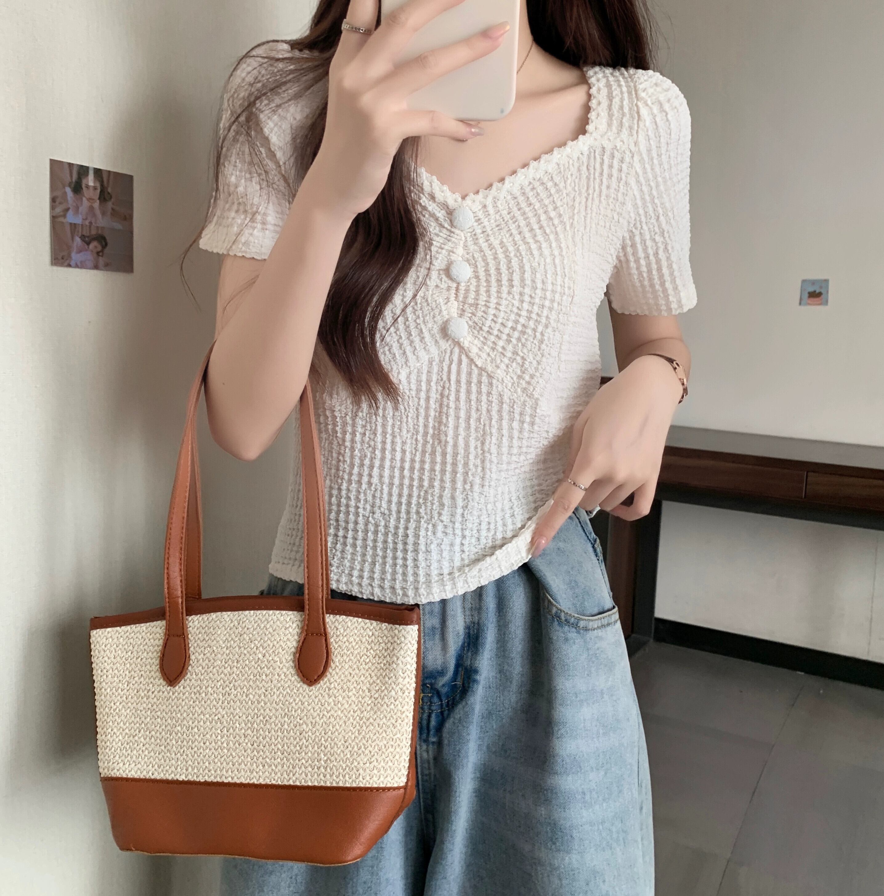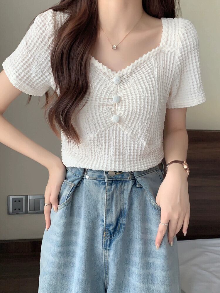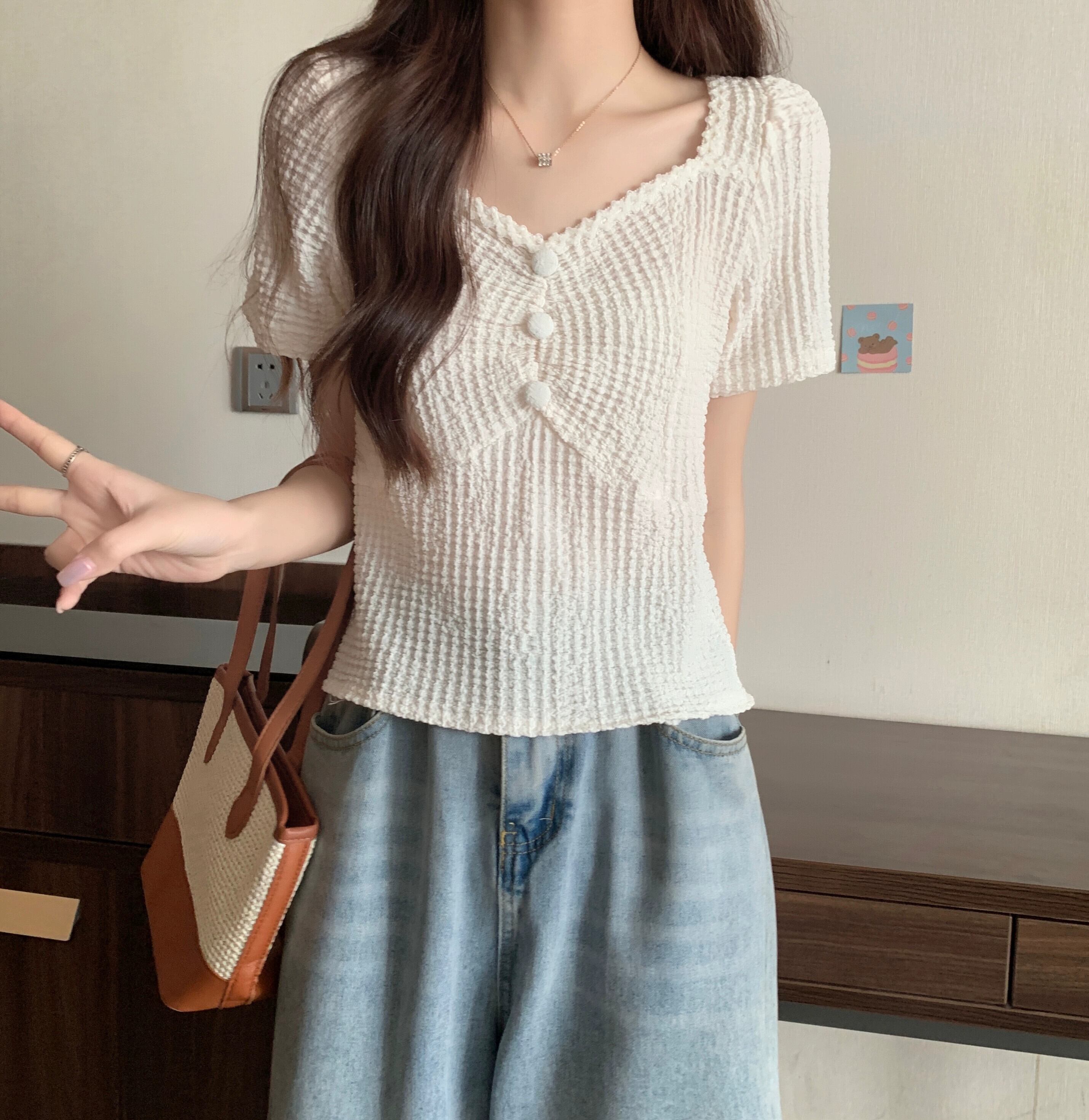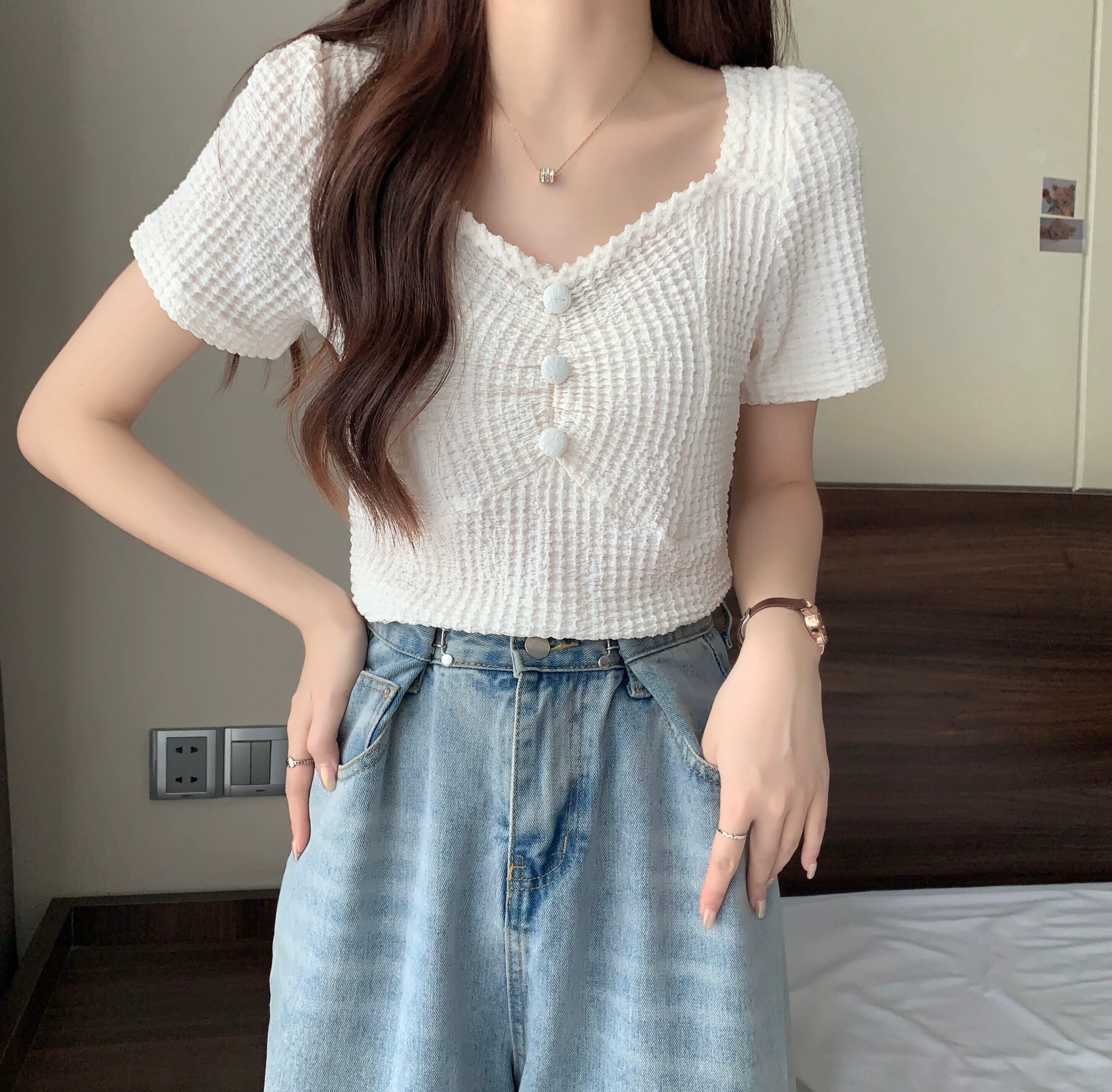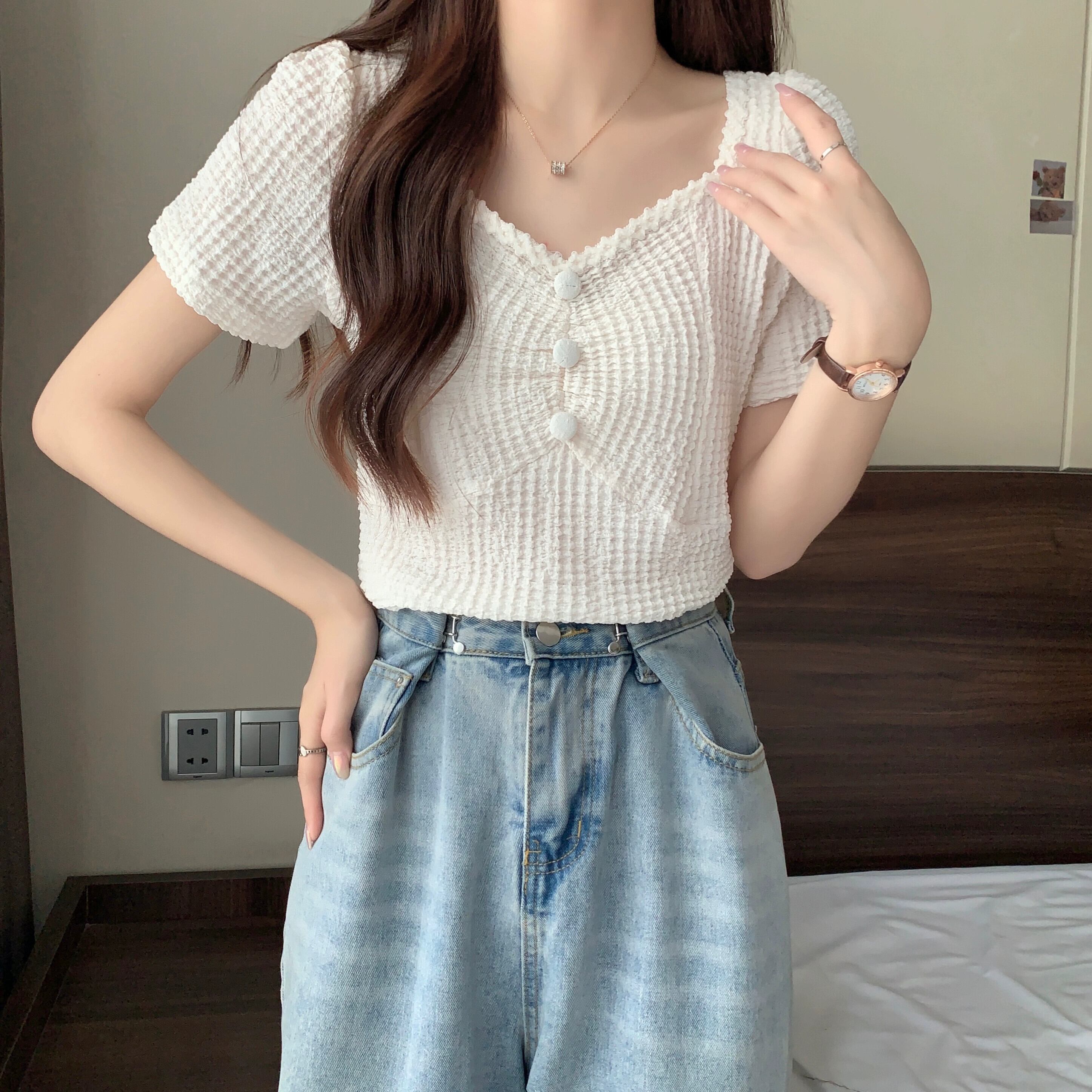 ピンクのショルダー半袖Tシャツレディース夏フレンチファッションデザイン自己修養の感覚とシックな短い質感のVネックトップ ショート サマー 夏物 7460075241360584 | framboise21