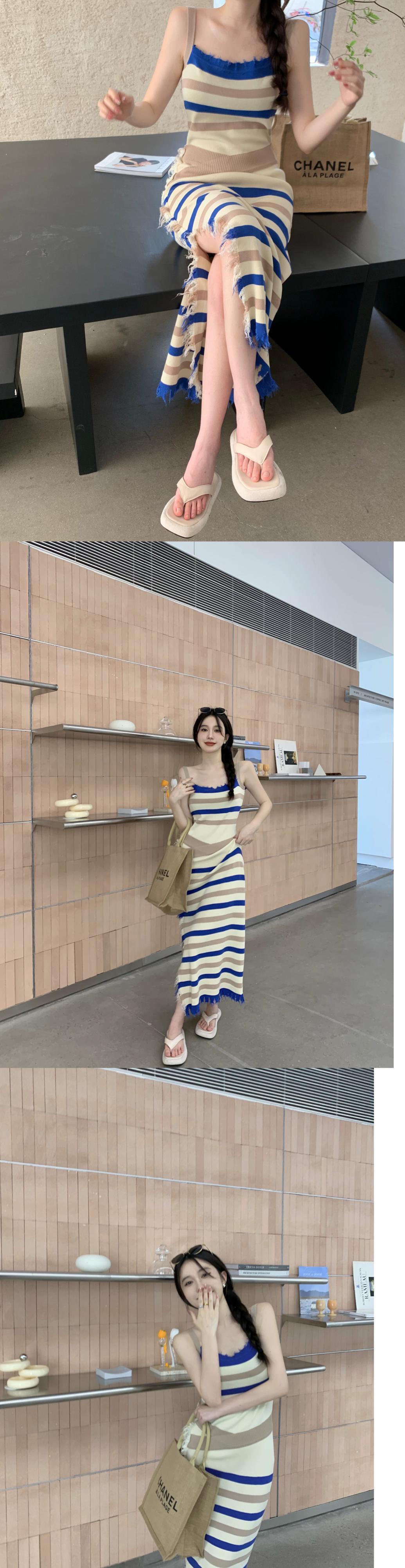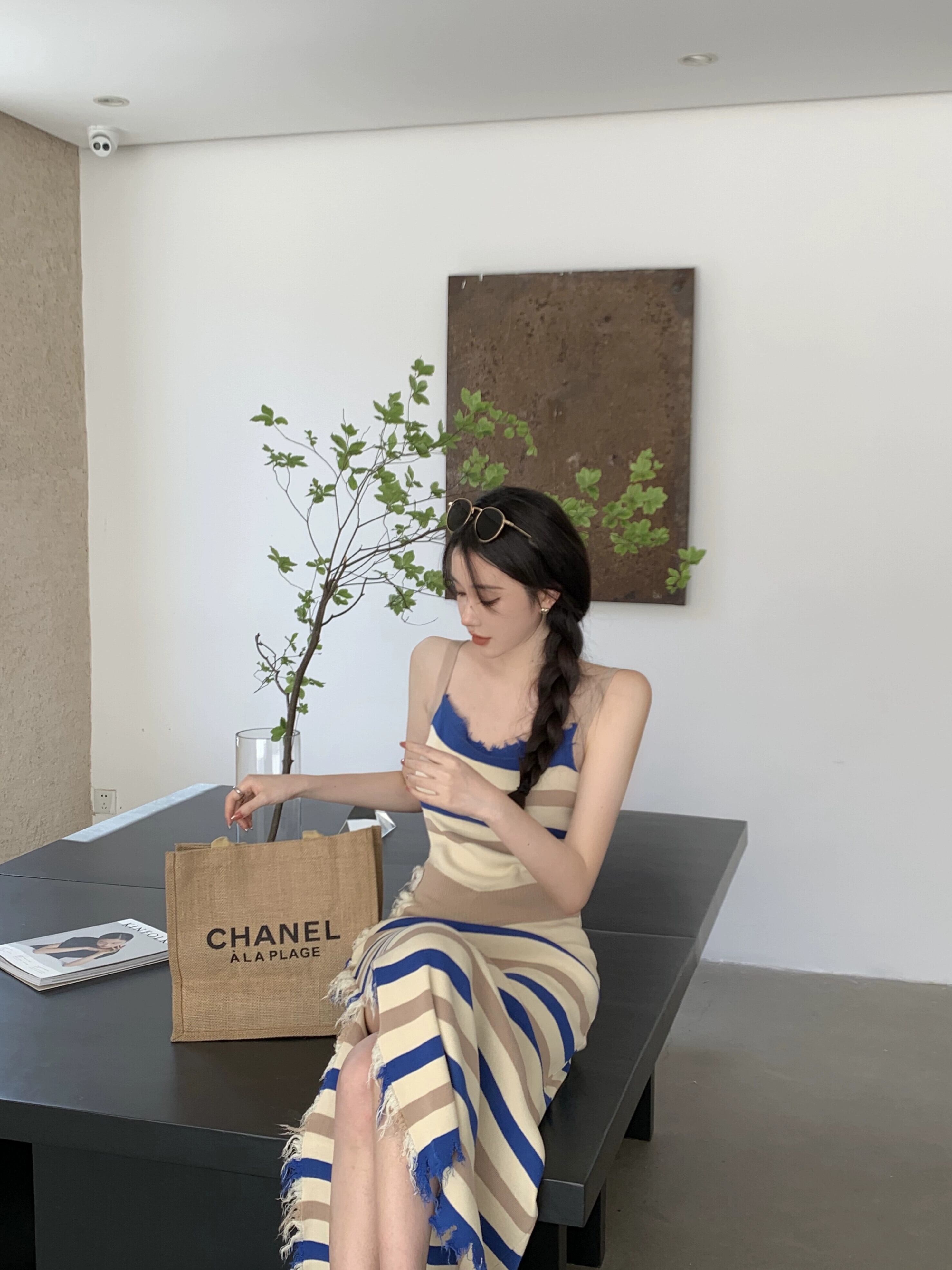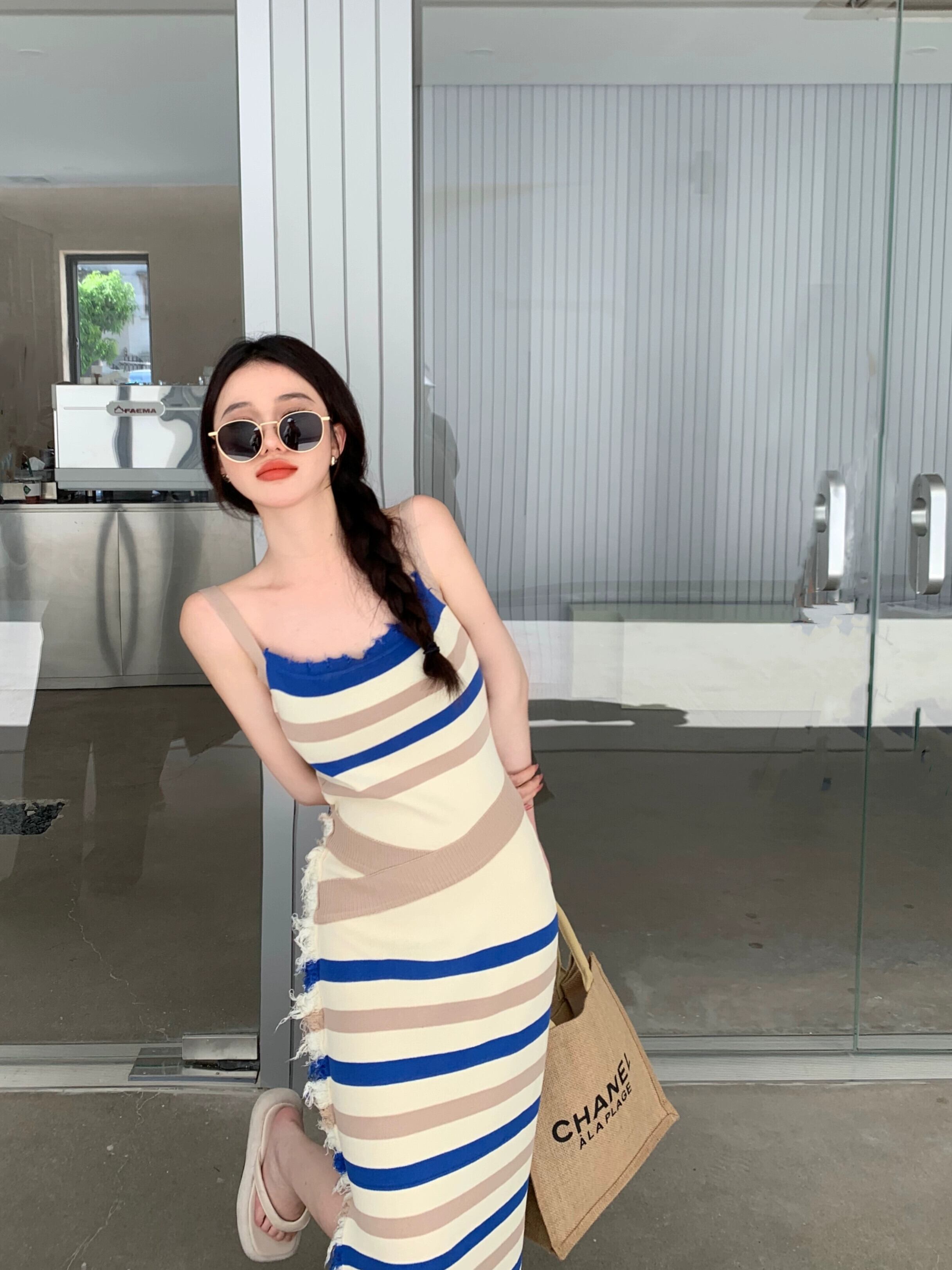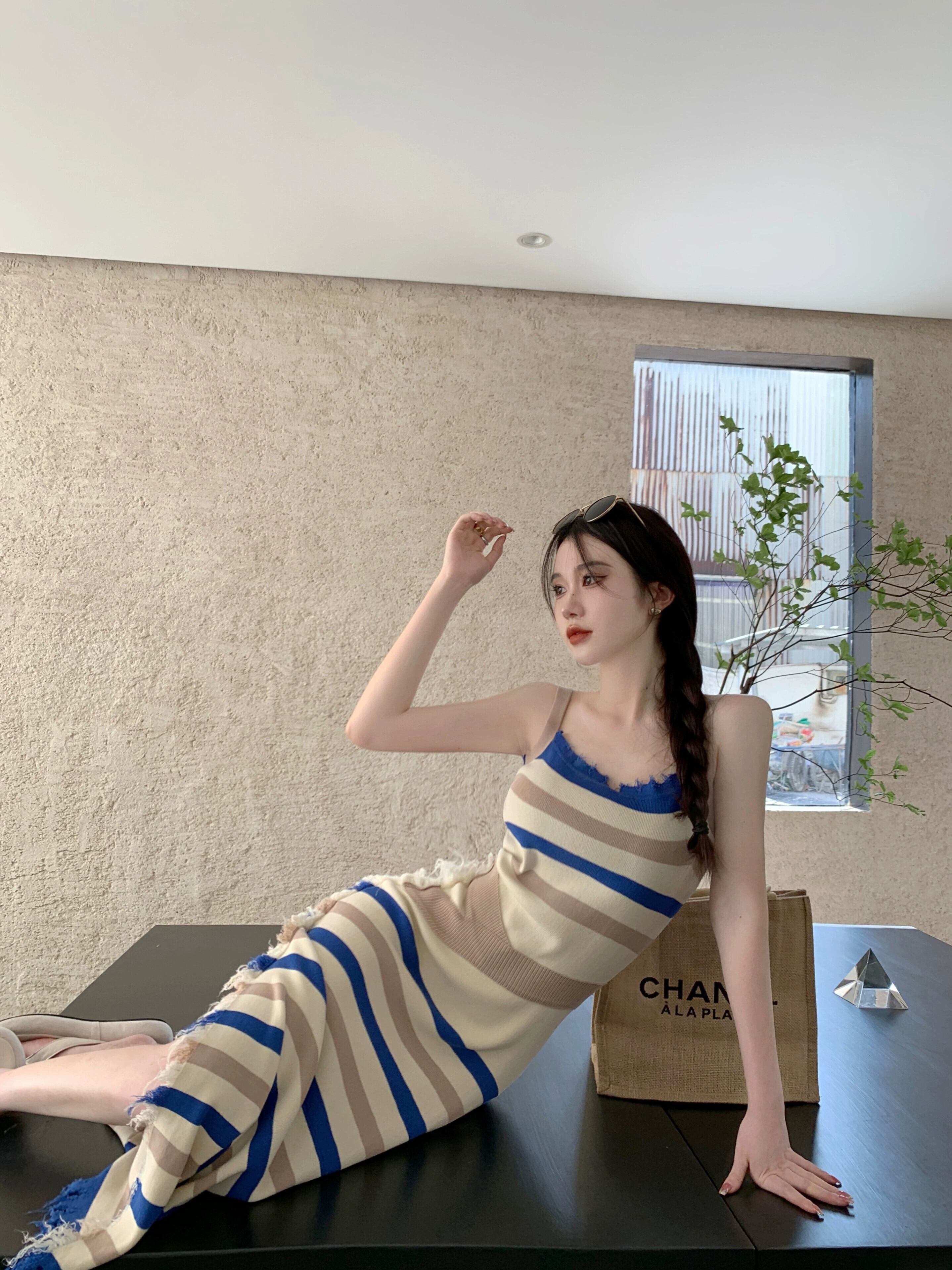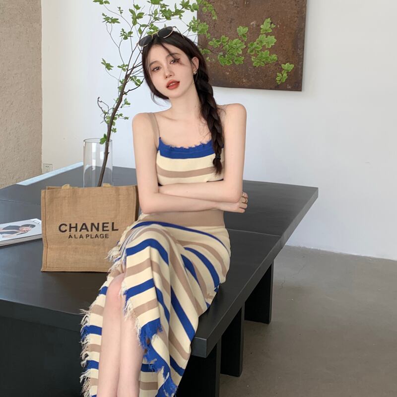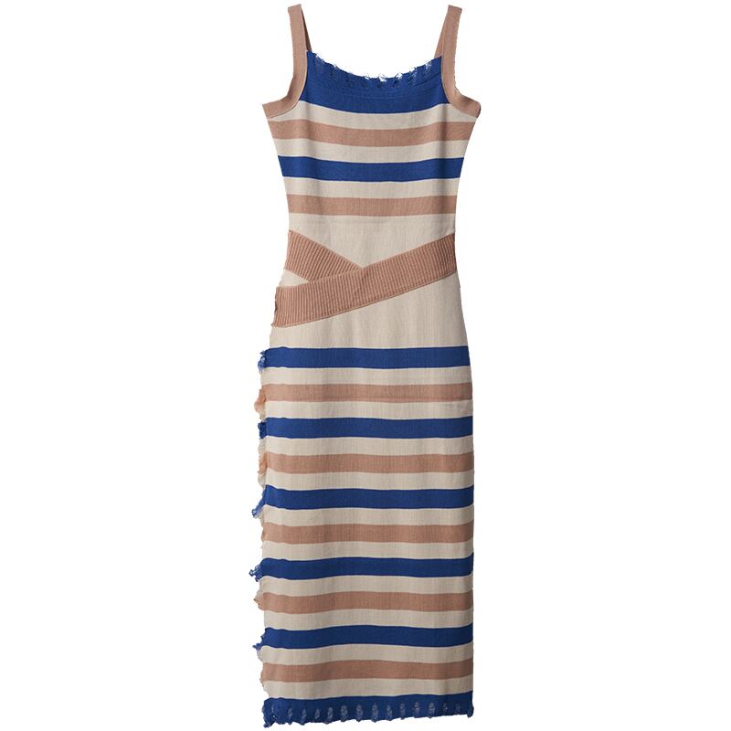 ストライプサスペンダードレスレディース夏デザインセンスファッションセクシーなノースリーブフリンジドレススリットウエストスカートトレンディ サマー 夏物 7460051012160227 | framboise21