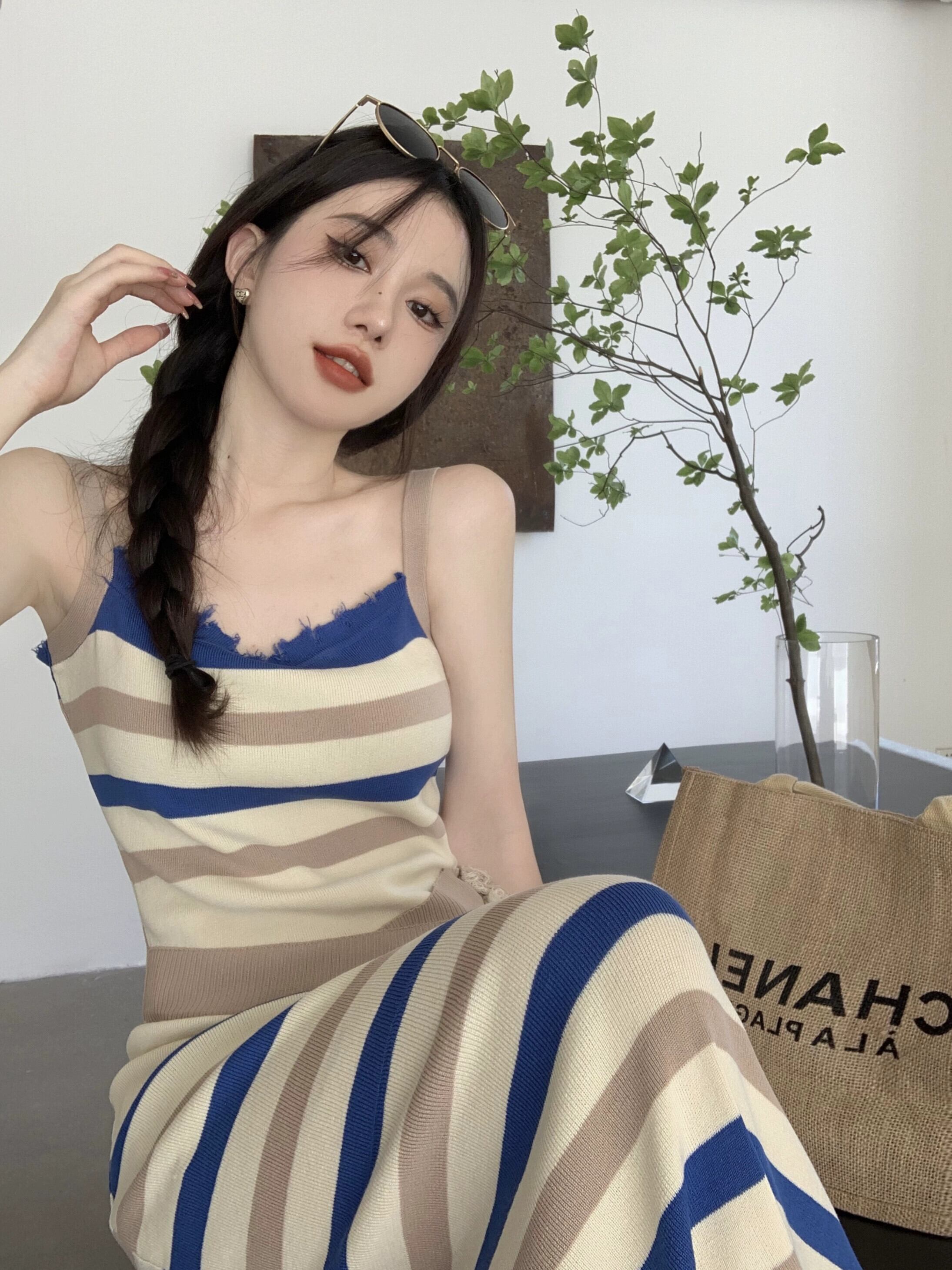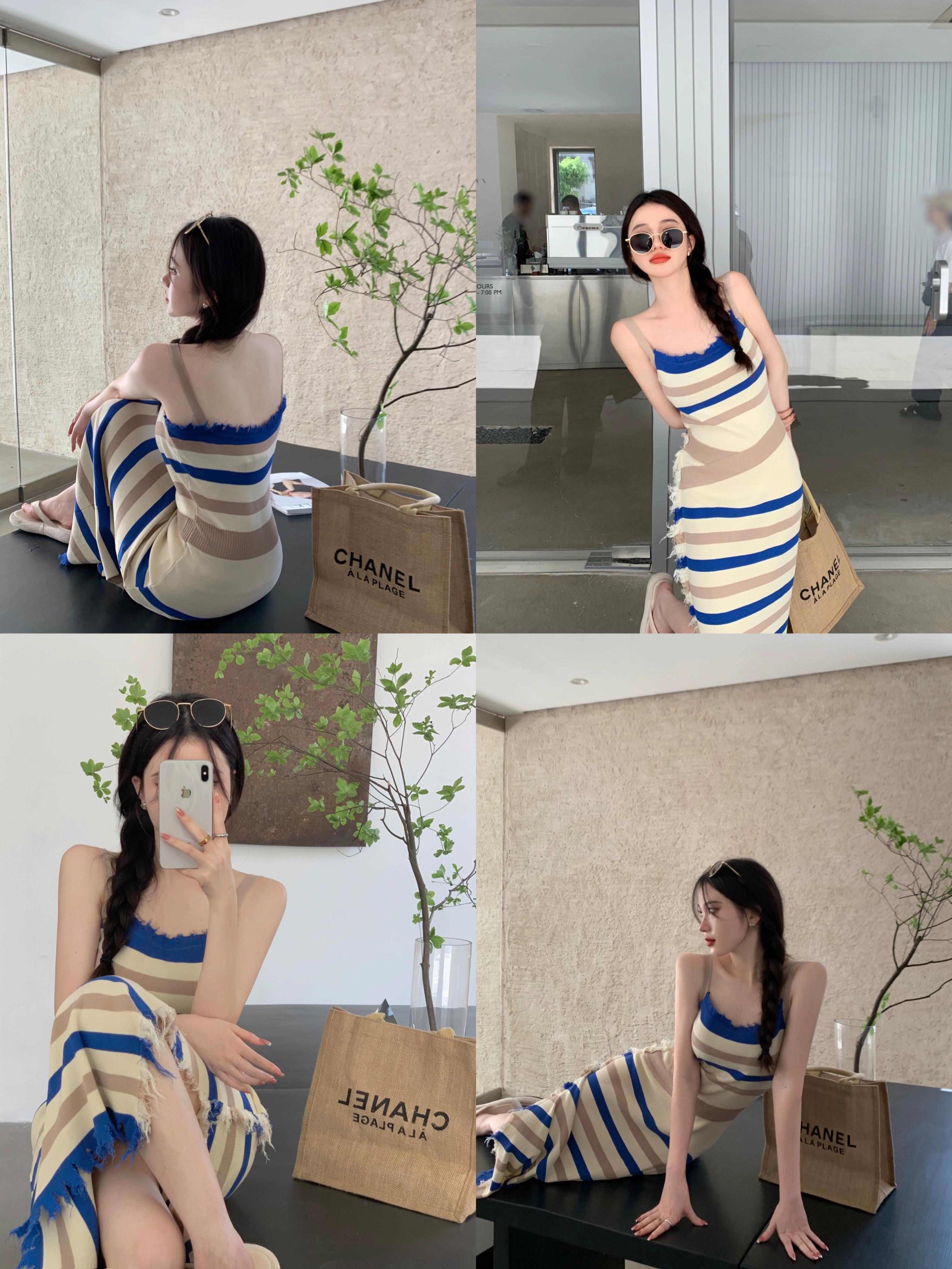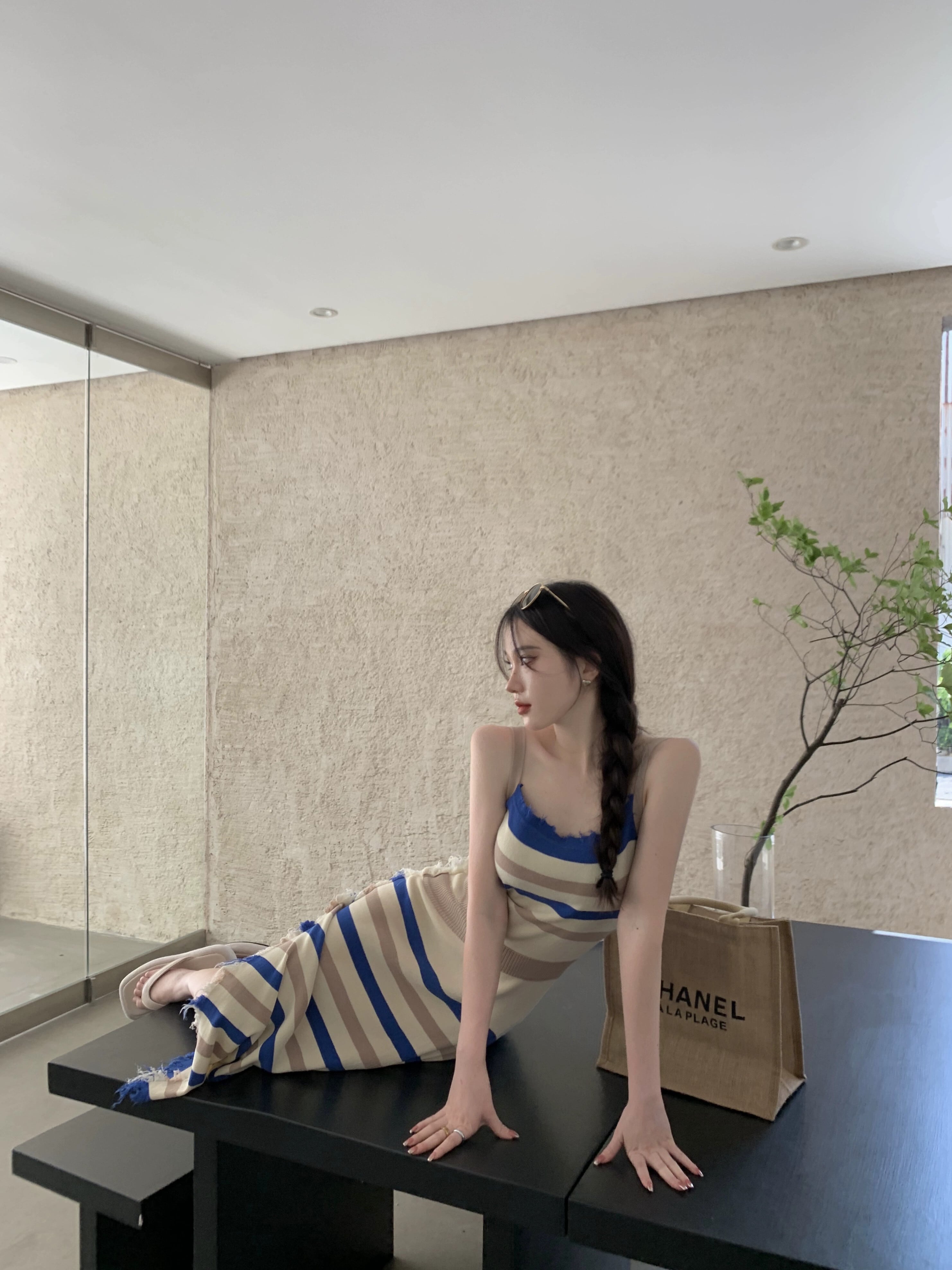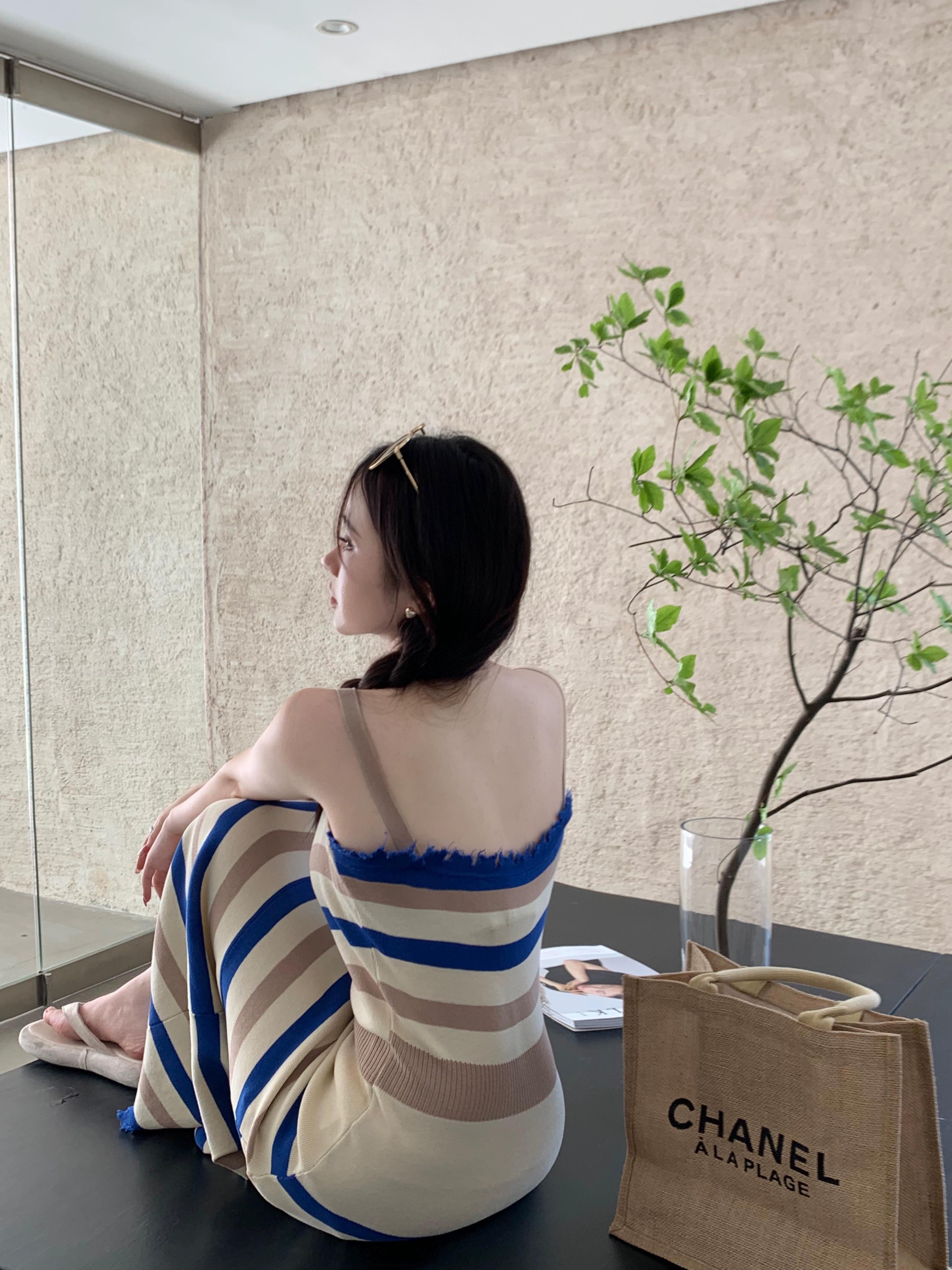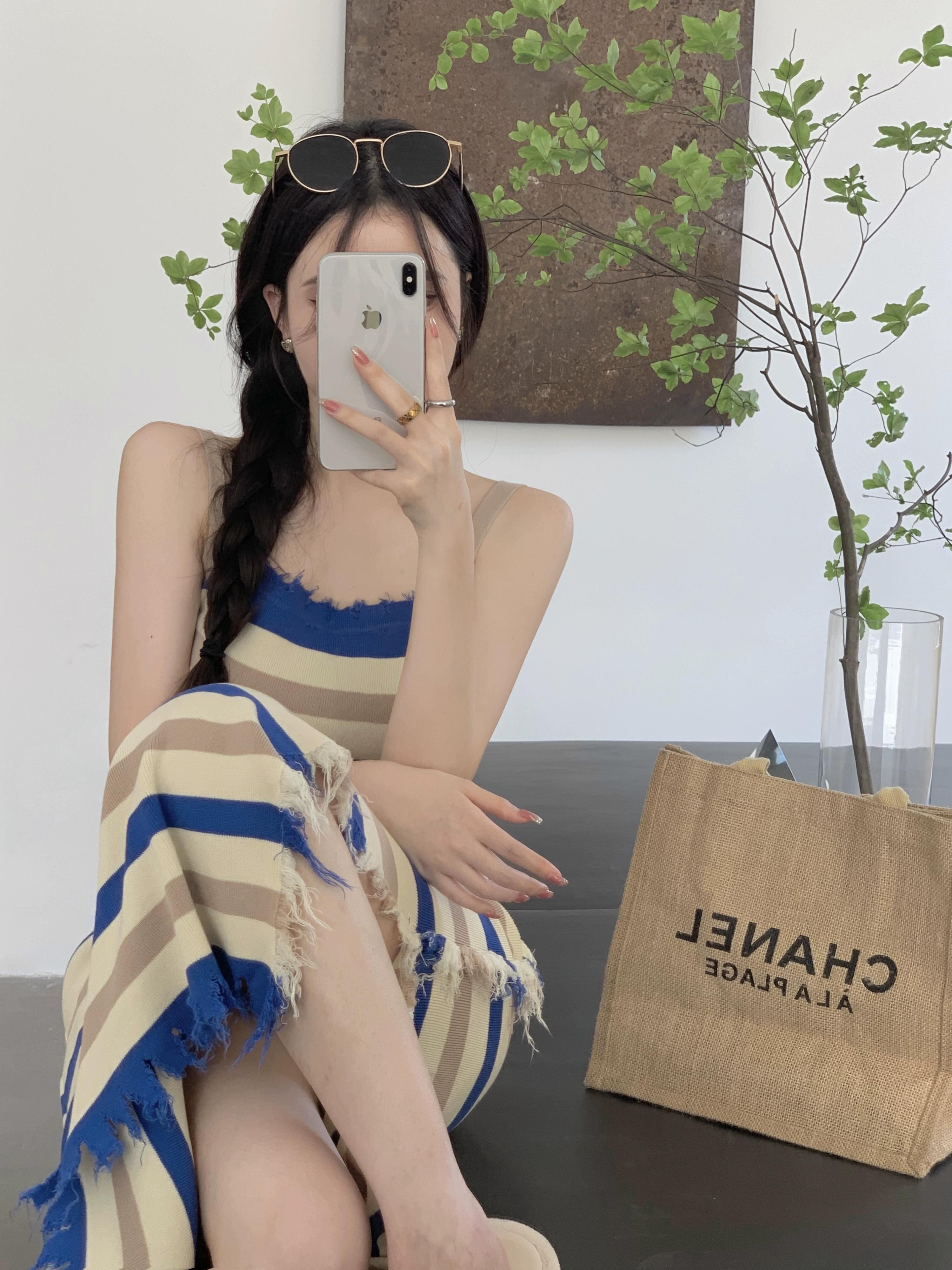 ストライプサスペンダードレスレディース夏デザインセンスファッションセクシーなノースリーブフリンジドレススリットウエストスカートトレンディ サマー 夏物 7460051012160227 | framboise21