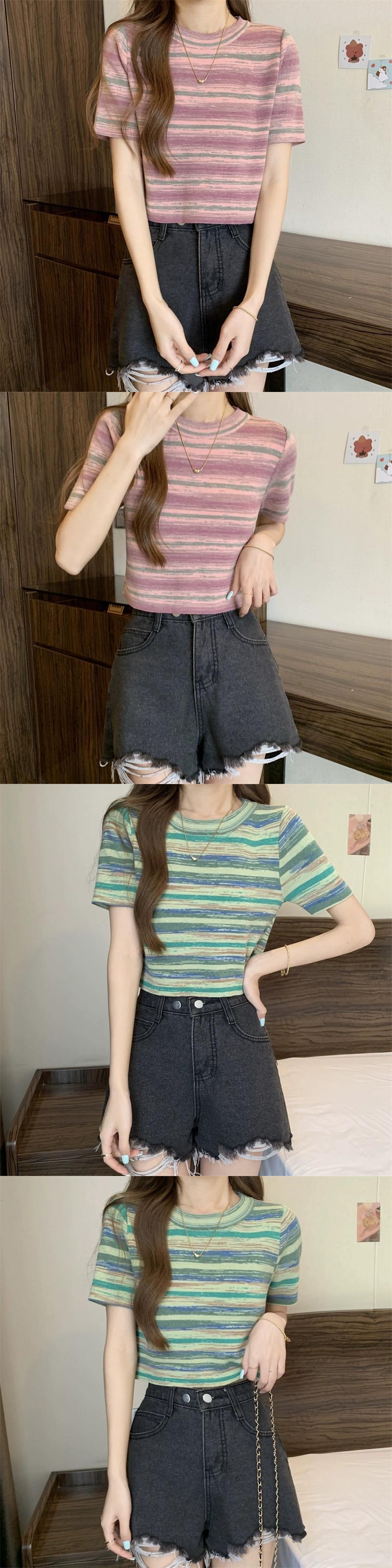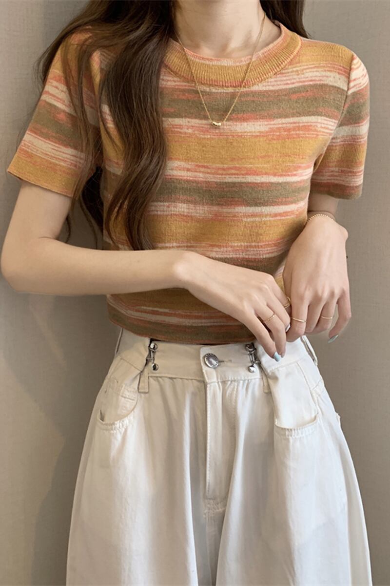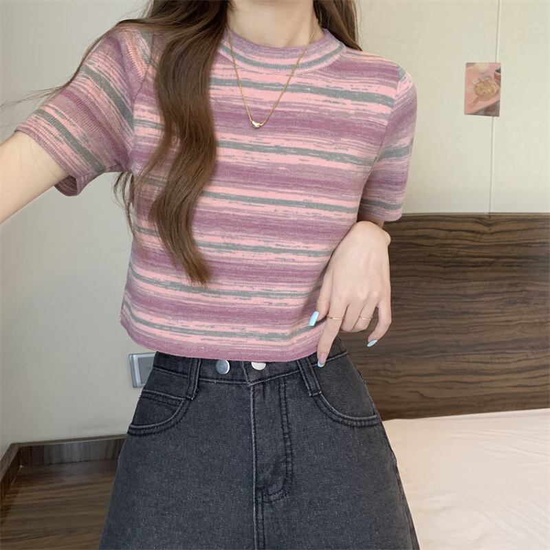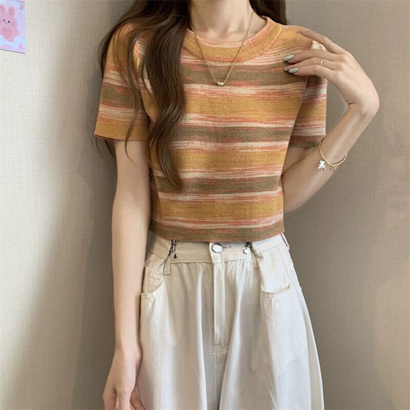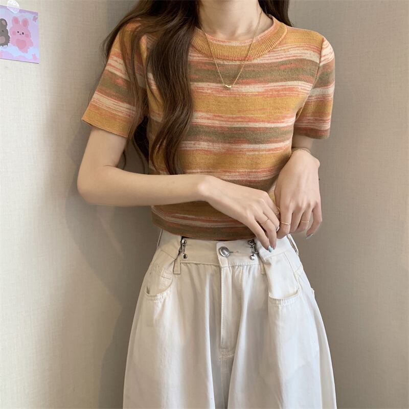 グラデーションストライプニット半袖Tシャツレディース夏シックなレトロデザイン自己修養の感覚と薄い短いアイスシルクトップ ショート サマー 夏物 7460078709575290 | framboise21