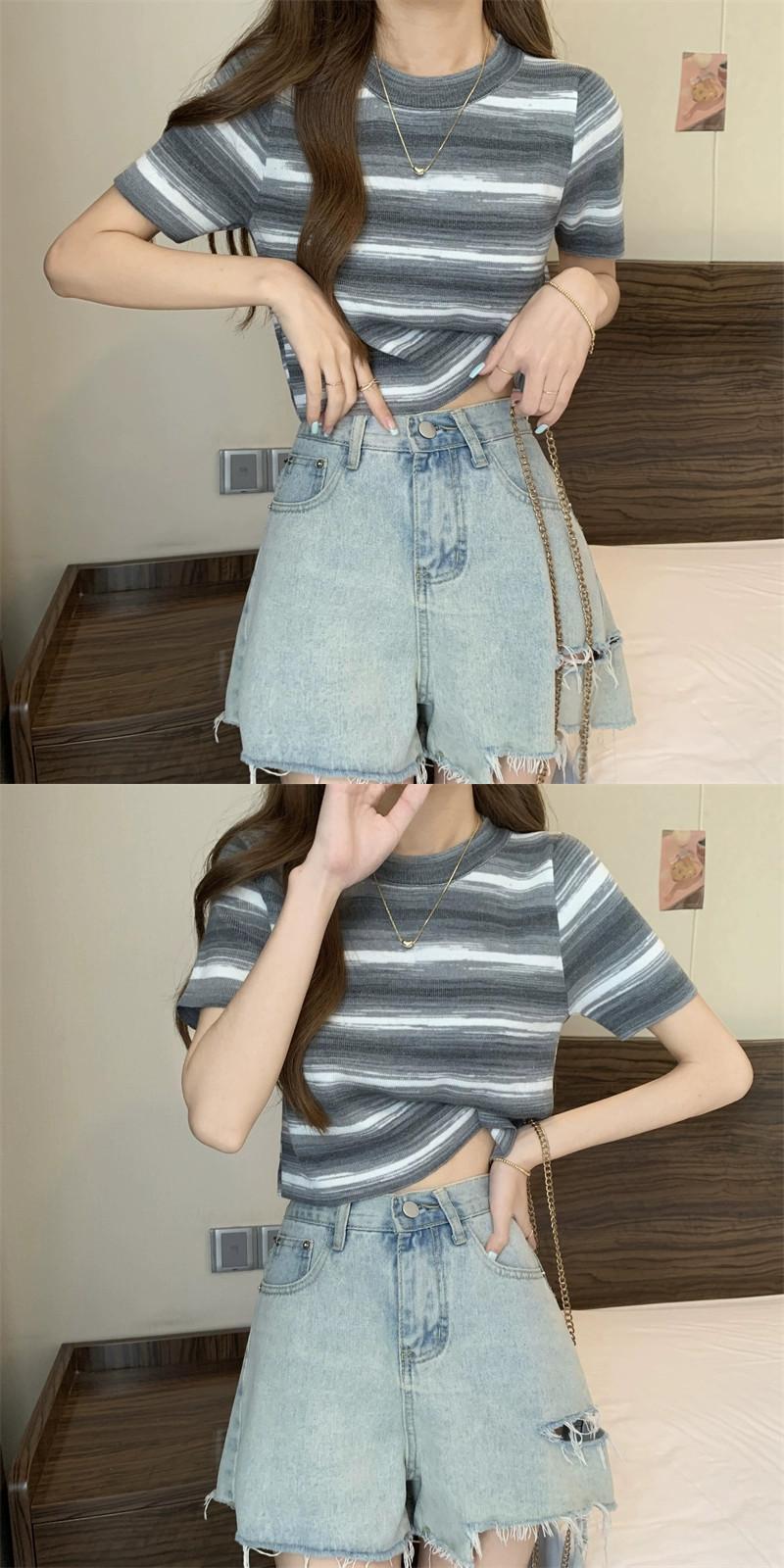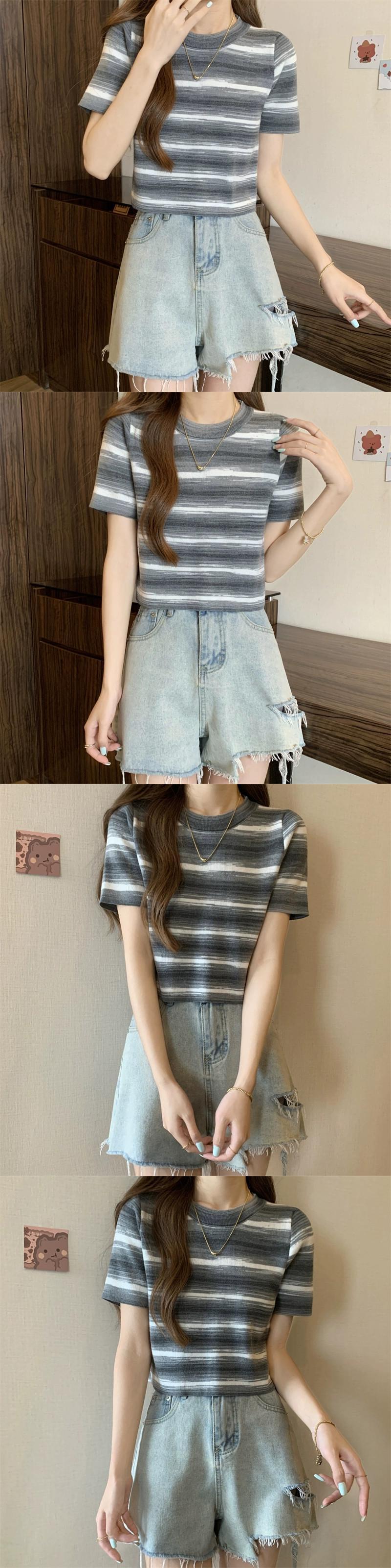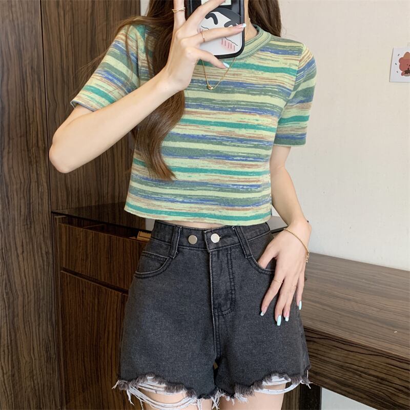 グラデーションストライプニット半袖Tシャツレディース夏シックなレトロデザイン自己修養の感覚と薄い短いアイスシルクトップ ショート サマー 夏物 7460078709575290 | framboise21