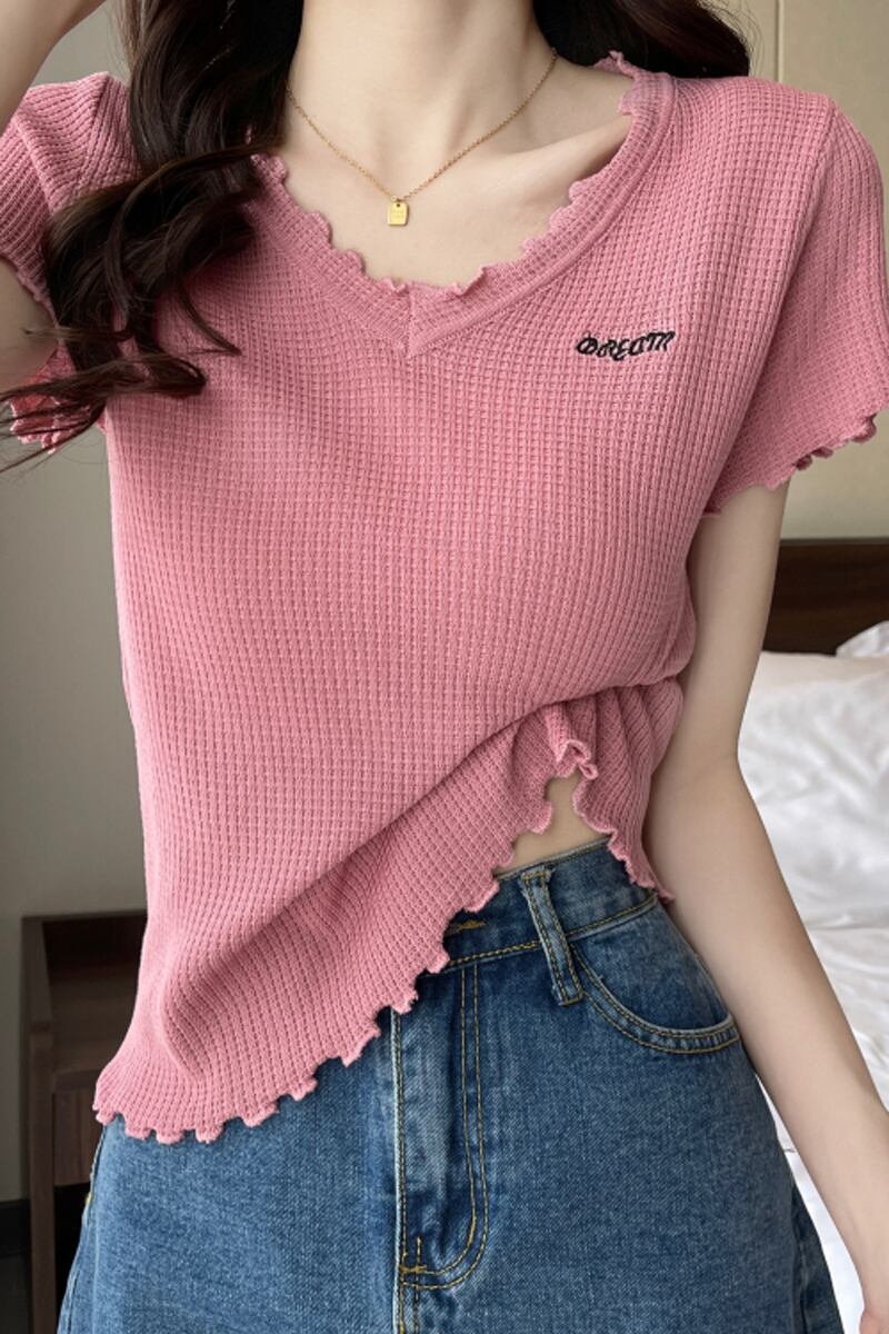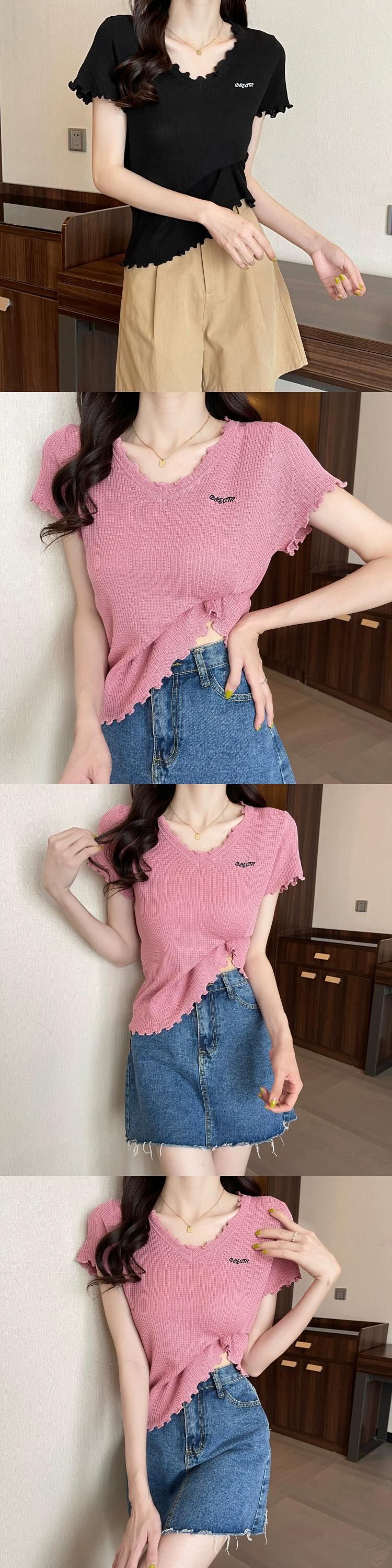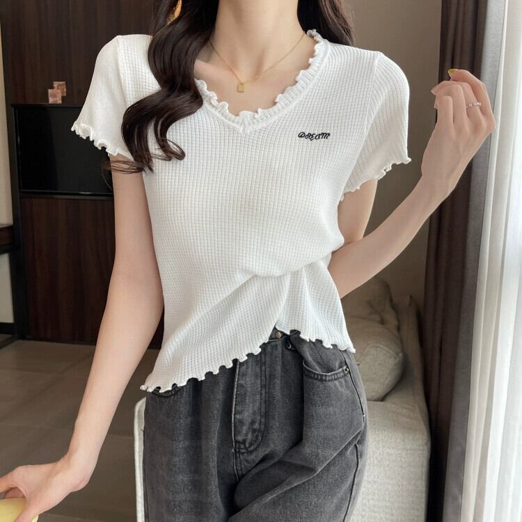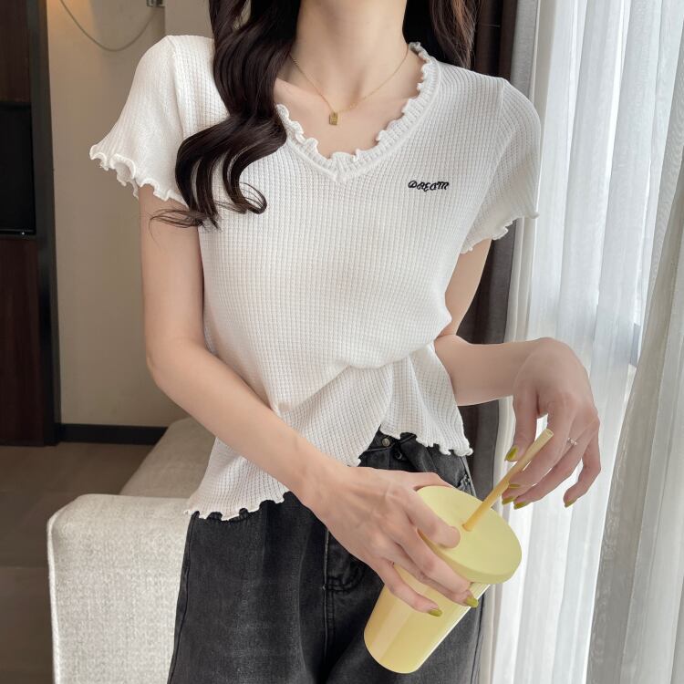 薄氷シルクニット半袖 Tシャツ女性の夏のファッションデザインオールマッチフロントショルダーショート木耳エッジ V ネックトップ サマー 夏物 Vネック 7460088323780024 | framboise21