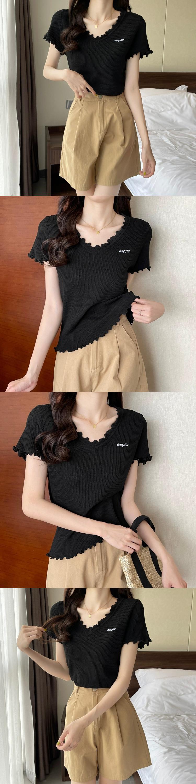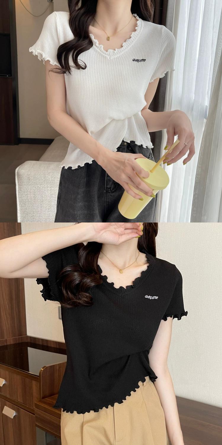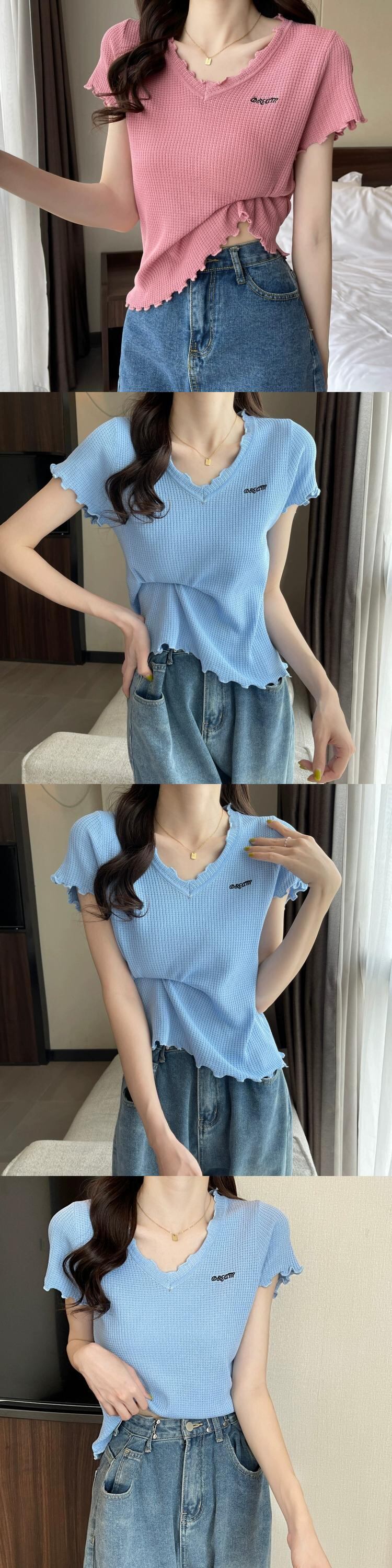 薄氷シルクニット半袖 Tシャツ女性の夏のファッションデザインオールマッチフロントショルダーショート木耳エッジ V ネックトップ サマー 夏物 Vネック 7460088323780024 | framboise21
