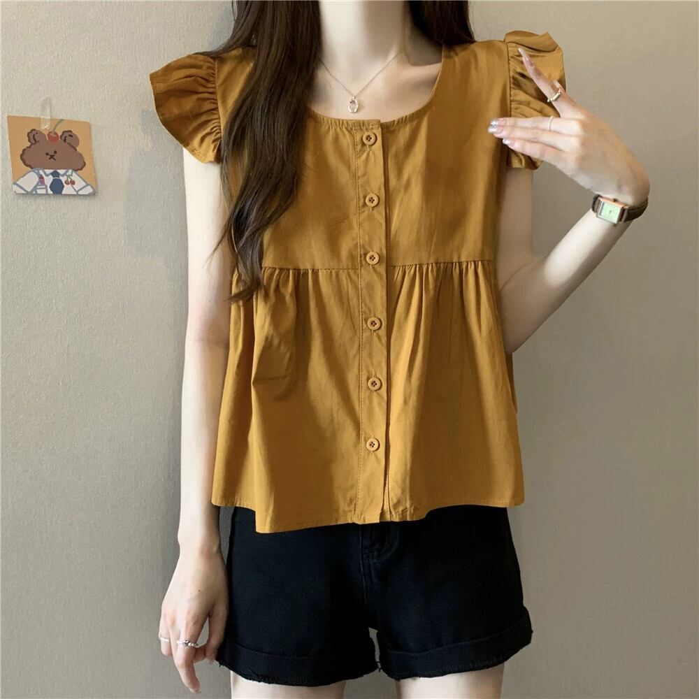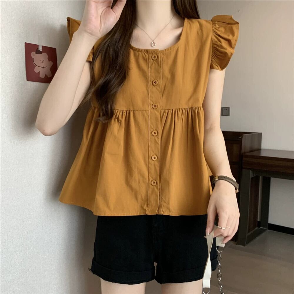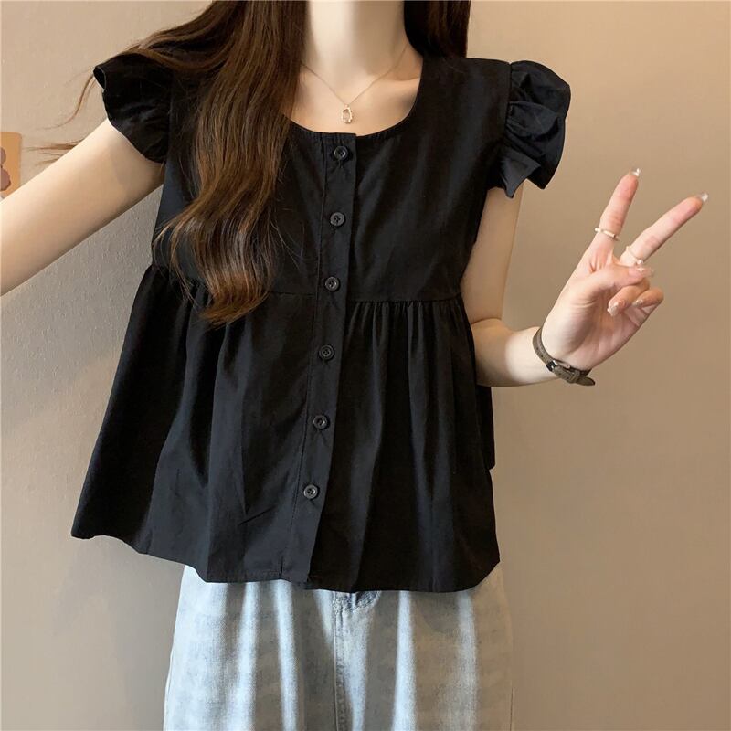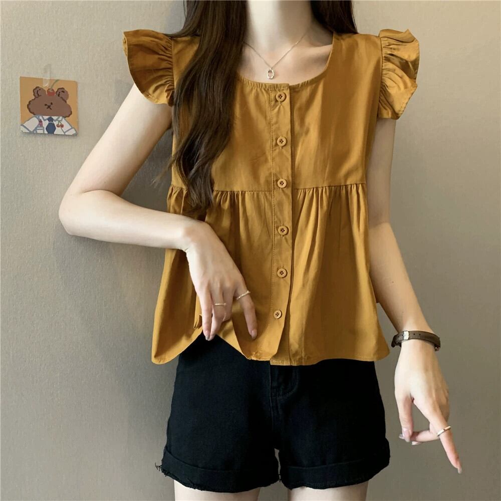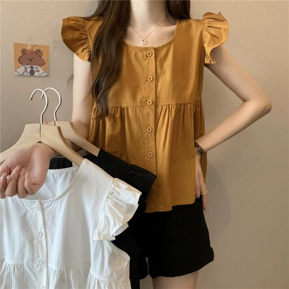 小さなフライングスリーブドールシャツトップスレディース夏フレンチシックなデザイン感ゆったりオールマッチフリルノースリーブシャツブラック サマー 夏物 7460035441636005 | framboise21