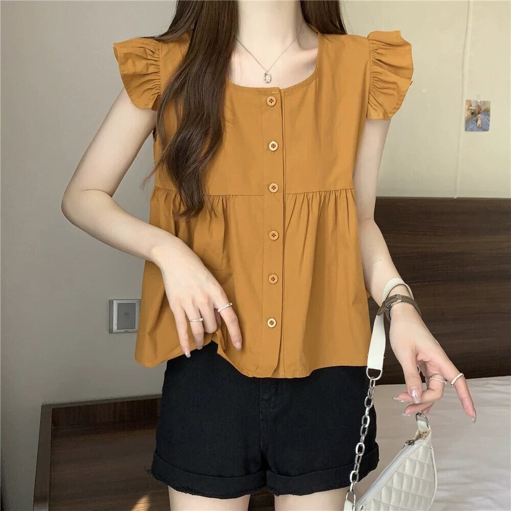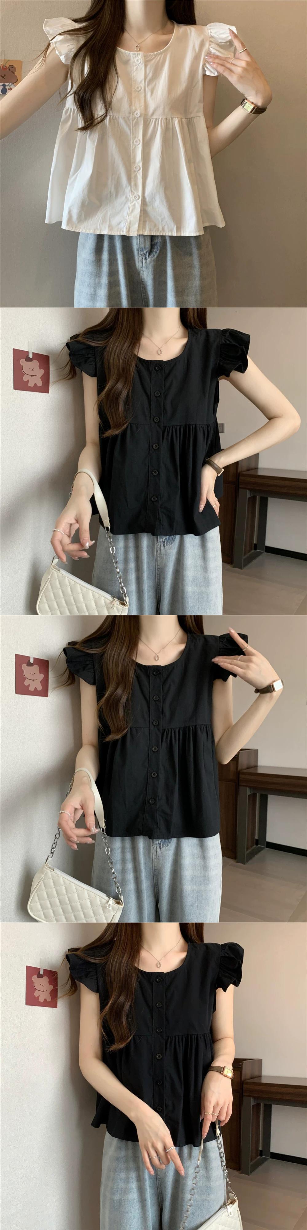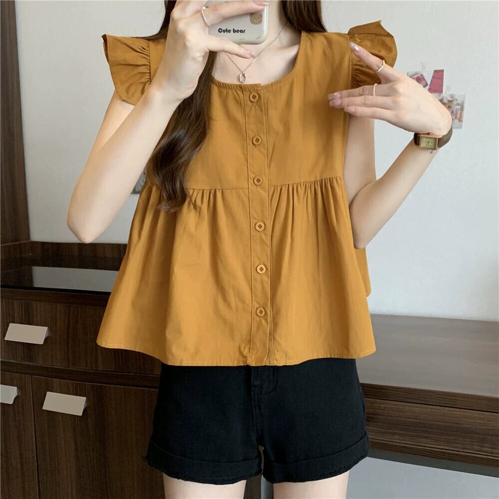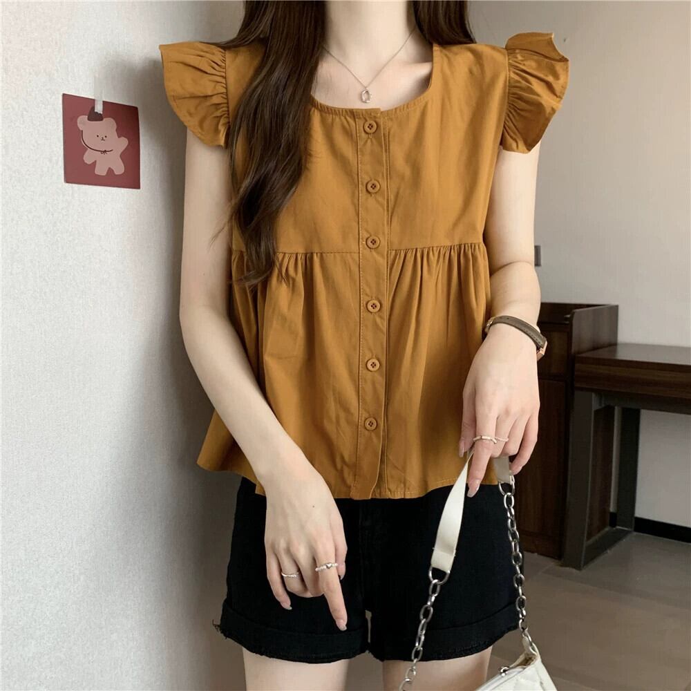 小さなフライングスリーブドールシャツトップスレディース夏フレンチシックなデザイン感ゆったりオールマッチフリルノースリーブシャツブラック サマー 夏物 7460035441636005 | framboise21