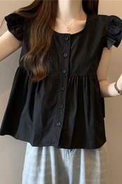 小さなフライングスリーブドールシャツトップスレディース夏フレンチシックなデザイン感ゆったりオールマッチフリルノースリーブシャツブラック サマー 夏物 7460035441636005