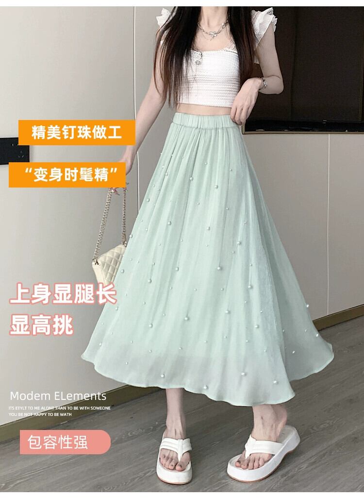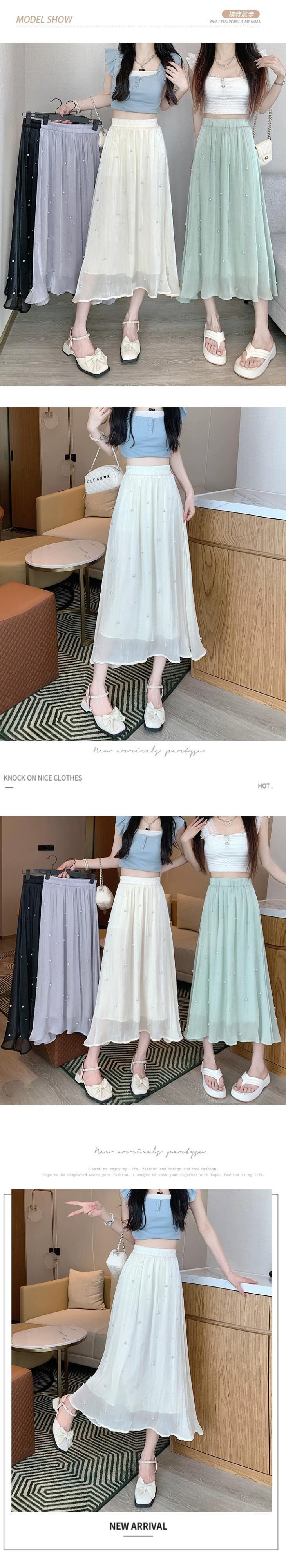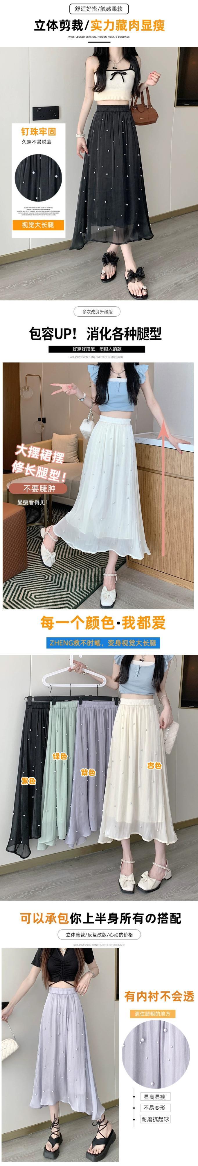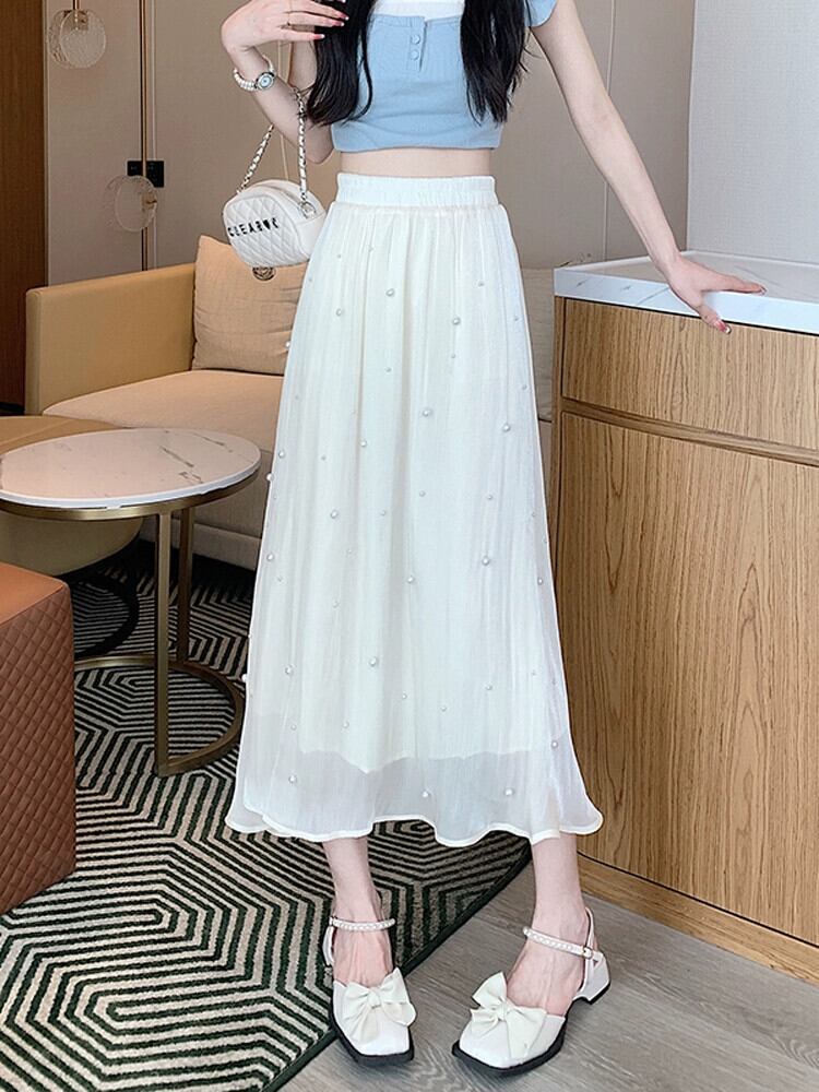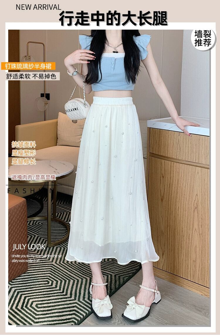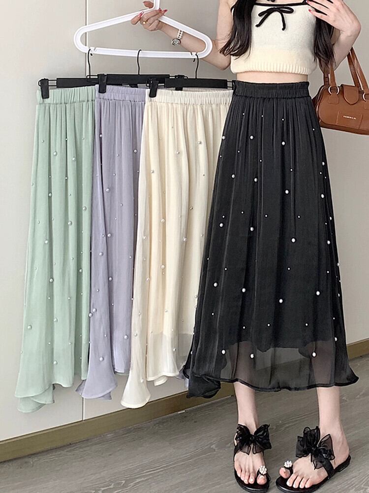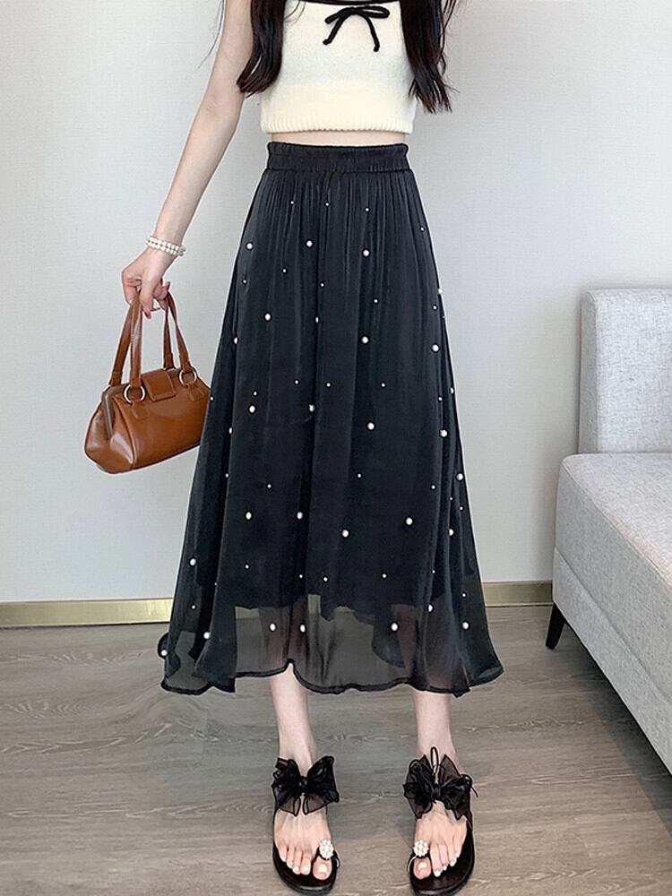 ブラックメッシュスカートレディース夏のハイエンドデザインビーズガーゼスカートハイウエストスリムミドル丈Aラインスカート ハイウェスト サマー 夏物 7460023090646050 | framboise21
