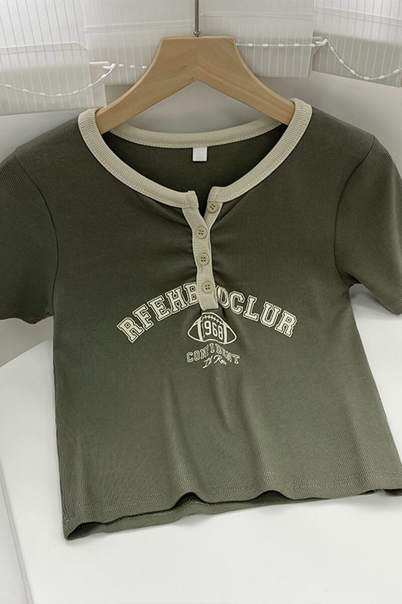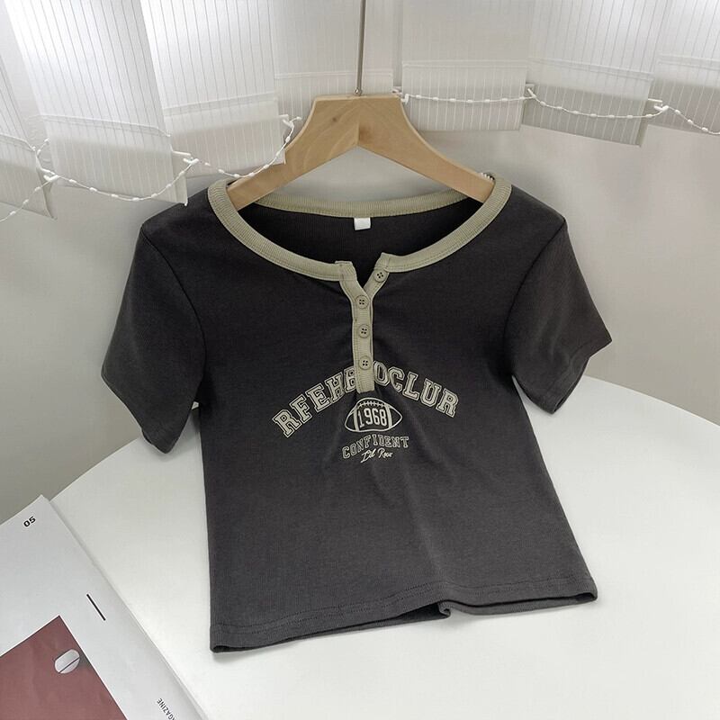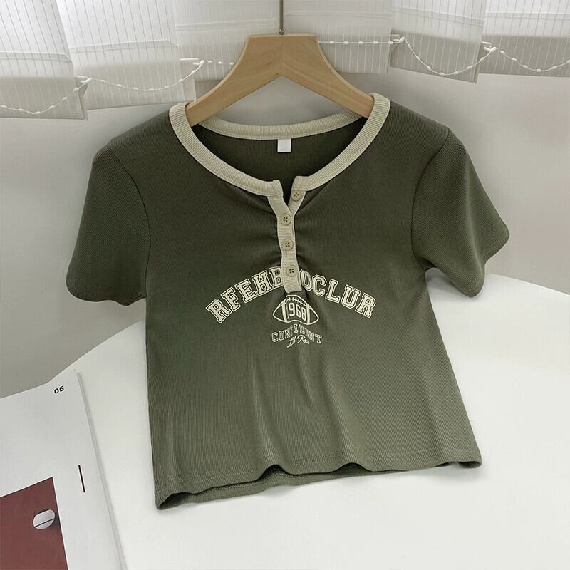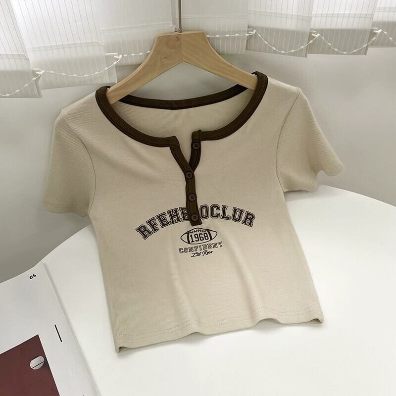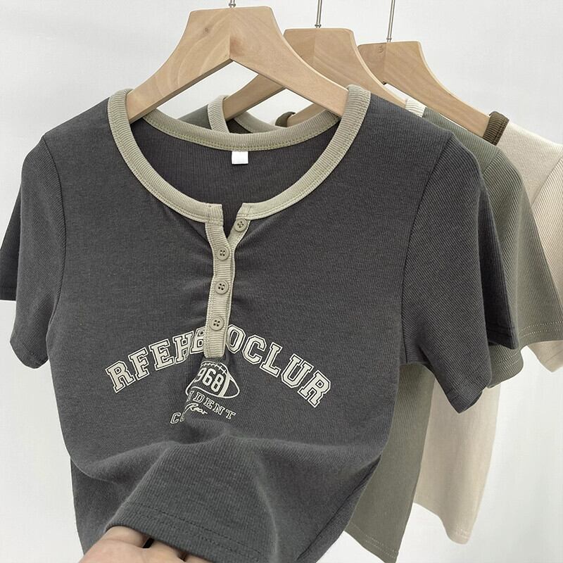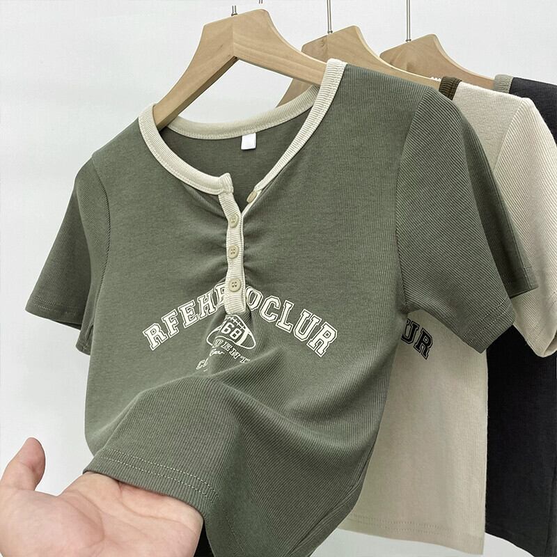 コットンフロントショルダー半袖Tシャツレディース2023夏新作小男ヒットカラーVネックアメリカンプリントショートトップトレンド サマー 夏物 7460052630180809 | framboise21