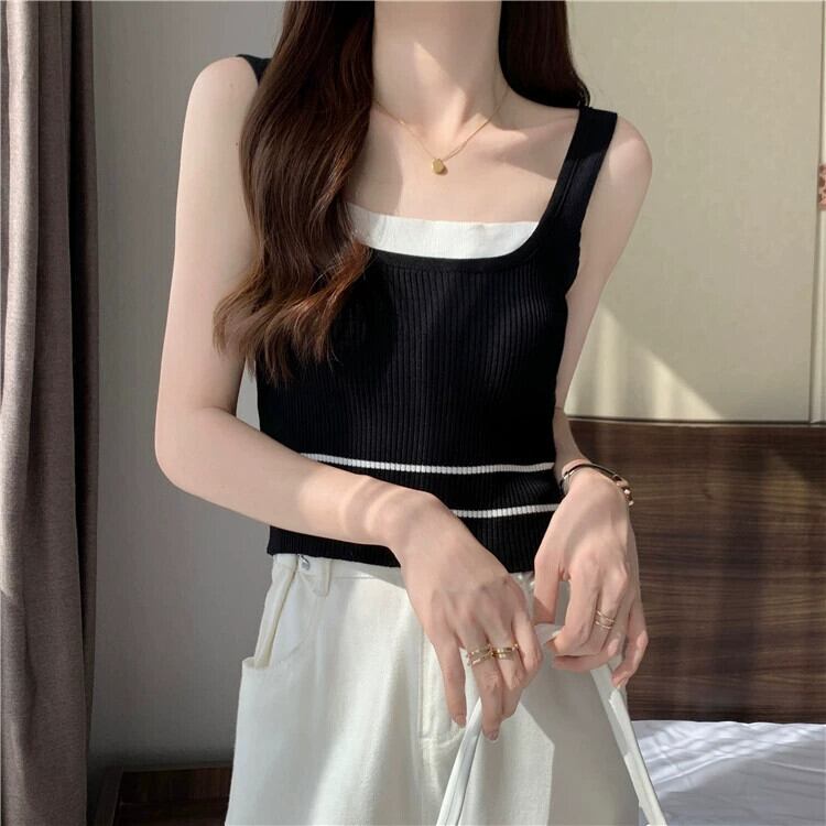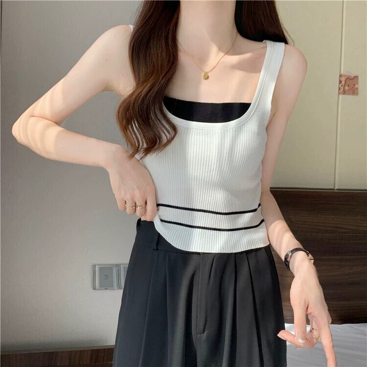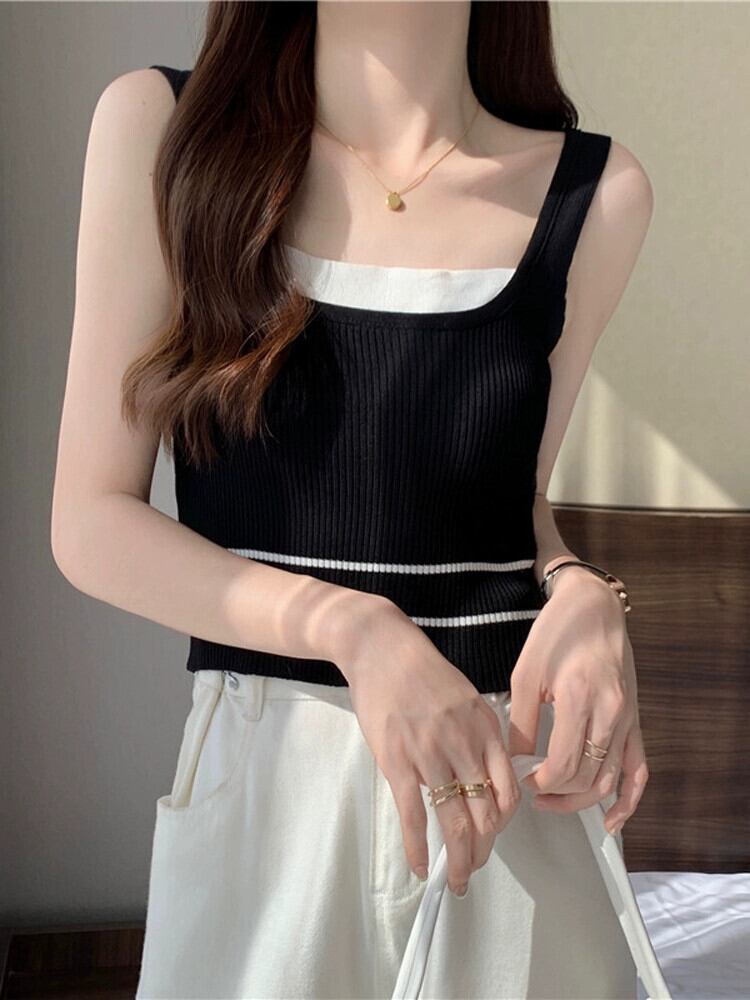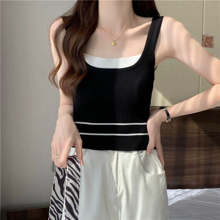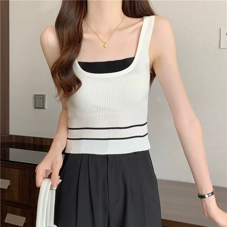 ワイドショルダーストラップフェイクツーピースベストサスペンダー女性の夏のインナーファッションアインスタイルアウターウェアスリムフィットショートノースリーブニットトップ 半袖 ハーフスリーブ サマー 夏物 7460050602229340 | framboise21