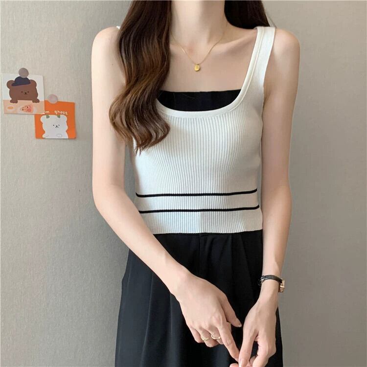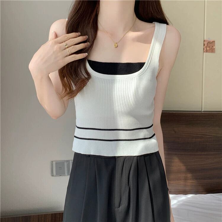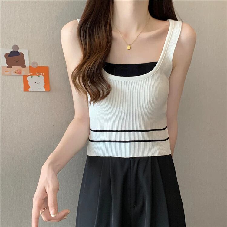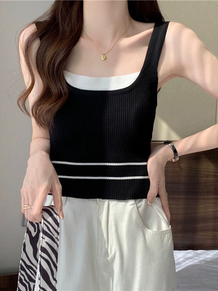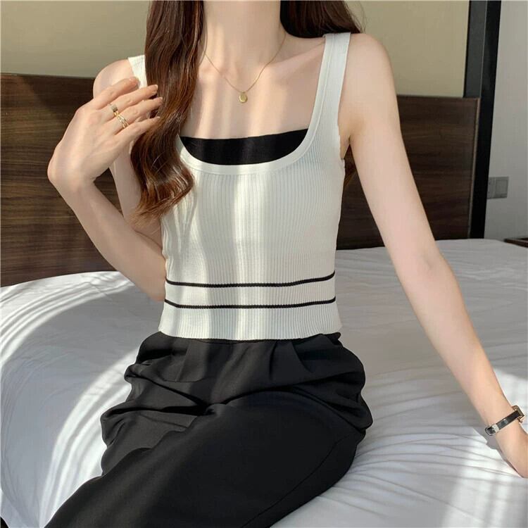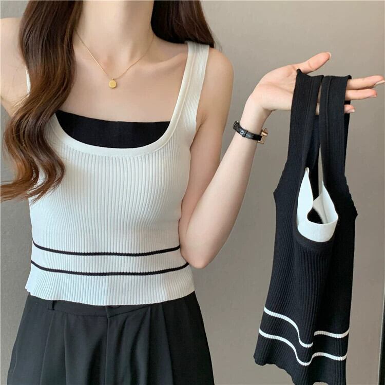 ワイドショルダーストラップフェイクツーピースベストサスペンダー女性の夏のインナーファッションアインスタイルアウターウェアスリムフィットショートノースリーブニットトップ 半袖 ハーフスリーブ サマー 夏物 7460050602229340 | framboise21