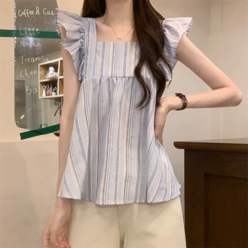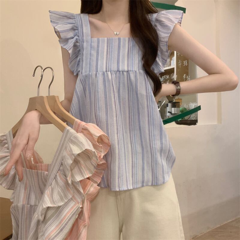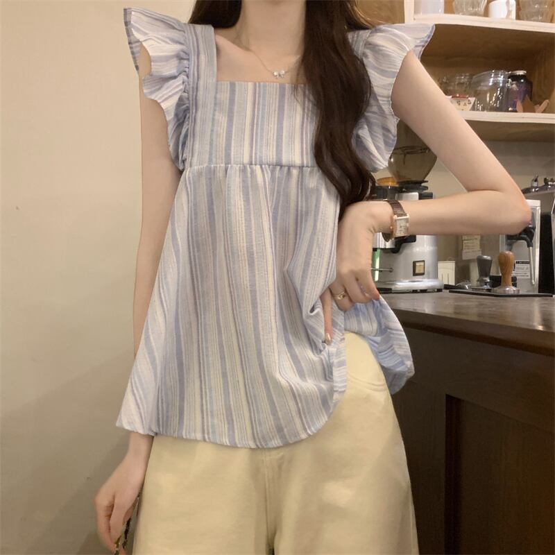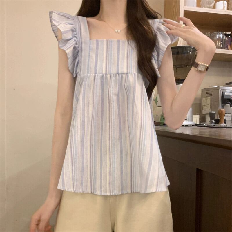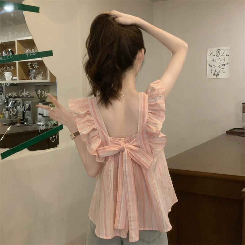 ゆったりブルーストライプキャミソールレディース夏デザインセンスアウターオープンバックちょう結びスクエアカラー小フライングスリーブトップ リボン サマー 夏物 スクウェア 746004443301419 | framboise21