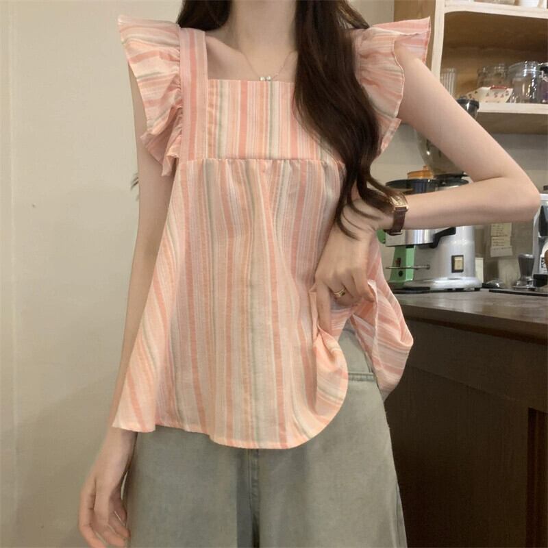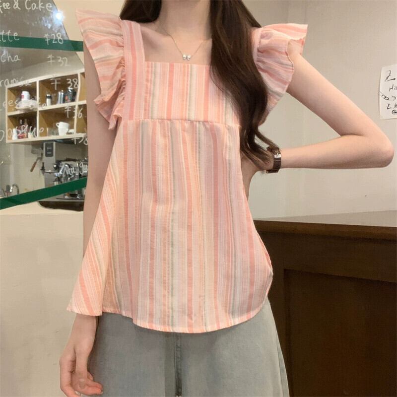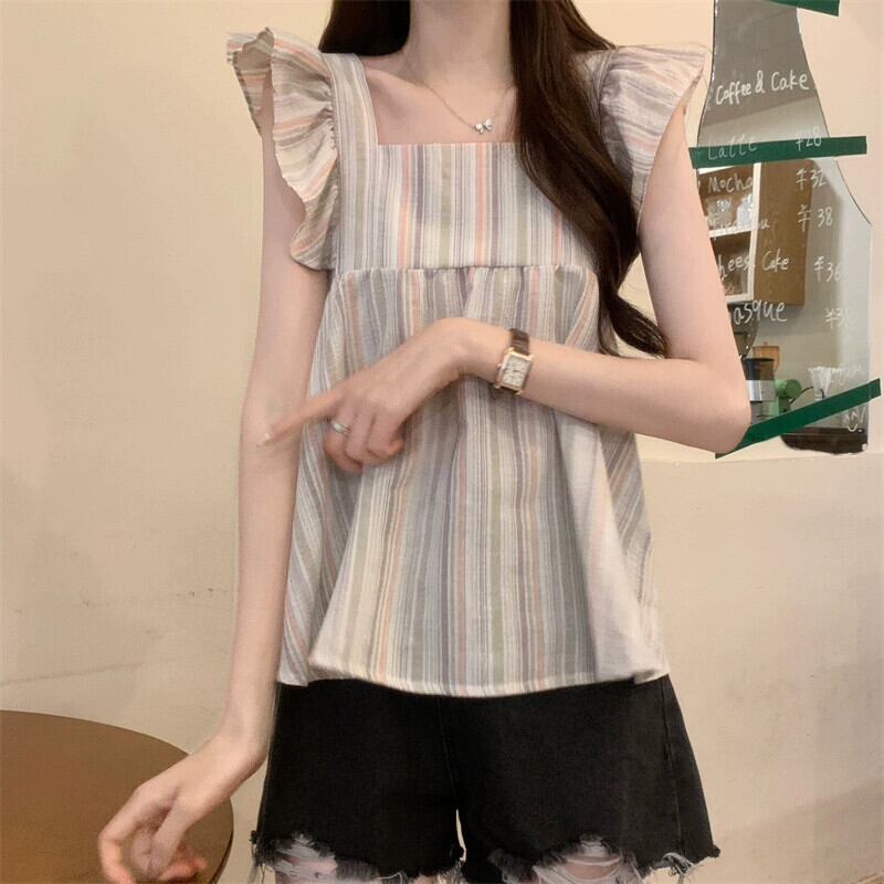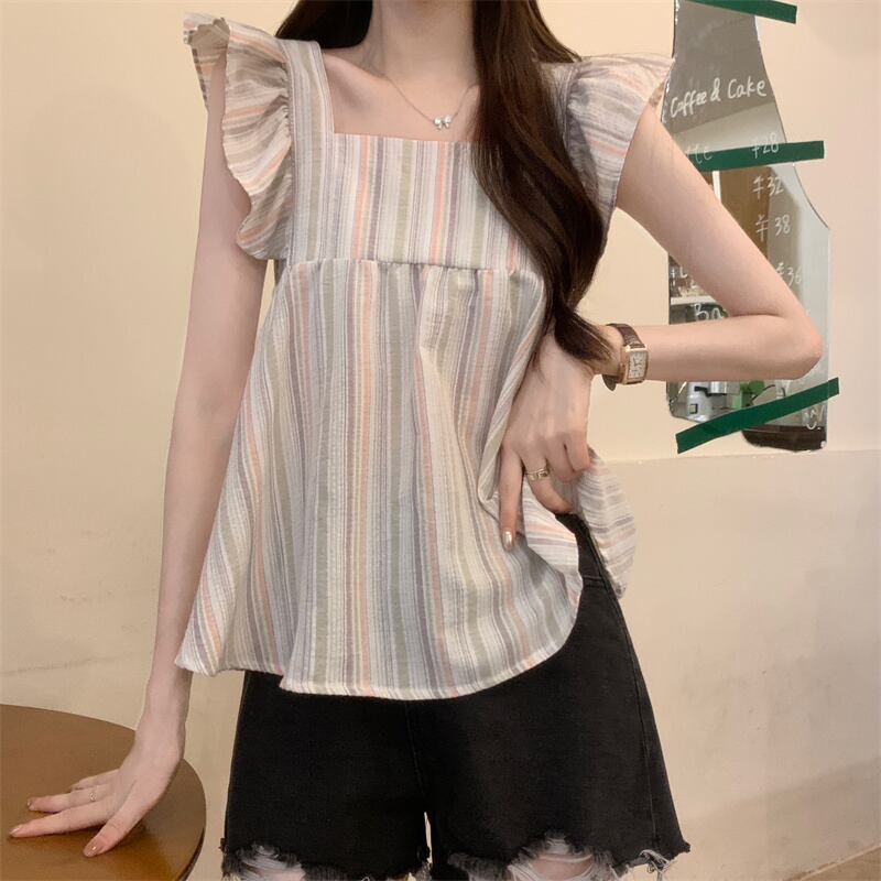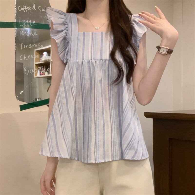 ゆったりブルーストライプキャミソールレディース夏デザインセンスアウターオープンバックちょう結びスクエアカラー小フライングスリーブトップ リボン サマー 夏物 スクウェア 746004443301419 | framboise21