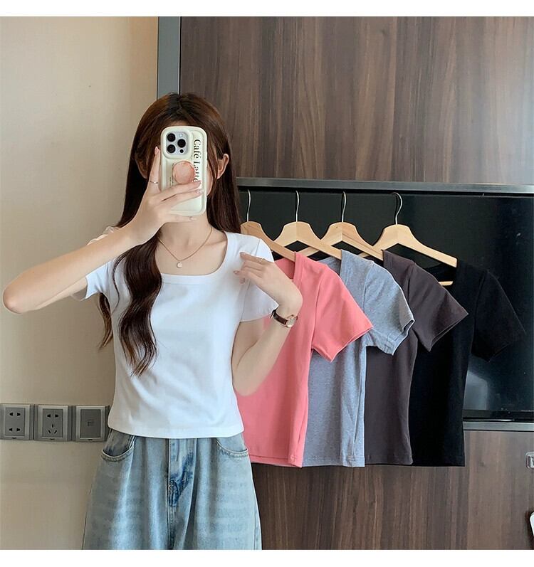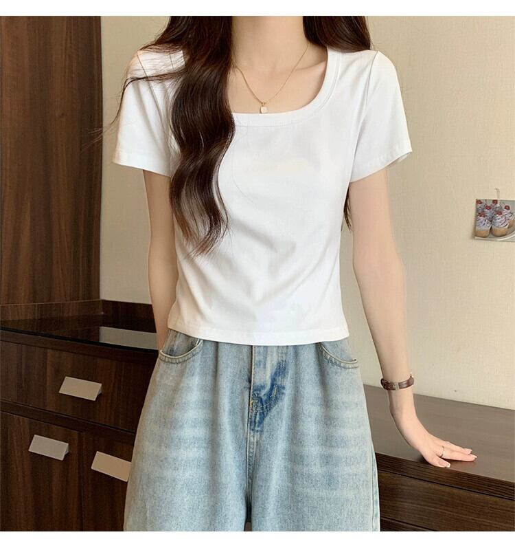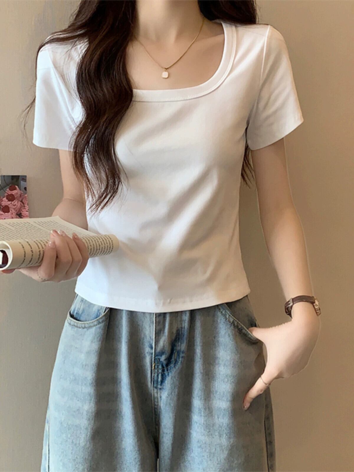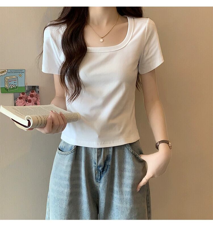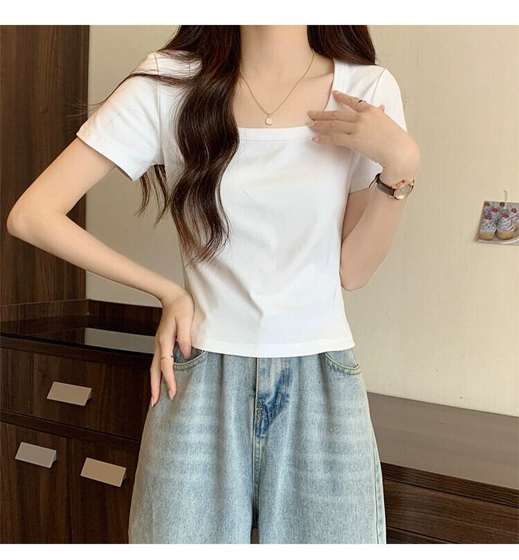 ホワイトコットン半袖Tシャツレディース2023年新作夏ニッチデザイン自己修養の感覚と薄いショートスクエアカラートップ サマー 夏物 スクウェア 7460059207642263 | framboise21