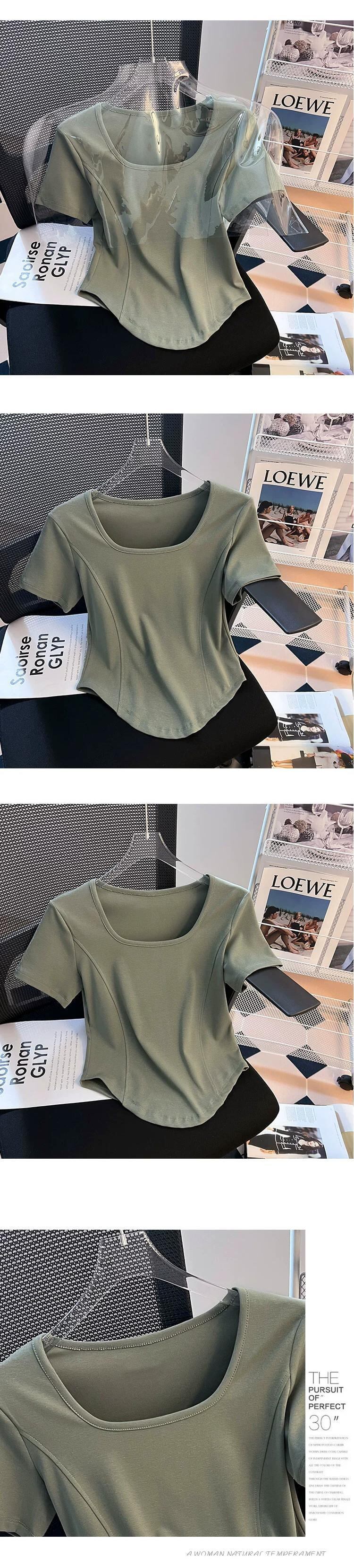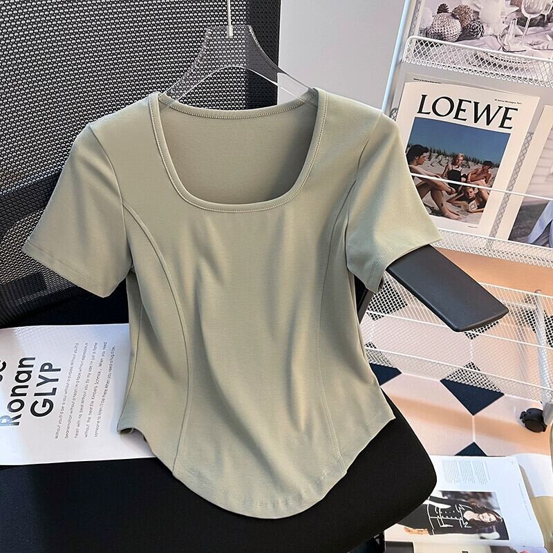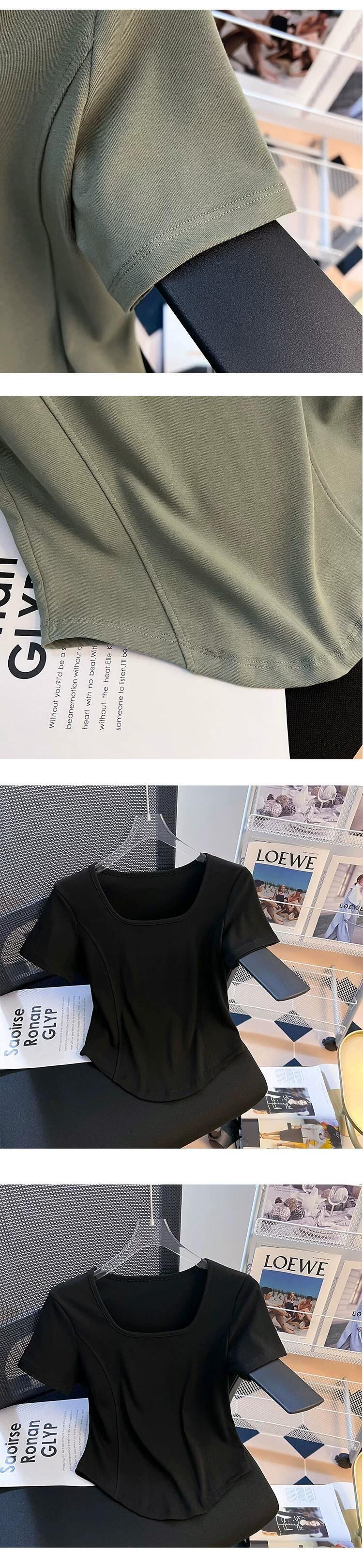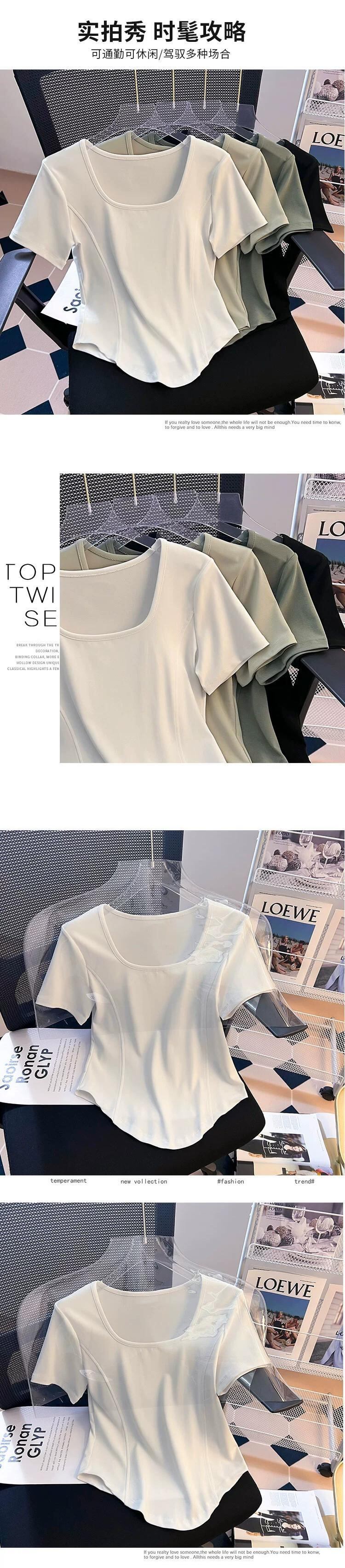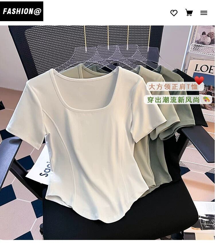 フロントショルダーピュアコットン半袖Tシャツレディース夏シックなデザインセンススリムフィットスリムスクエアカラーカーブヘムショートトップ サマー 夏物 スクウェア 7460011484855064 | framboise21